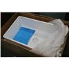New in box Vigo farmhouse sink, model VGRA 3618 CS, measures 30" long, 18" deep and 9 5/8" high and included drain and cutting board