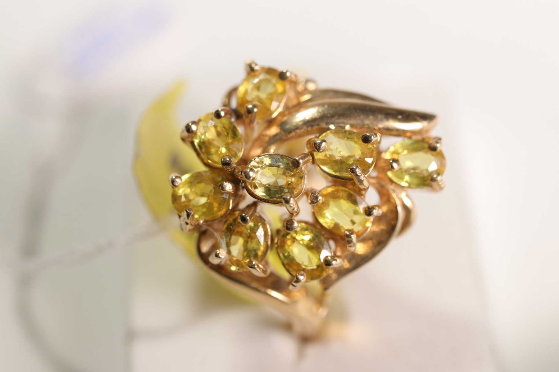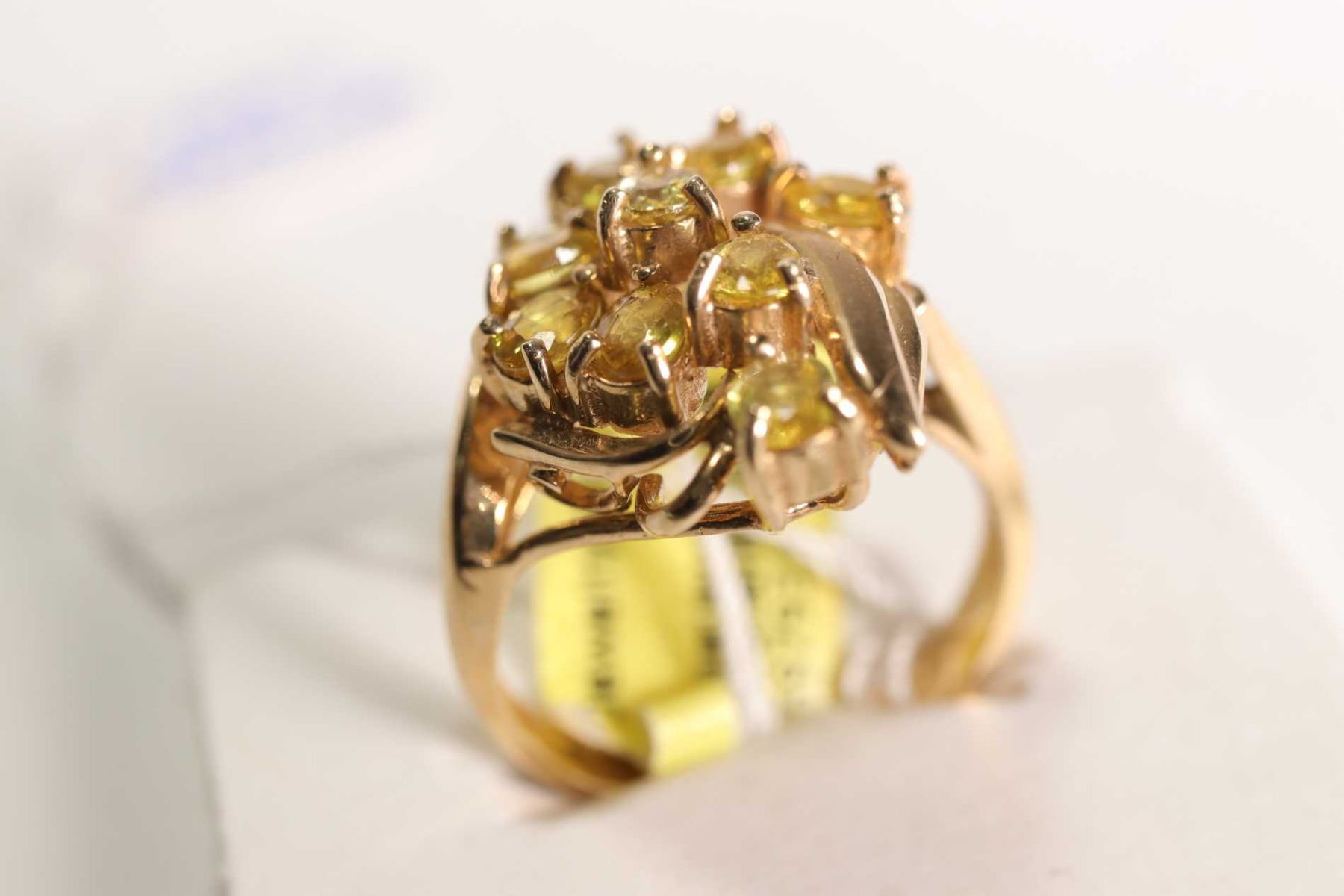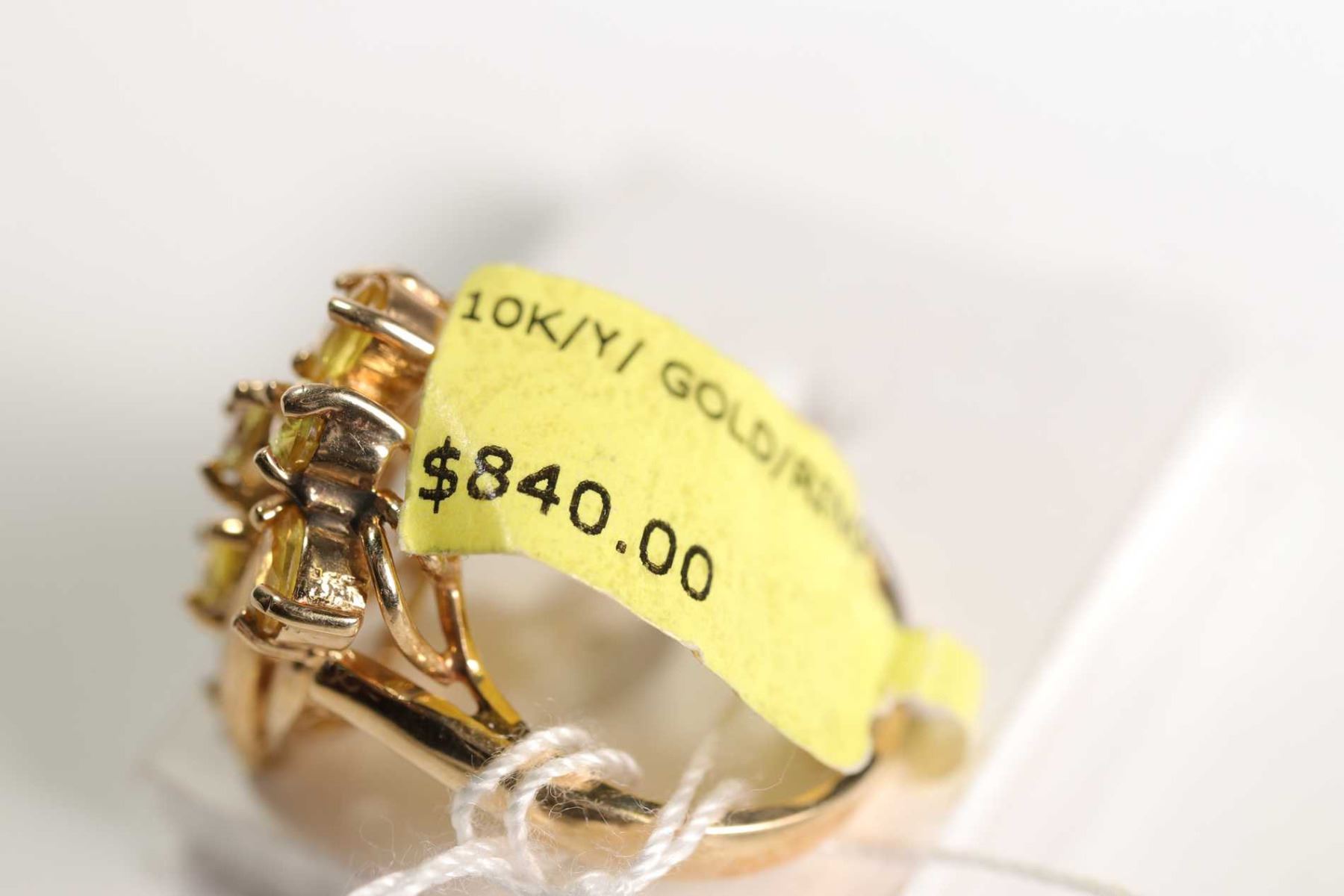 New old stock 10kt yellow gold and mixed cut yellow sapphire gemstone ring. Set with 1.62cts of mixed oval cut yellow sapphires