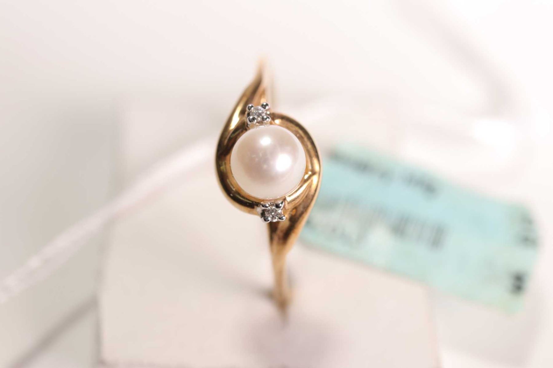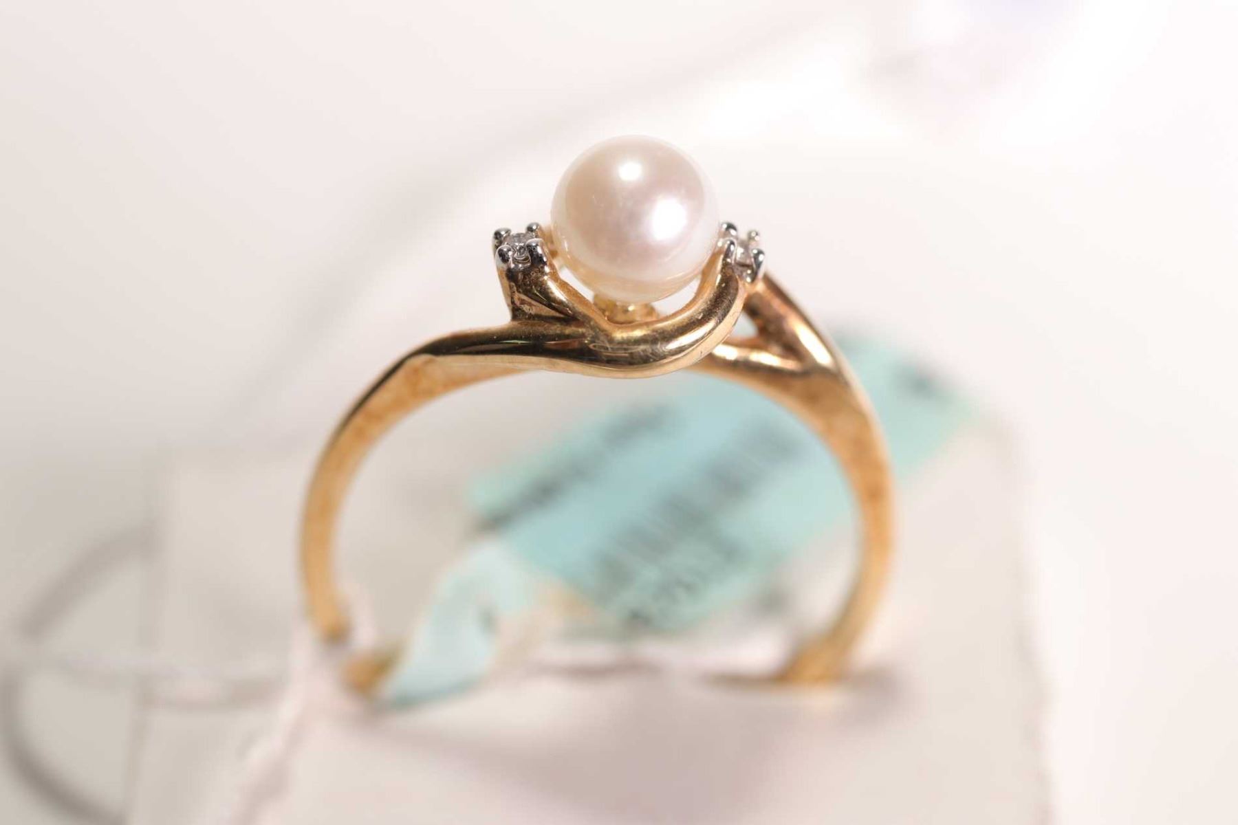 New old stock 10kt yellow gold, pearl and diamond ring