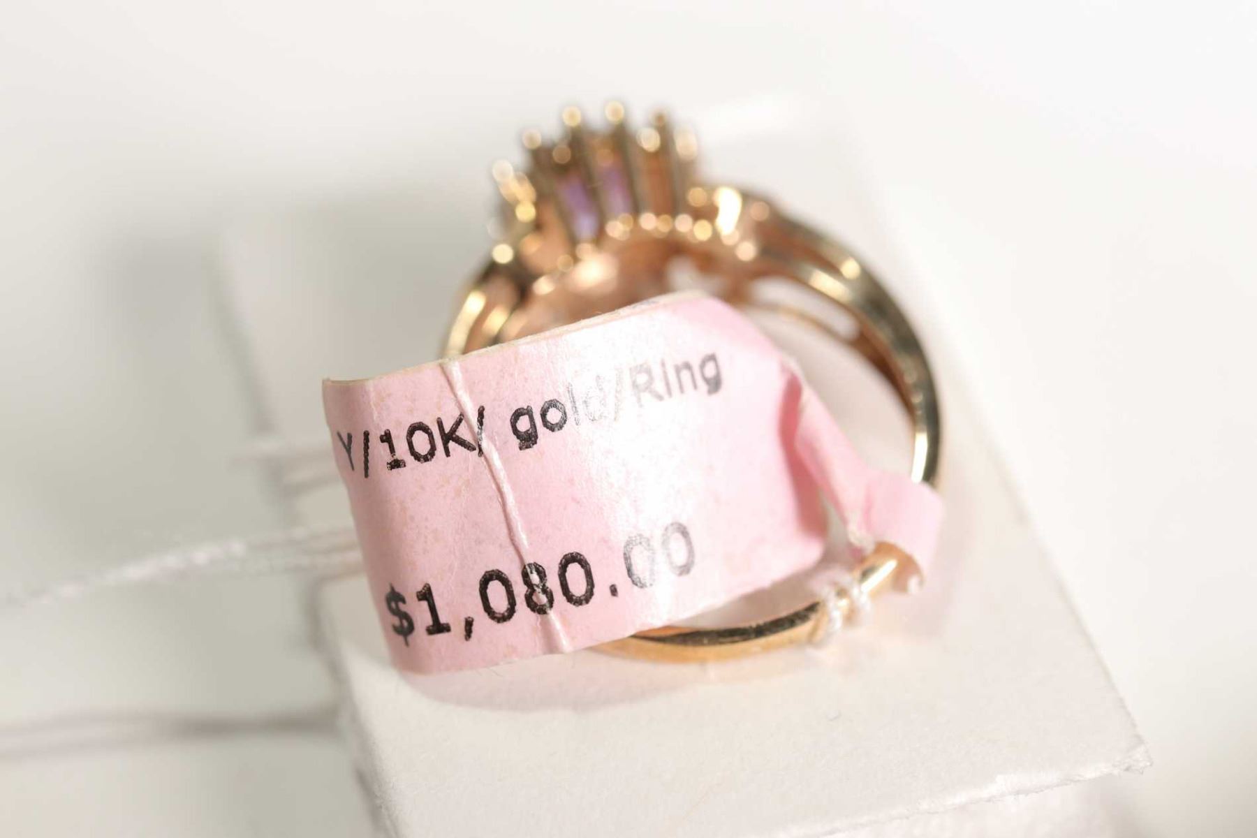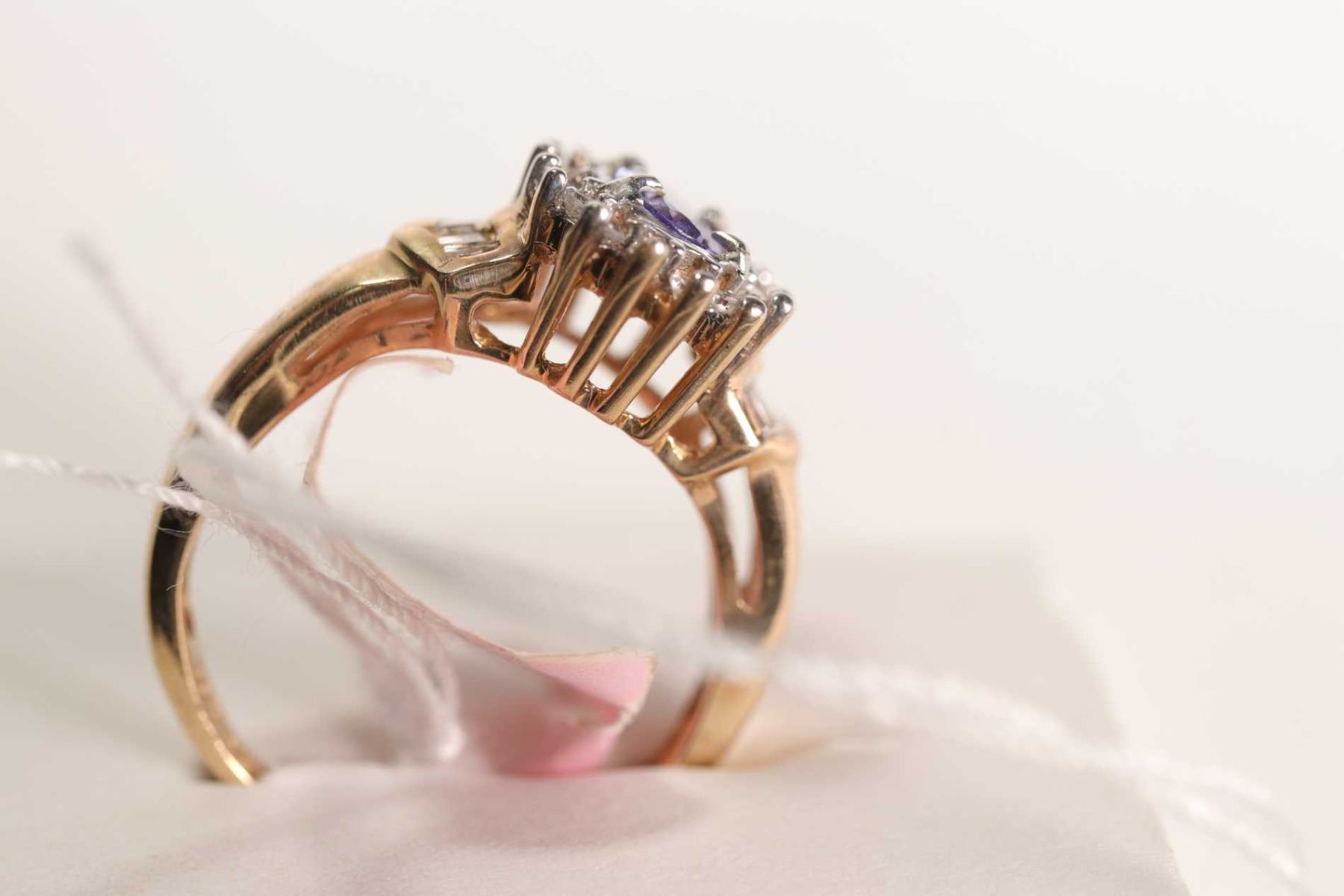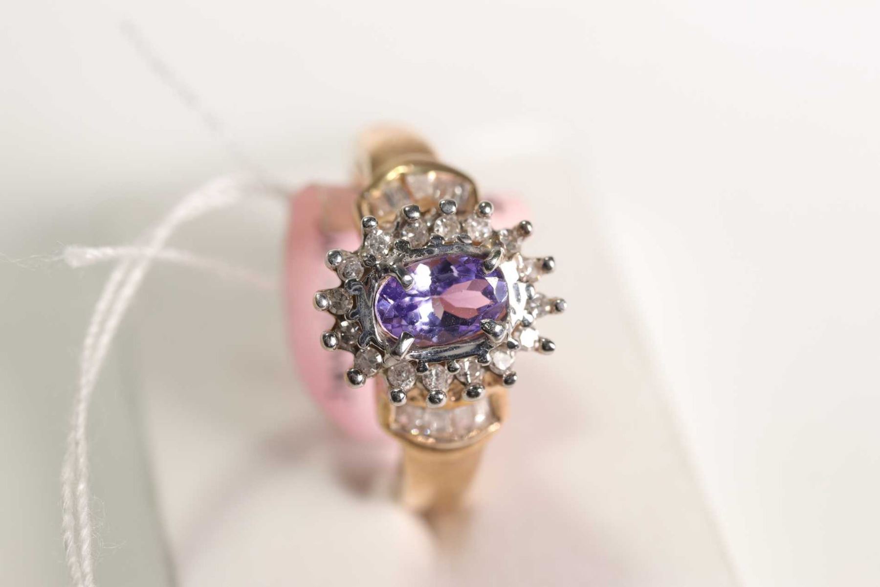 New old stock 10kt yellow gold, tanzanite and diamond ring. Set with .40ct oval cut tanzanite gemstone and .26ct of baguette and round cut white diamonds