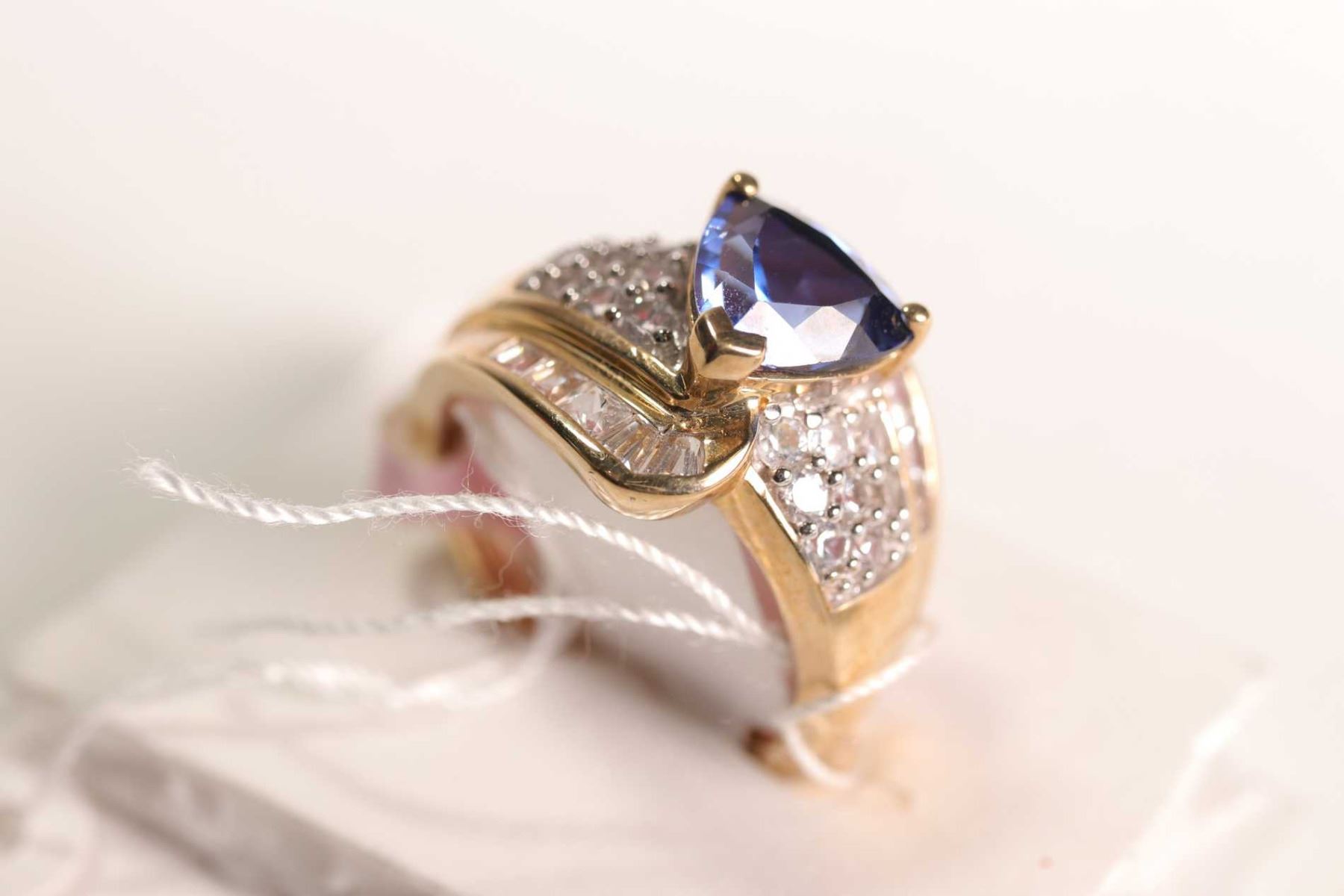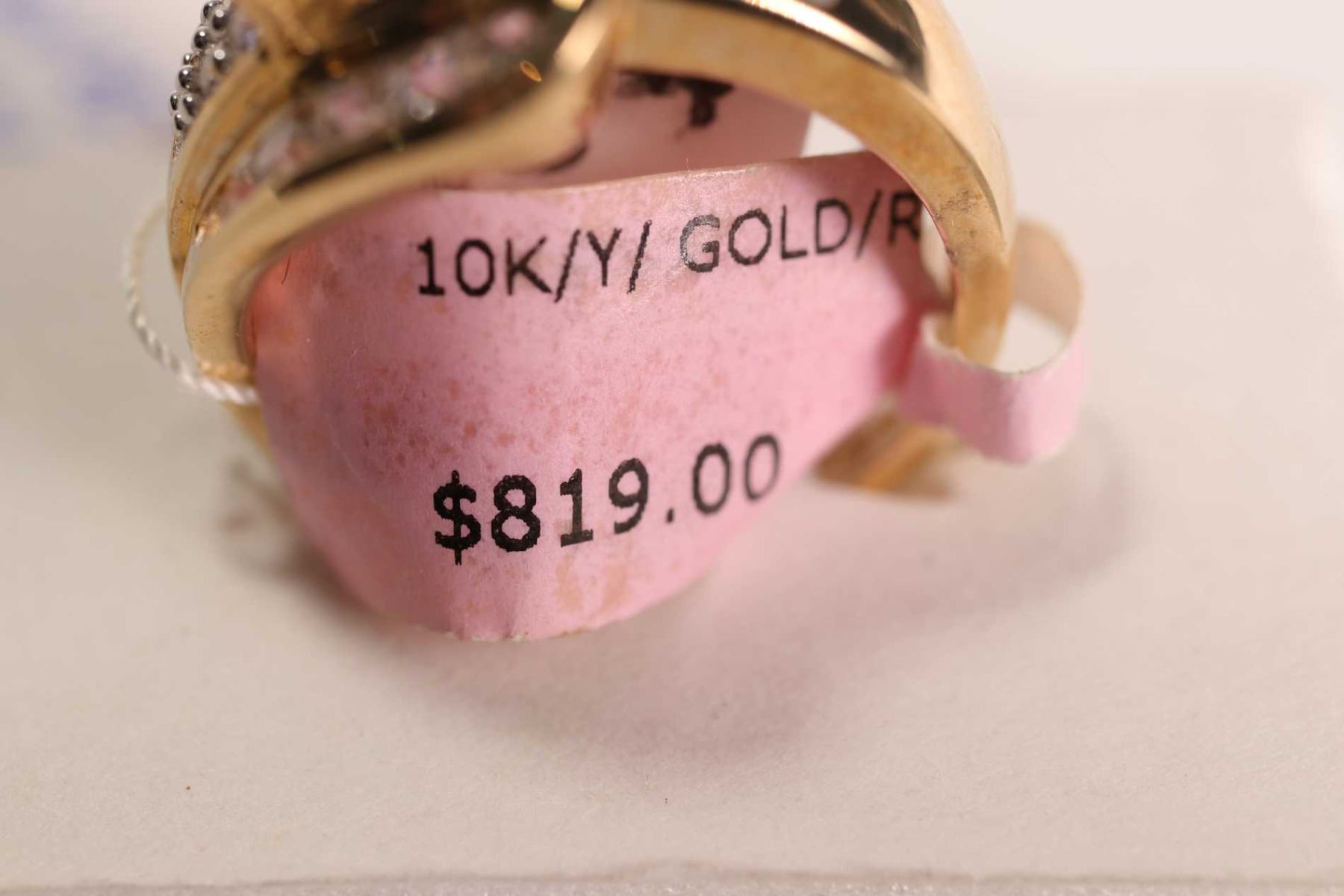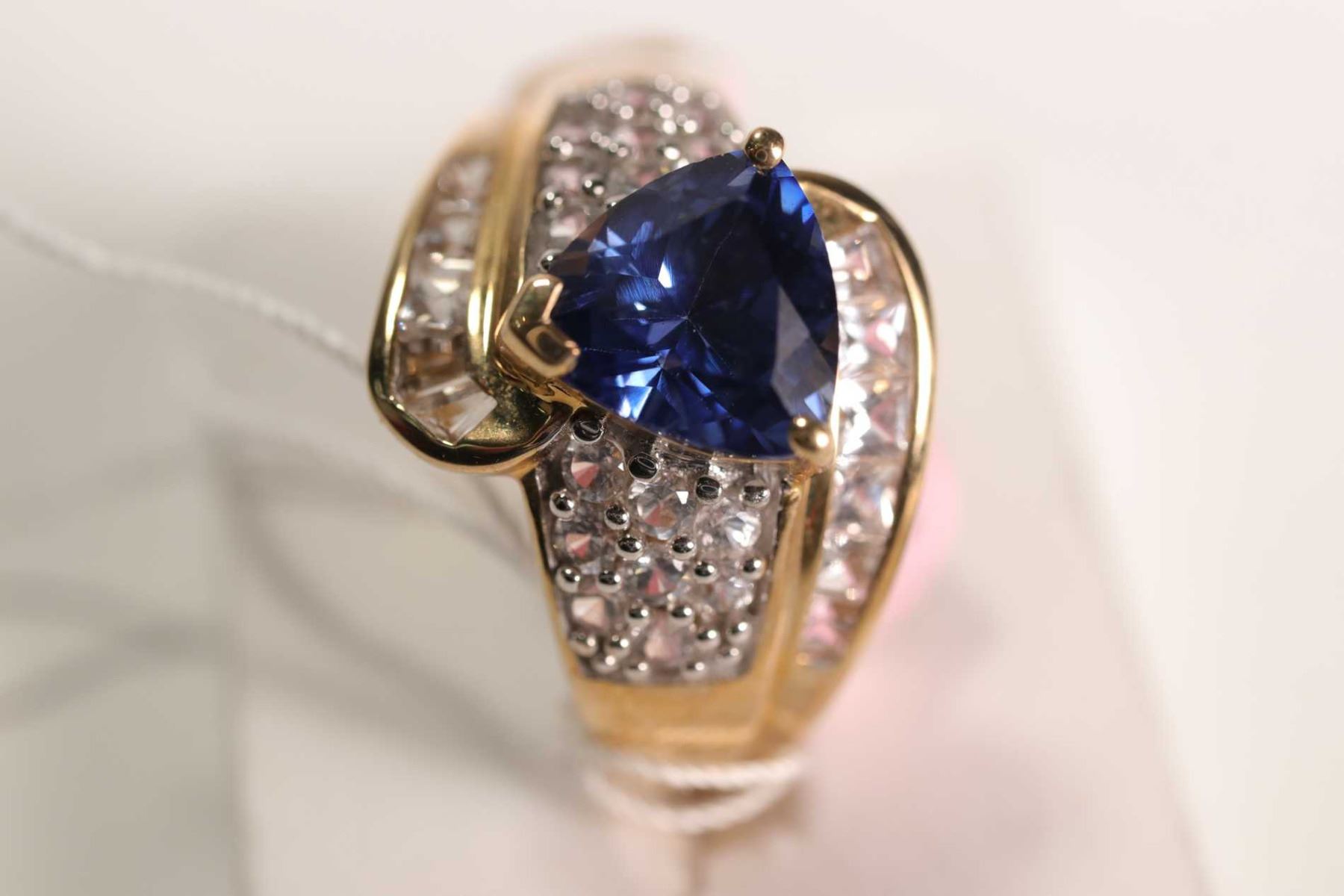 New old stock 10kt yellow lab created blue sapphire and white sapphire gemstone ring.