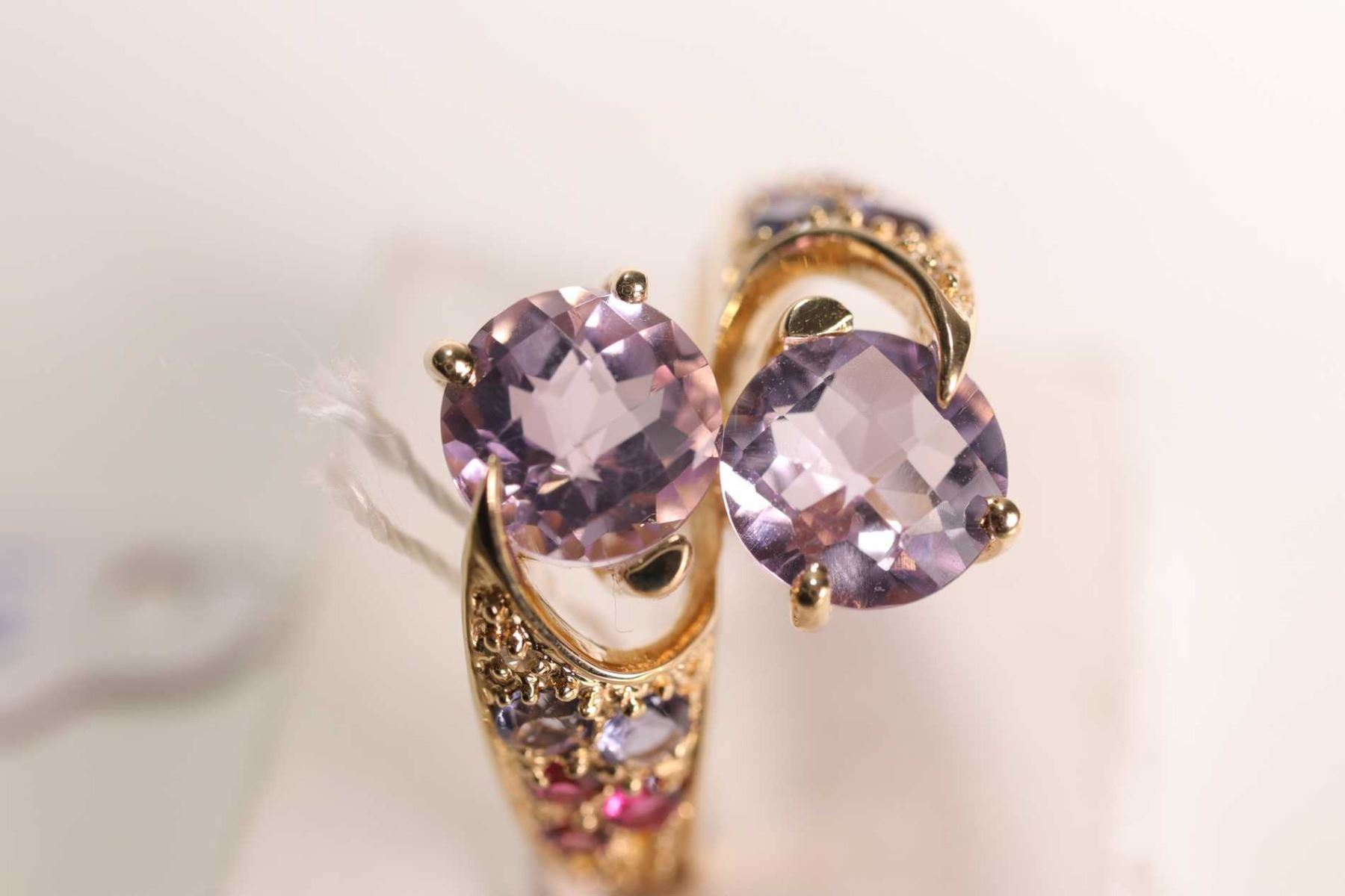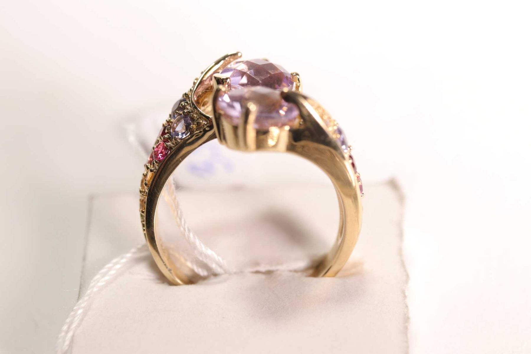 New old stock 14kt yellow gold, amethyst, tourmaline, tourmaline, citrine and diamond gemstone ring. Set with two round checkerboard cut amethyst, four tanzanite gemstones, six pink tourmalines, six citrines and two accent diamonds