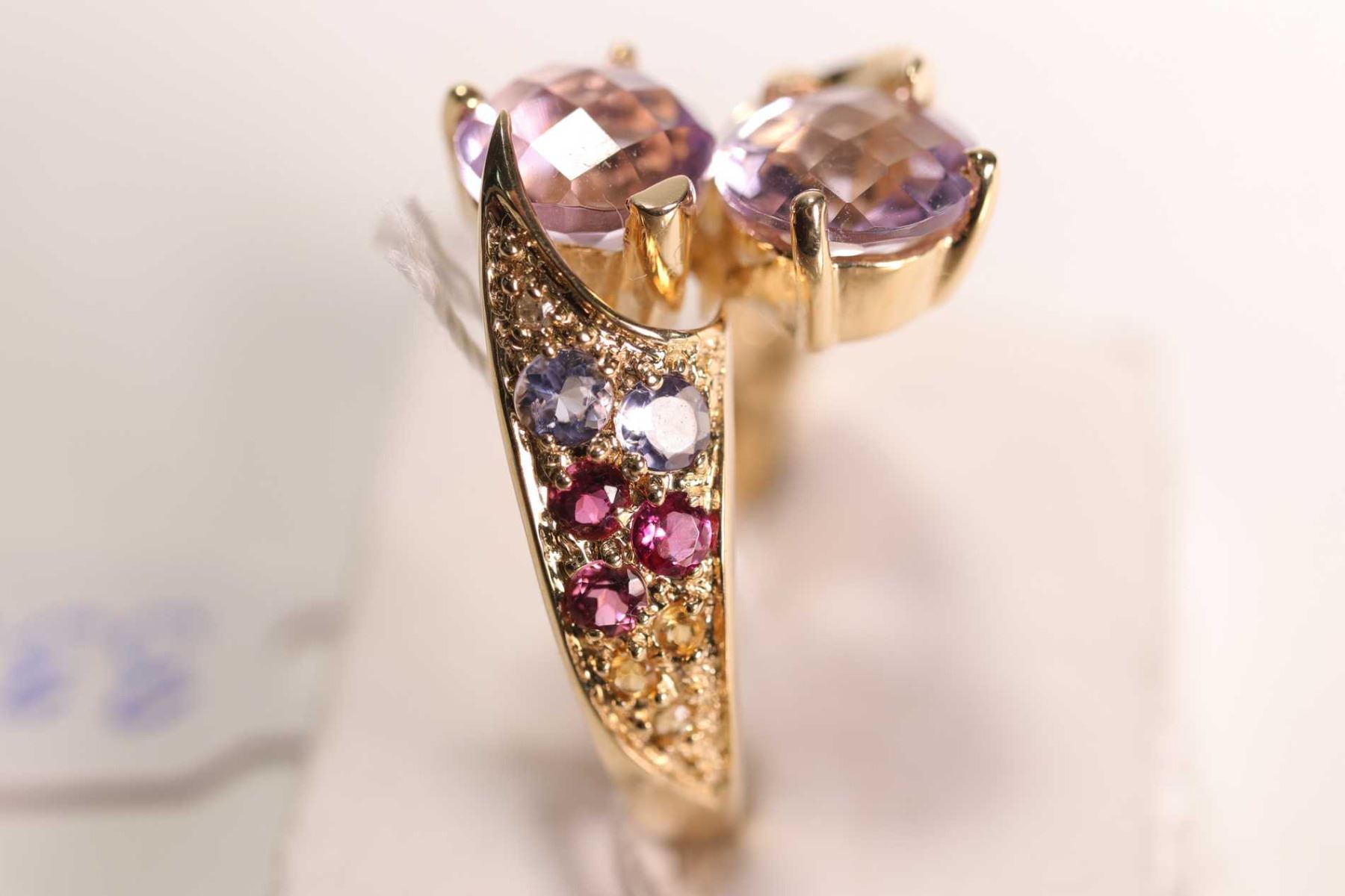 New old stock 14kt yellow gold, amethyst, tourmaline, tourmaline, citrine and diamond gemstone ring.