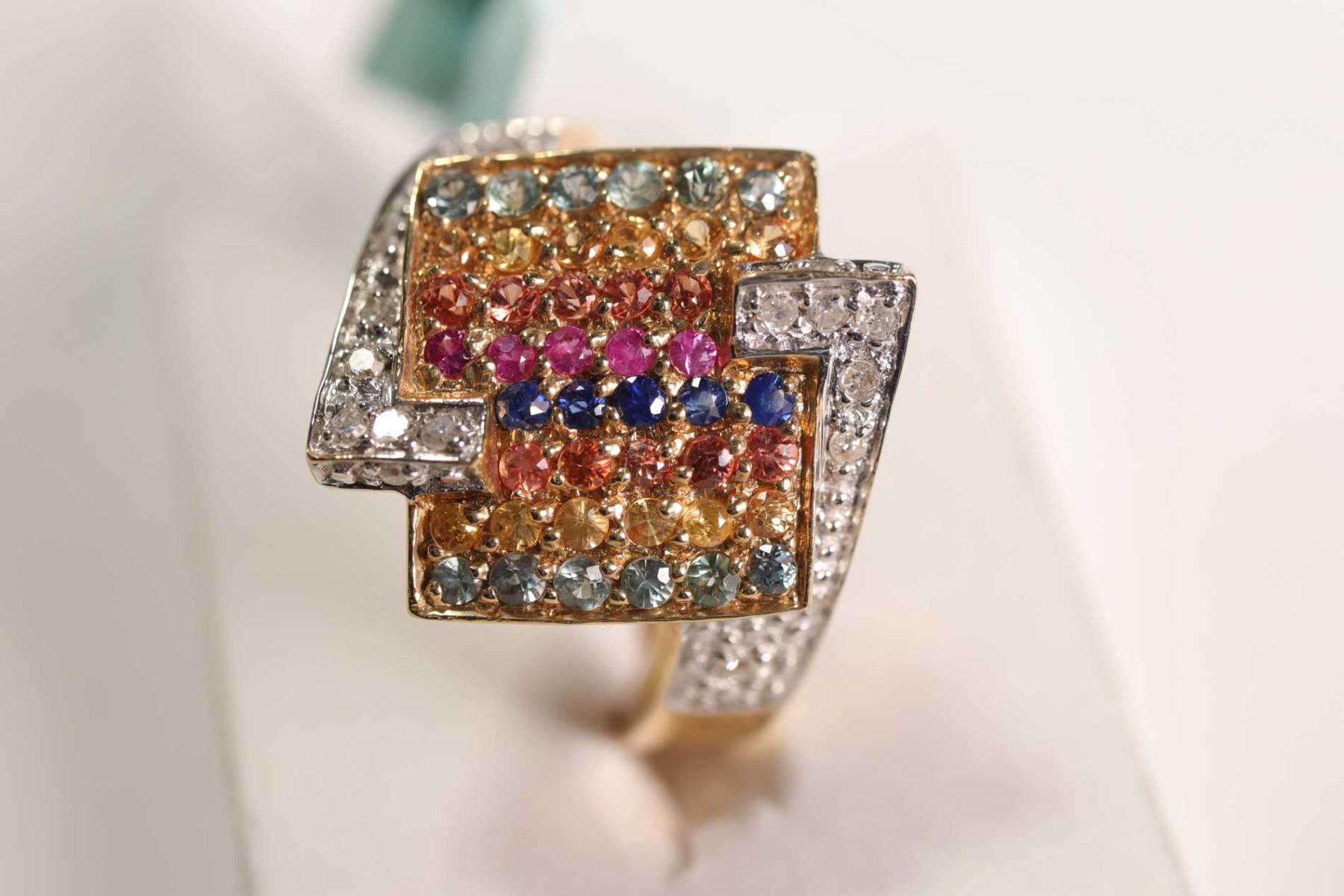 New old stock 14kt yellow gold and multi coloured sapphire gemstone and diamond ring. Set with forty-four round mixed cut multi-coloured sapphires and .11cts of round cut white diamonds