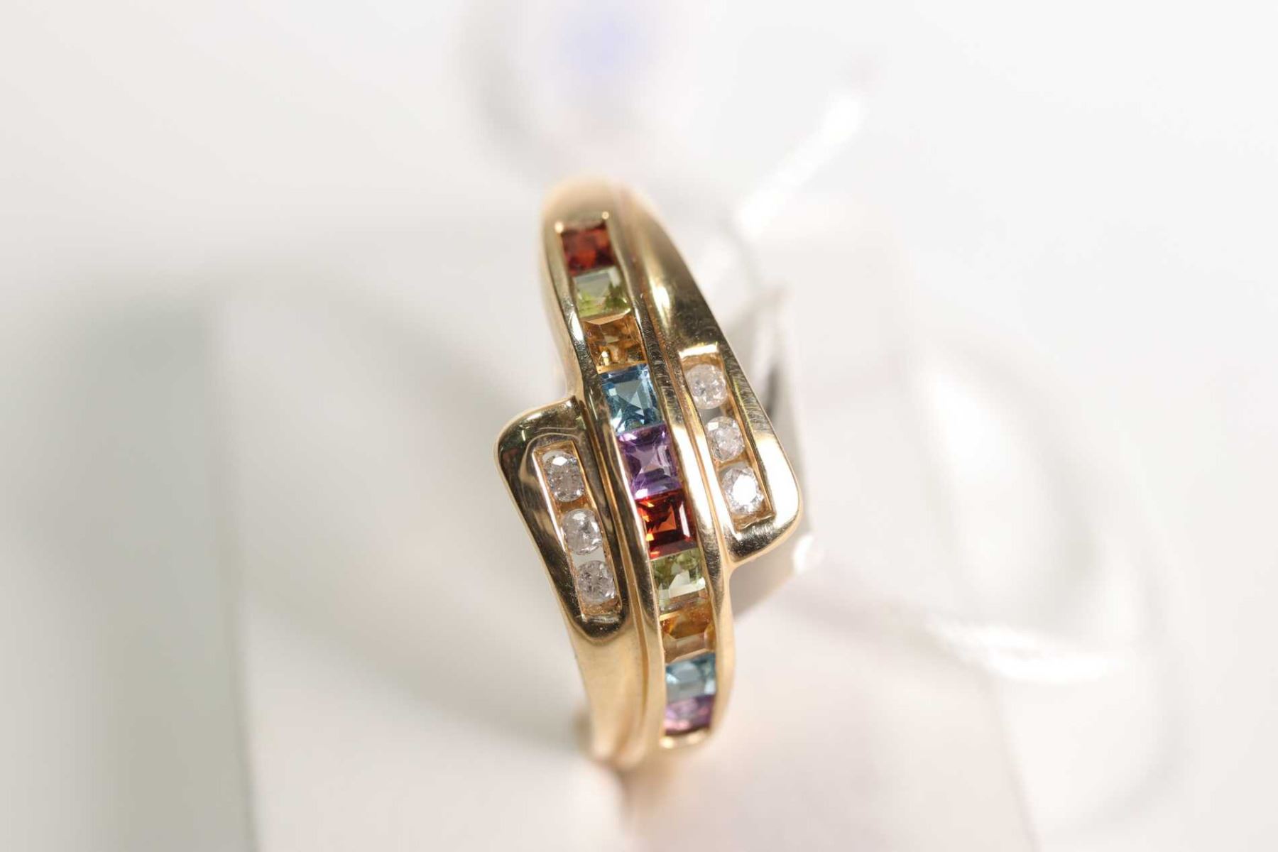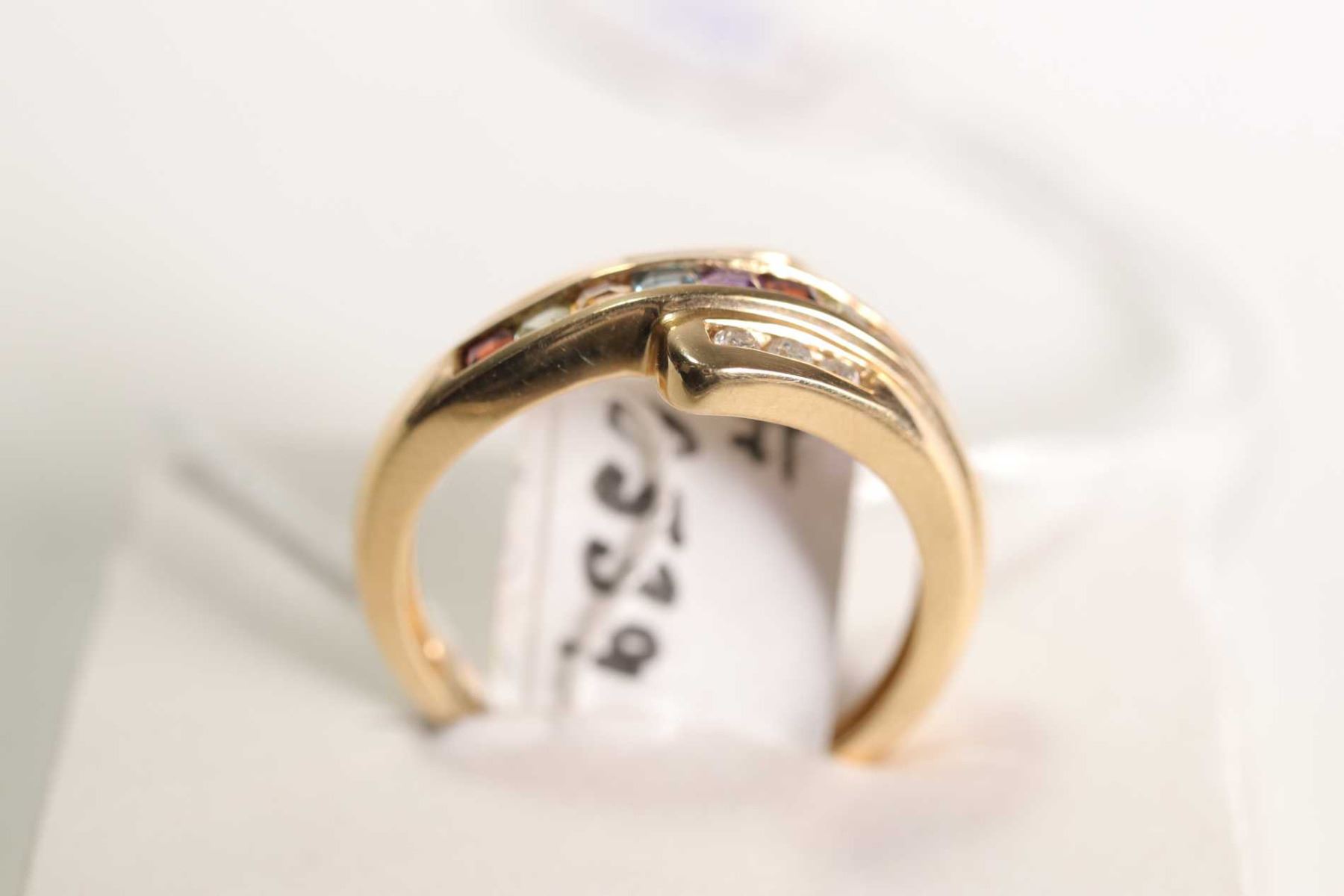 New old stock 14kt yellow gold, multi-coloured sapphire gemstone and diamond ring