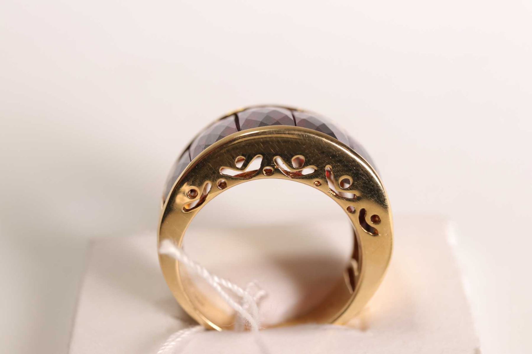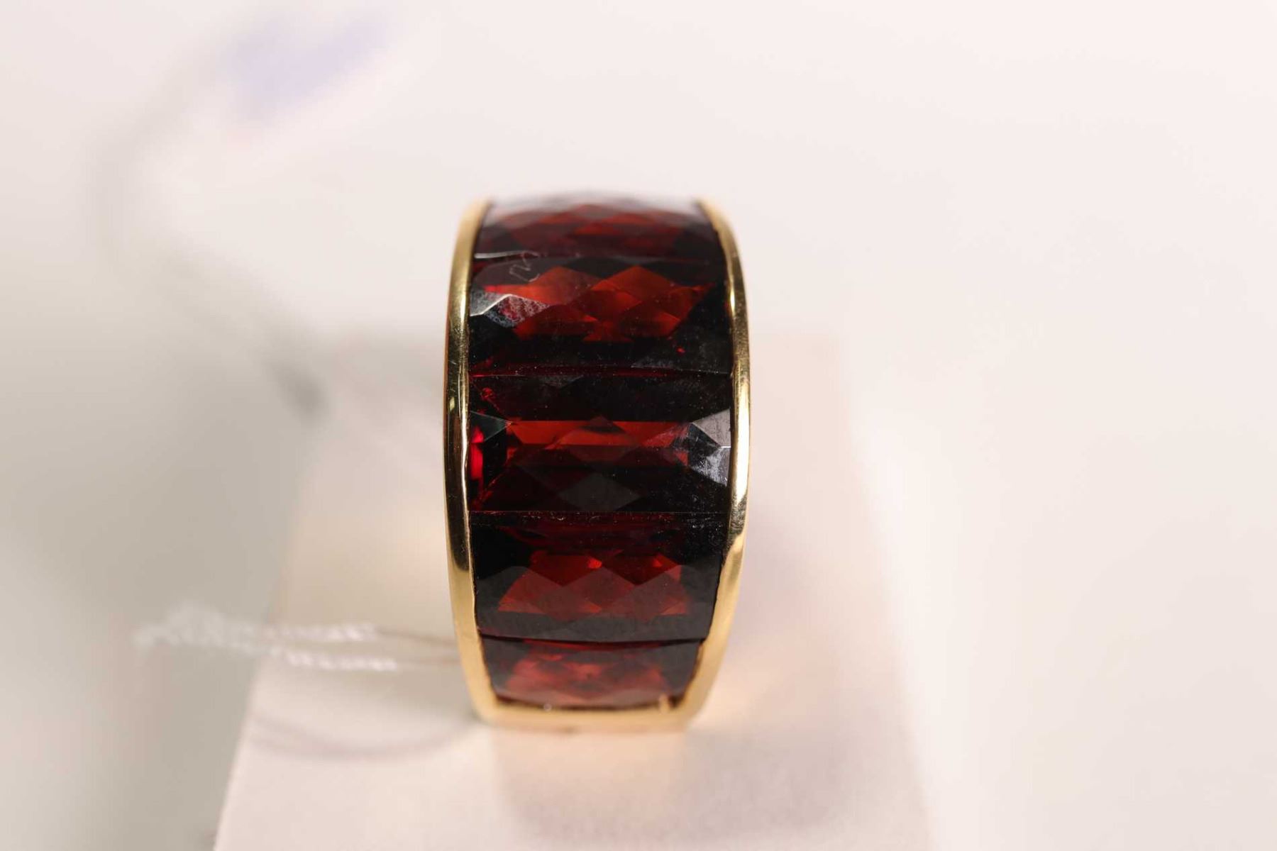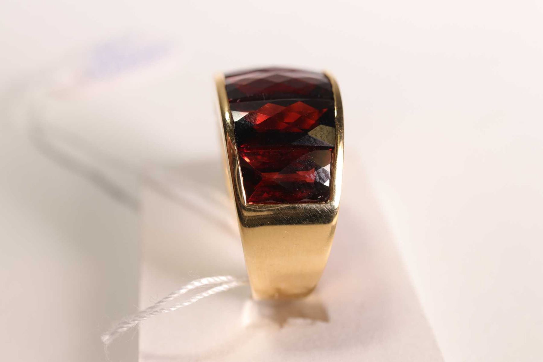 New old stock 18kt yellow gold and garnet gemstone ring. Set with cushion cut channel set garnet ring