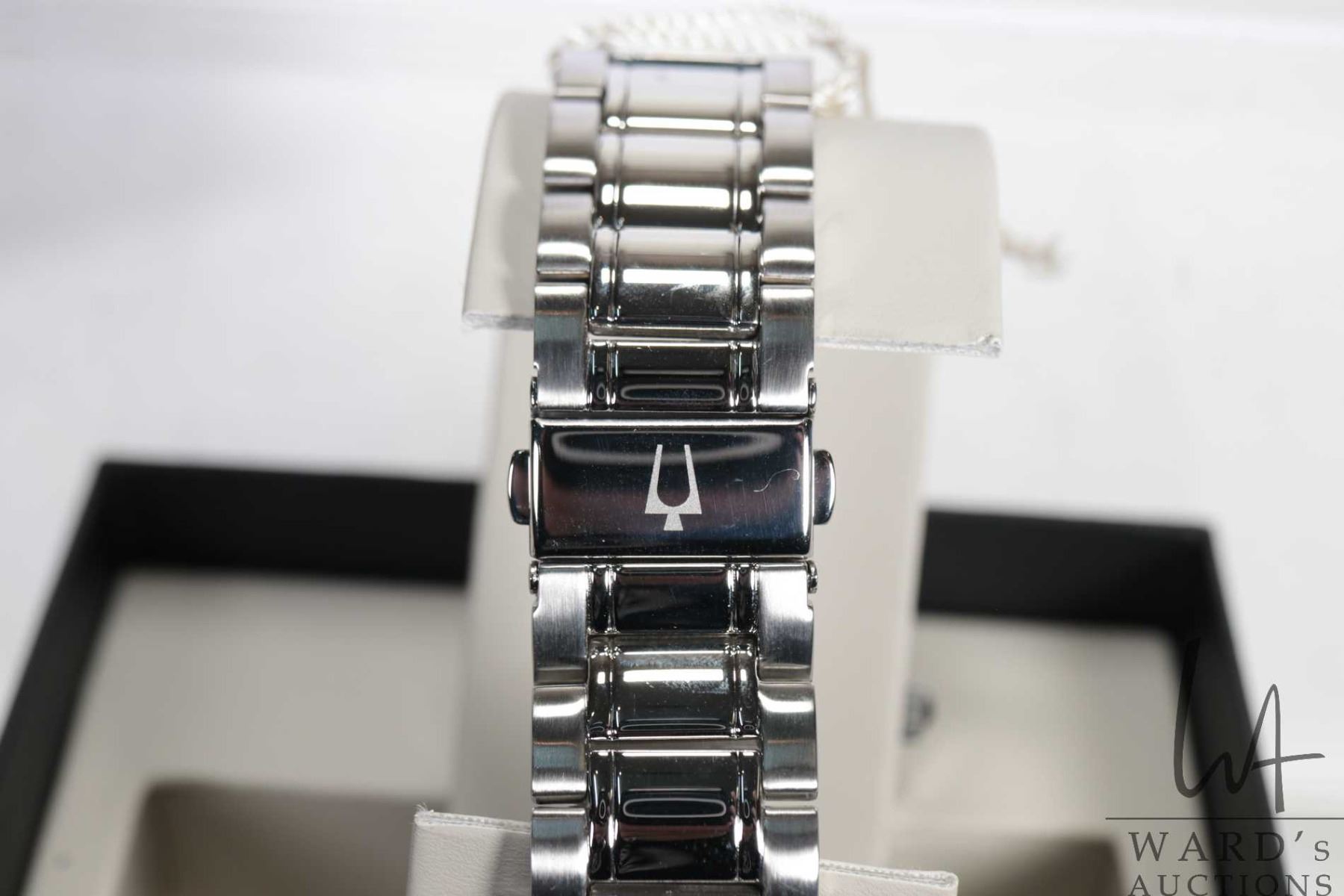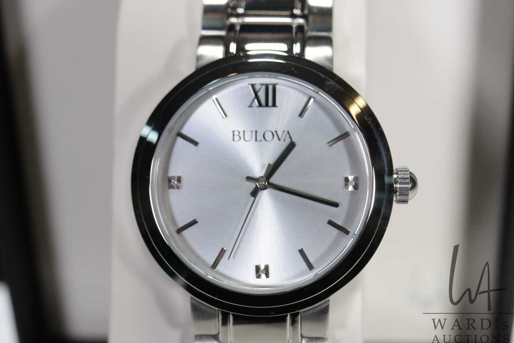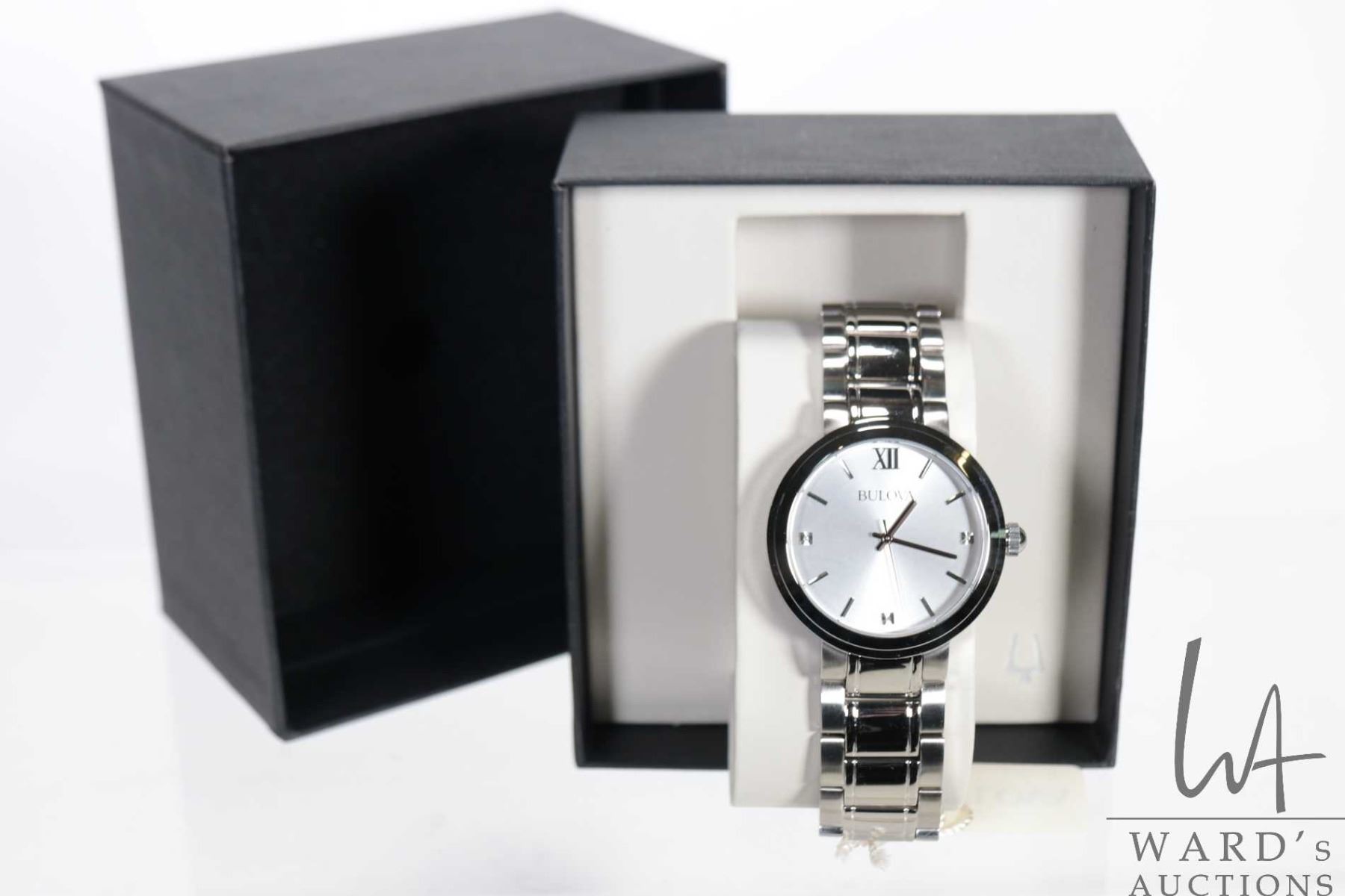 New/ old stock Gent's Bulova wrist watch with brushed silver dial and polished Roman and jewel like numeral. Has second sweep. Brushed and polished case and bracelet. Quartz movement with brand new battery, working at time of cataloguing. Includes original presentation box and manual