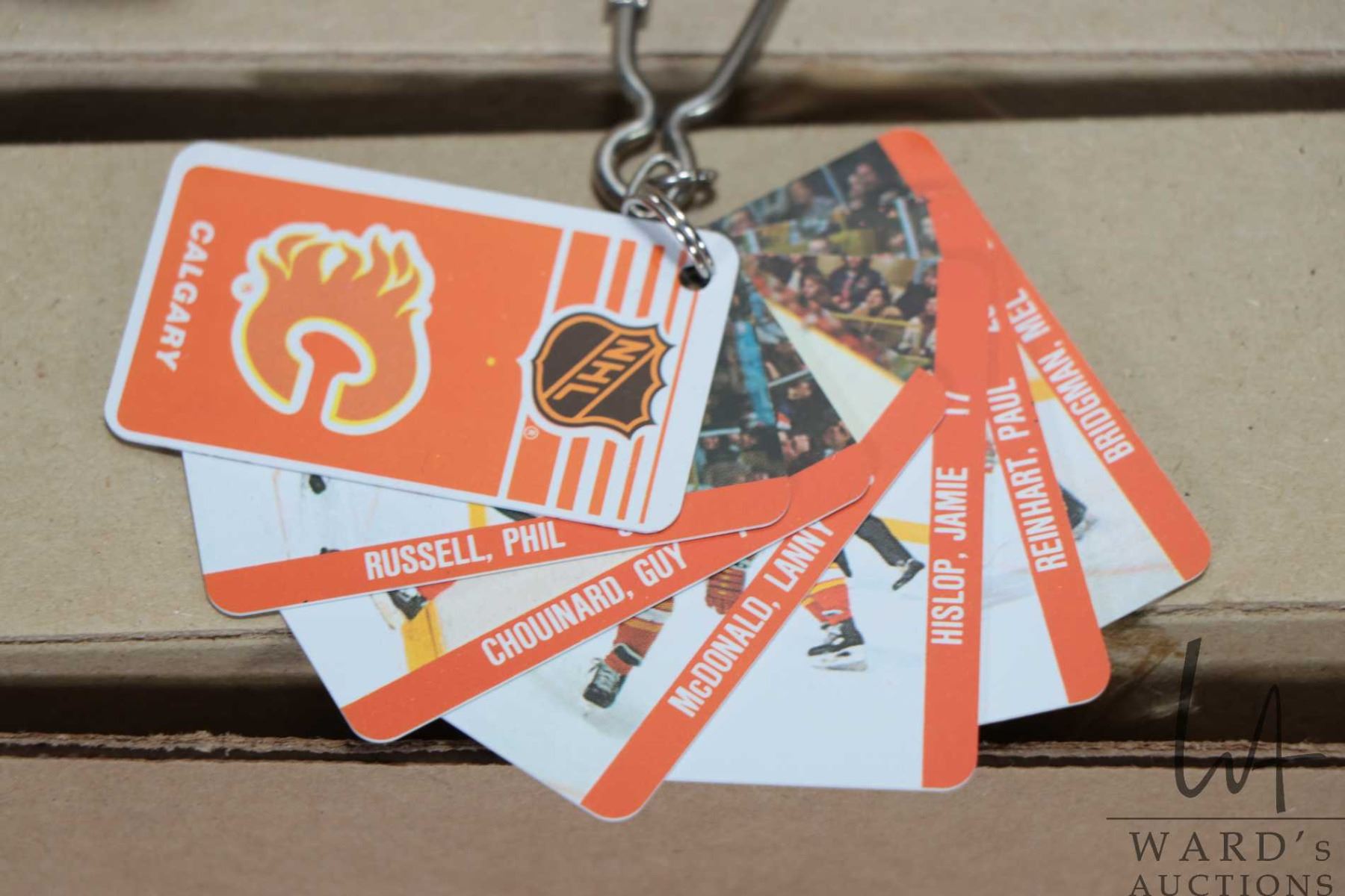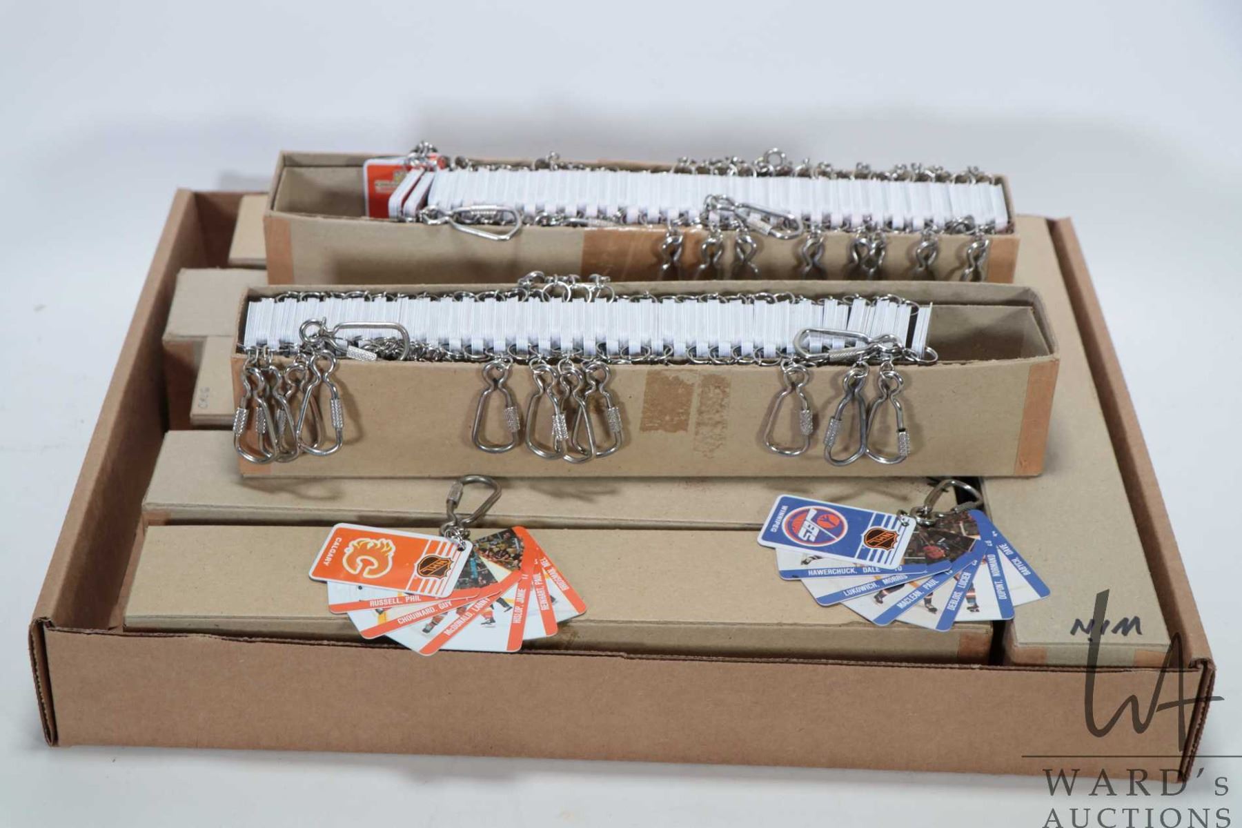 New old stock NHL (NHLPA) key chains circa 1983 including four package of 60 Winnipeg Jets and four packages of 60 Calgary Flames, 480 key chains in total
