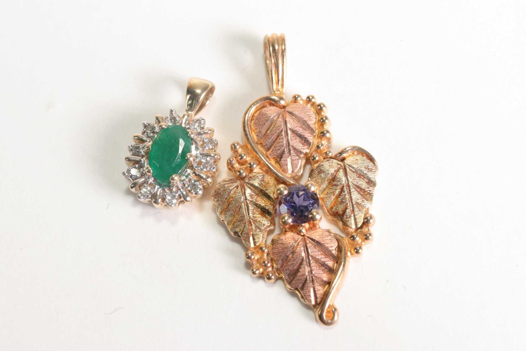 New old stock gold pendants including 10kt tri- gold pendant set with blue gemstone and a 10kt yellow gold pendant set with oval cut emerald and genuine diamond gemstones