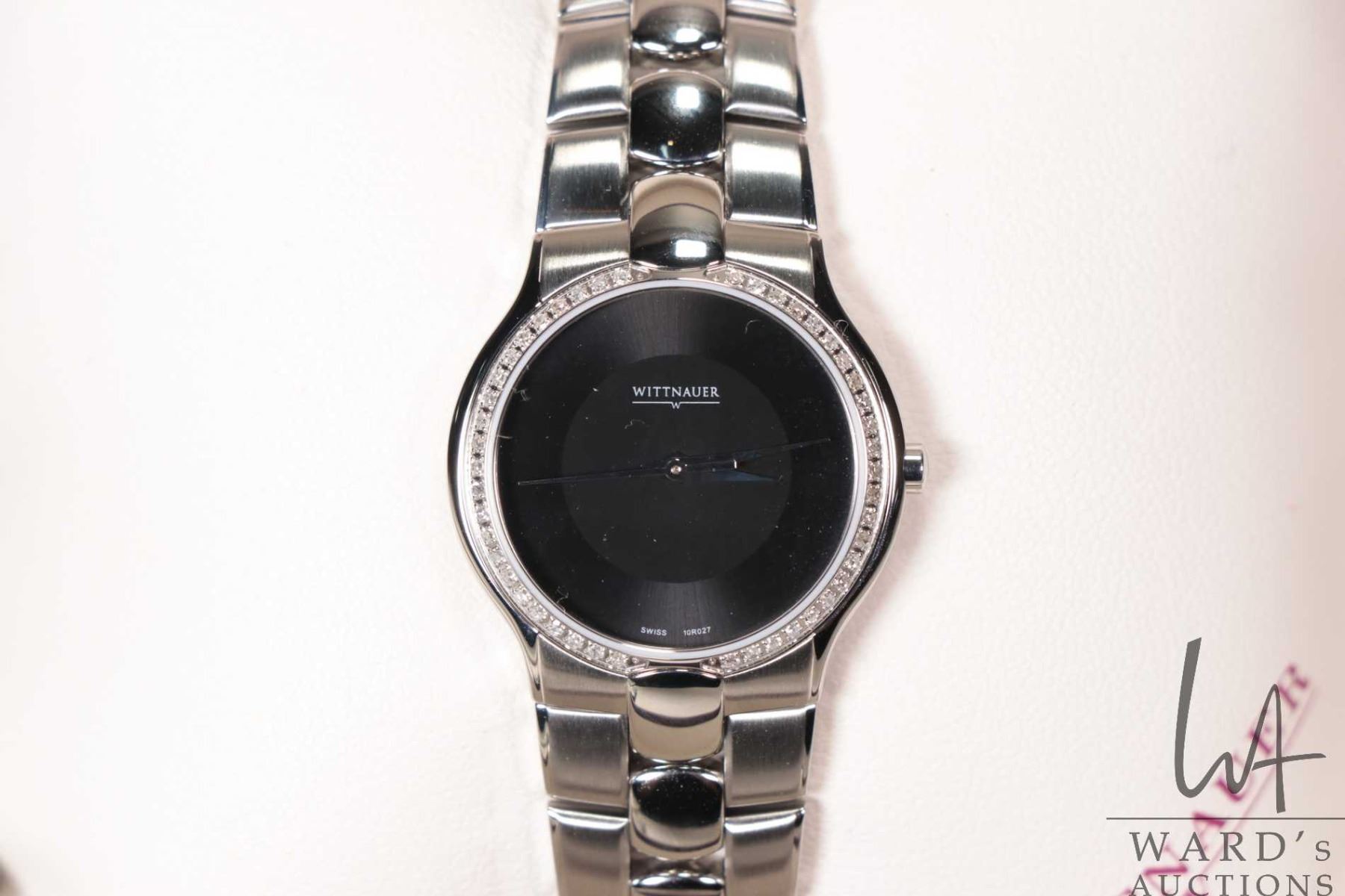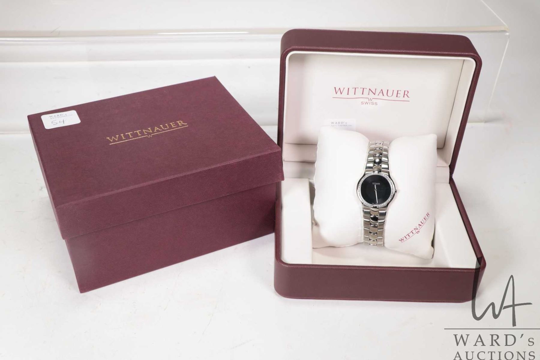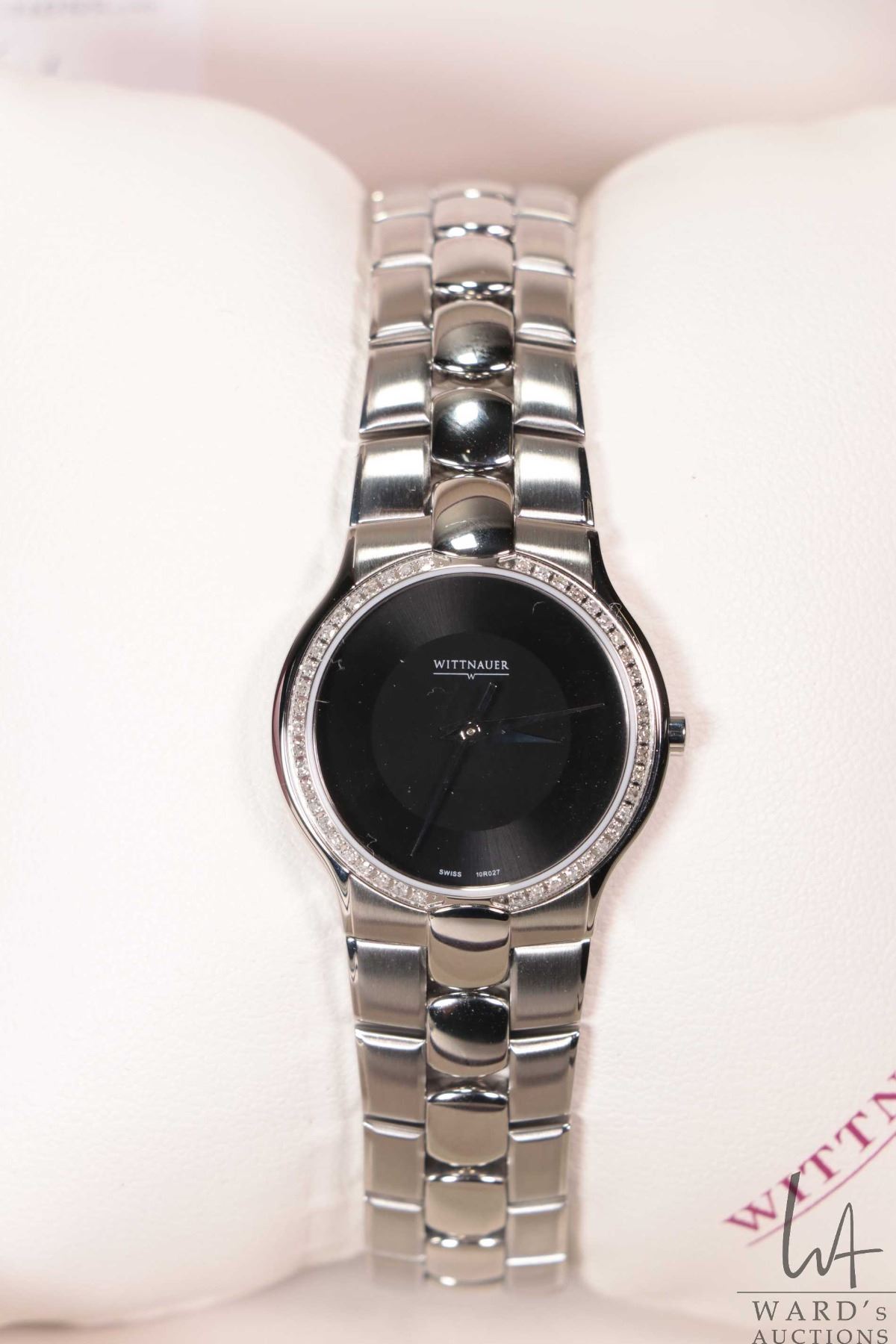New/ old stock ladies Wittnauer Biltmore 46 genuine diamond bezel watch model10R027, new battery and working at time of cataloguing, includes original case and box
