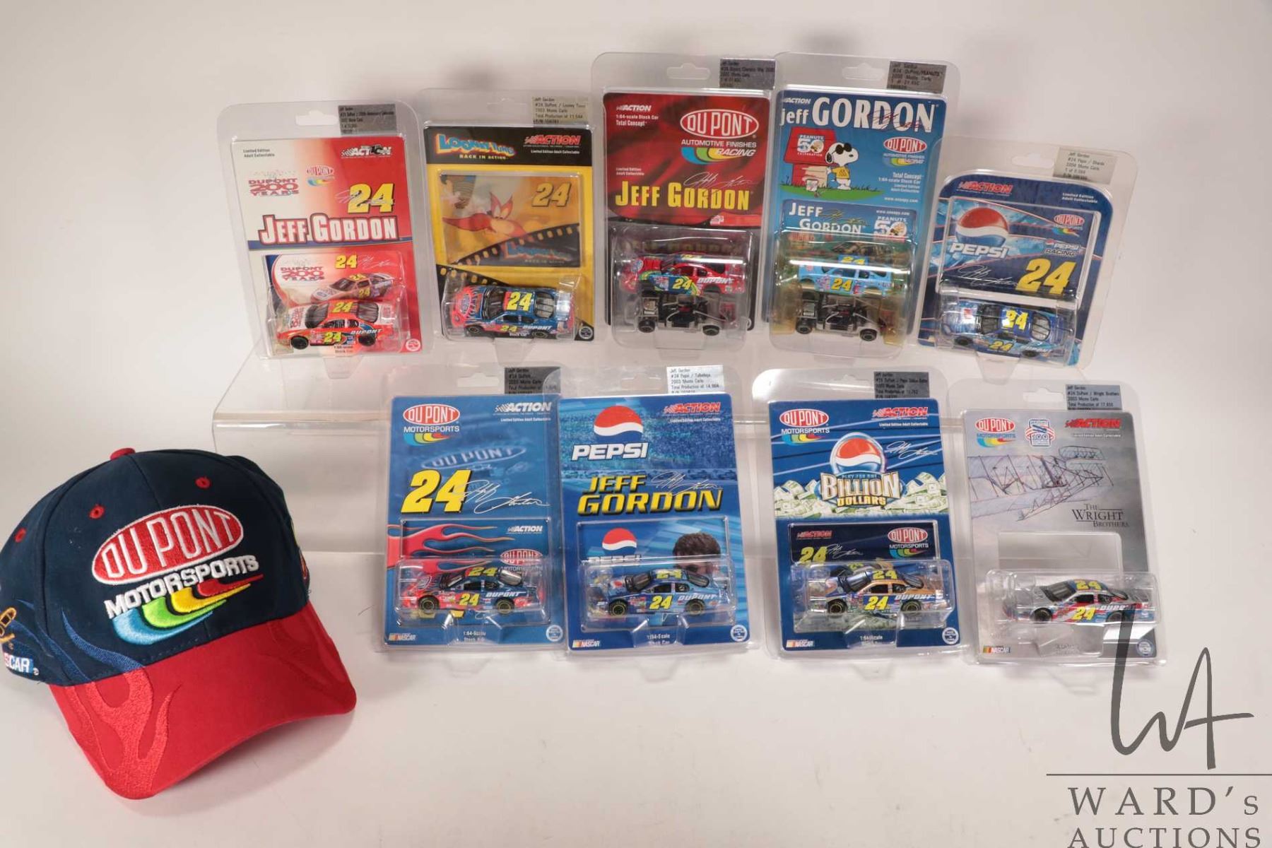 Nine 1: 64 scale die cast collectible Jeff Gordon race cars 2000-2004 and a Du Pont Motorsport ball cap