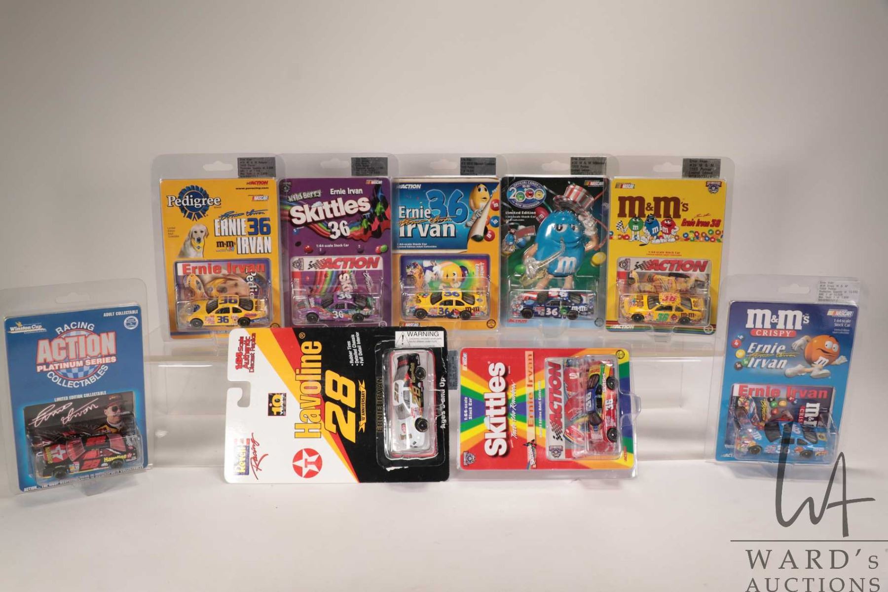 Nine Ernie Ervan limited edition Action 1: 64 scale die cast cars including M & M''s, havoline, Winston Cups, Skittles, Pedigree etc.