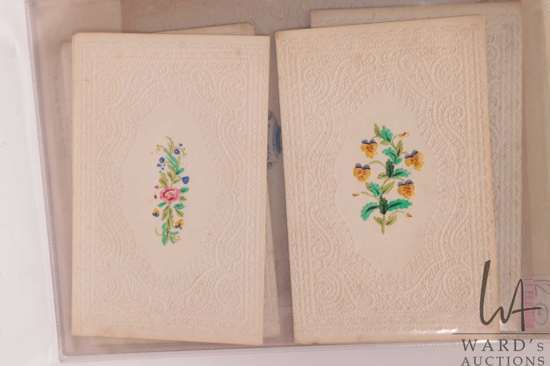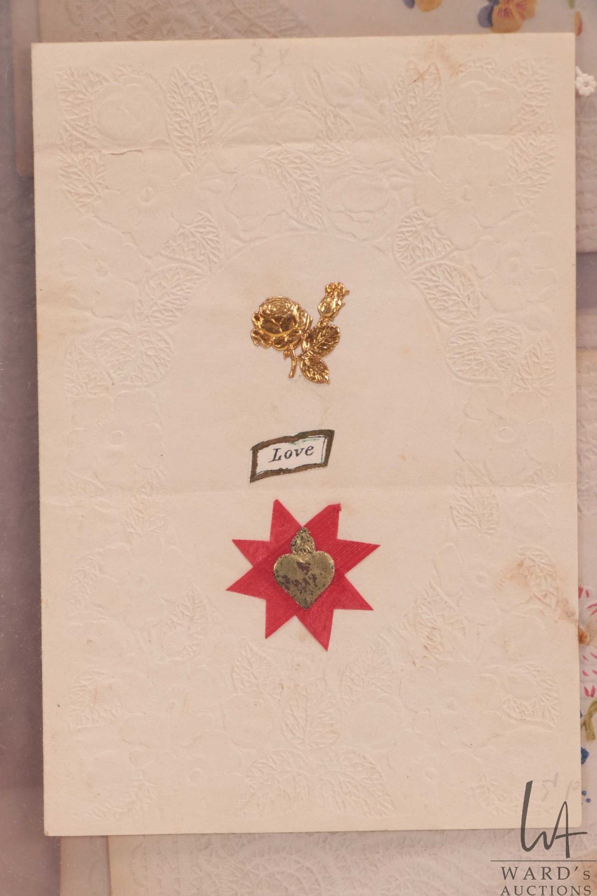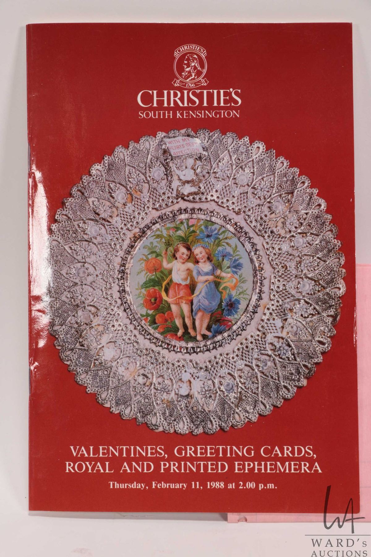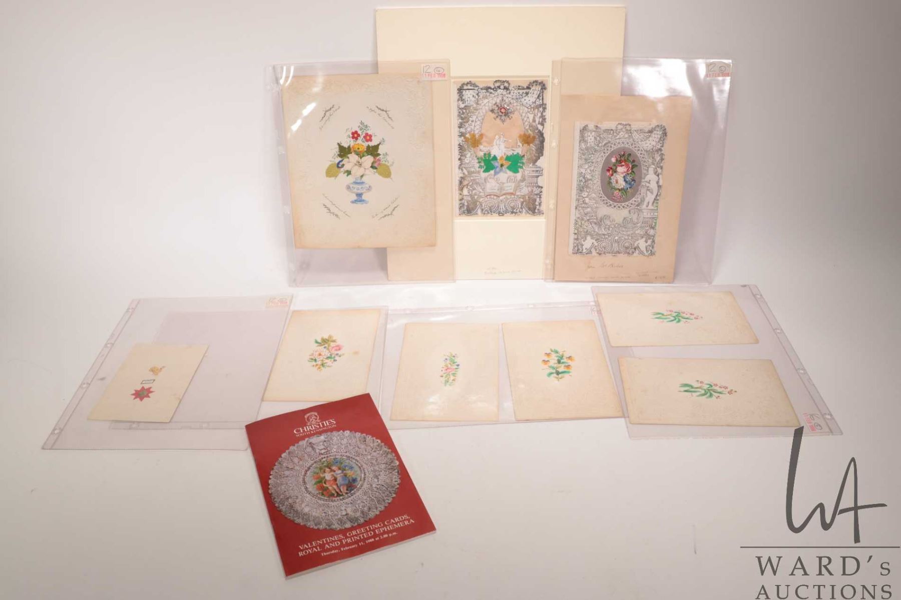 Nine antique Valentines and greeting cards including Victorian paperlace with silver embossed cameos and hand embossed paperlace with hand painted florals plus original Christie's South Kensington auction catalog from the sale they were purchased at, dated February 11, 1988