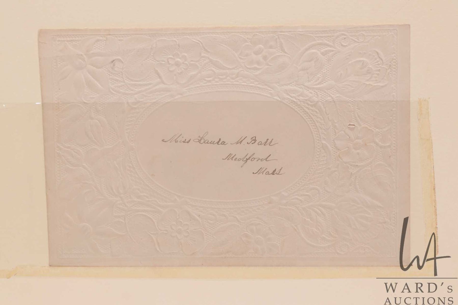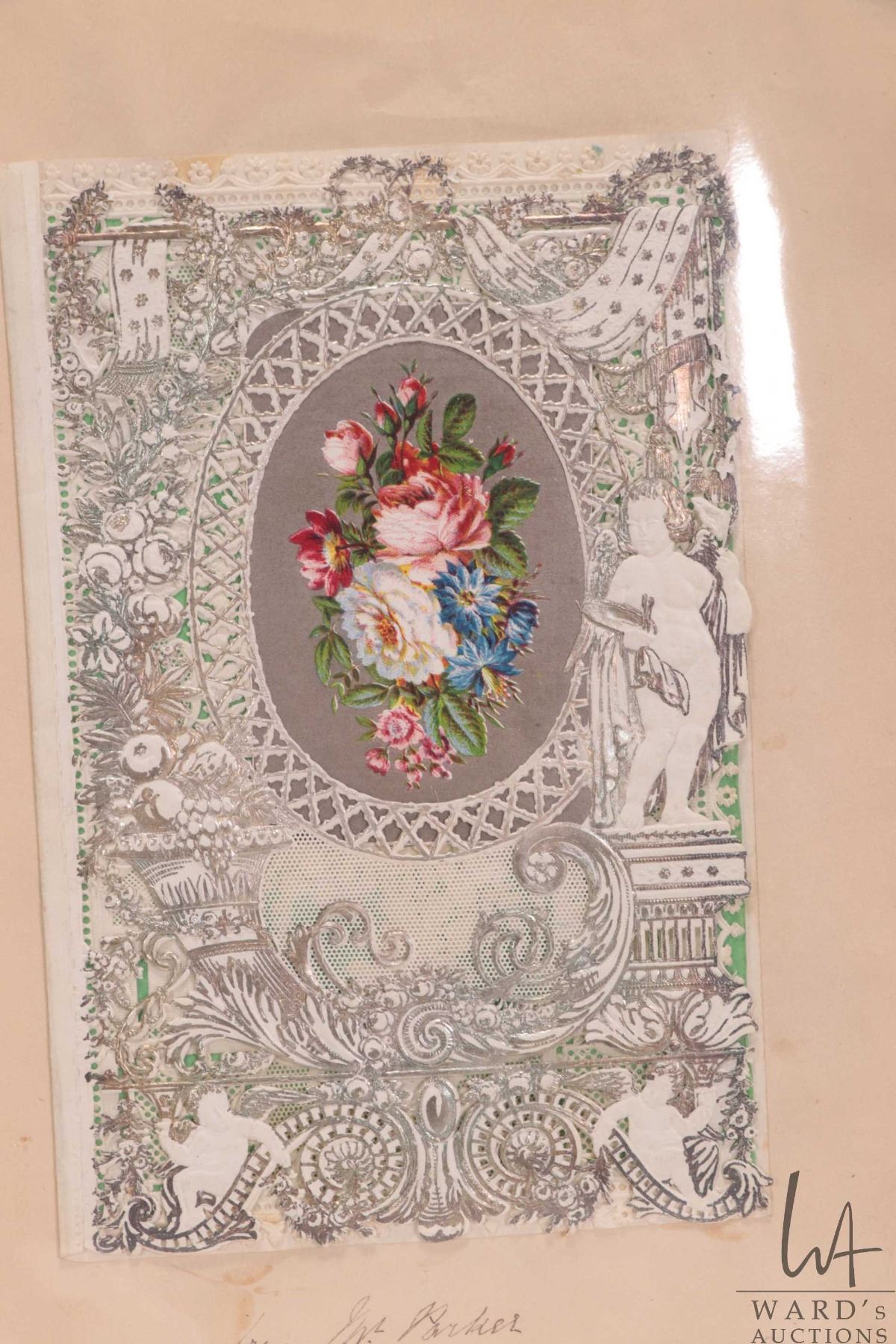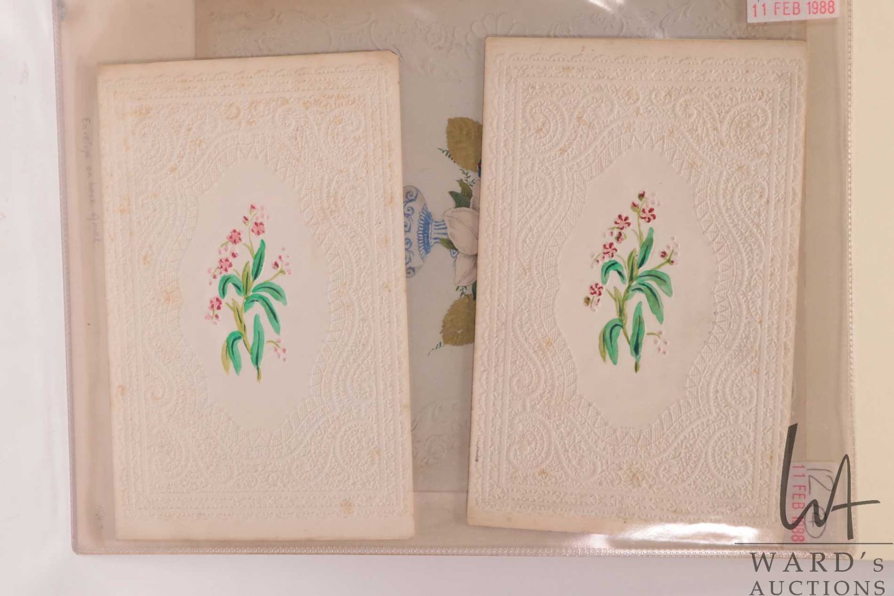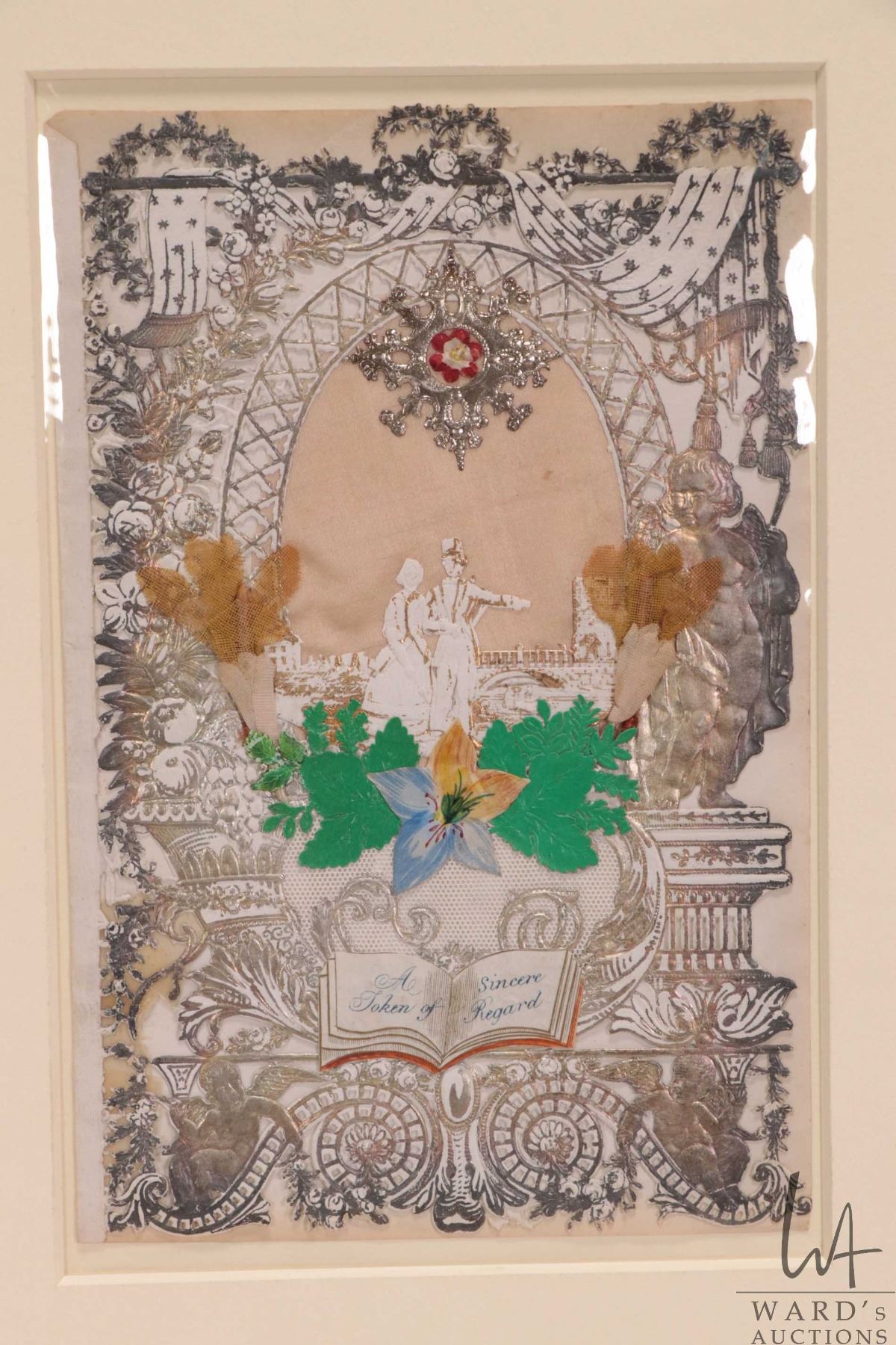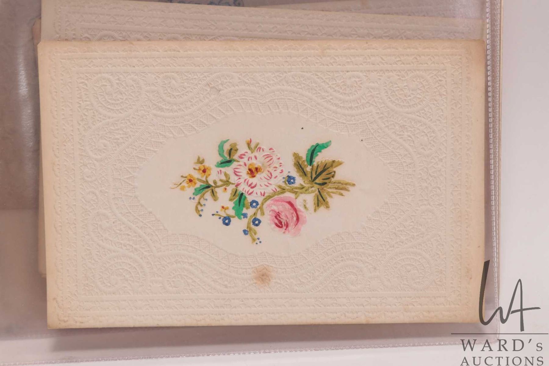 Nine antique Valentines and greeting cards including Victorian paperlace with silver embossed cameos and hand embossed paperlace with hand painted florals plus original Christie's South Kensington auction catalog from the sale they were purchased at, dated February 11, 1988