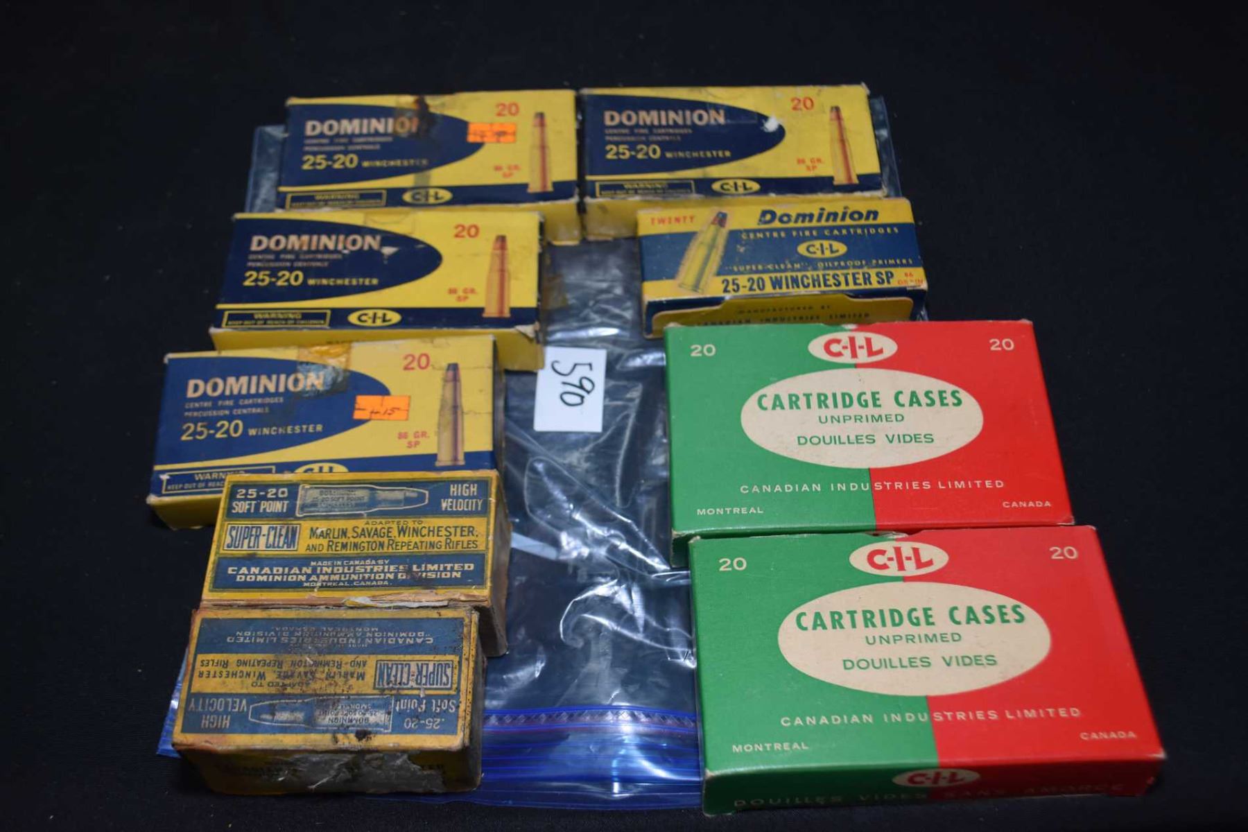 Nine boxes of .25-20 Winchester vintage collector ammunition including five Dominion CIL, four full twenty count boxes and one with thirteen rounds plus two Dominion CIL fifty count boxes, one full with moisture damage and one 3/4 full and two twenty count CIL (red & green boxes for unprimed cases) which contain approximately fifty live rounds in total