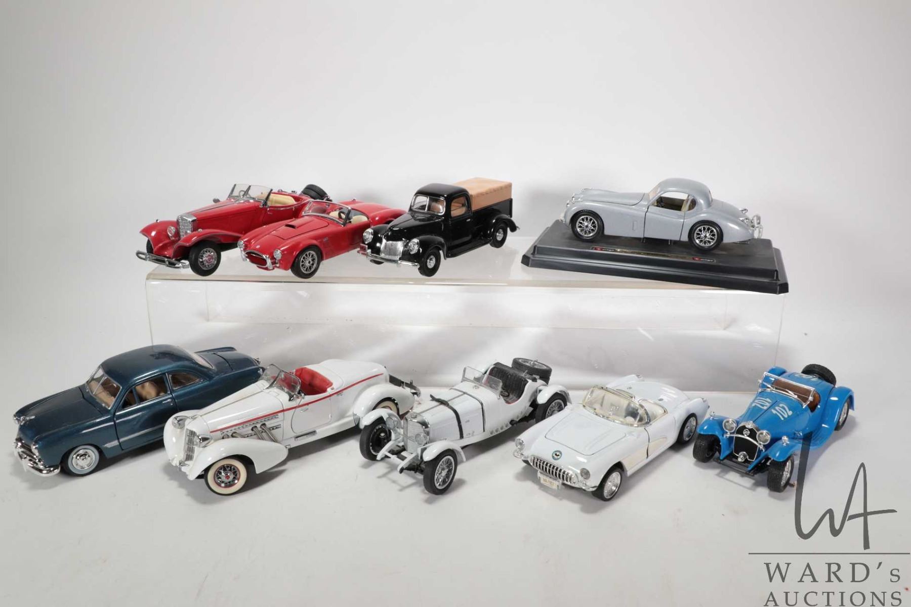 Nine die-cast cars including 1931 Mercedes-Benz SSKL by Danbury Mint, 1948 Jaguar, Ford Cobra, Franklin Mint Mercedes 500K, Franklin Mint 1935 Auburn etc. All appear to be 1:24th scale