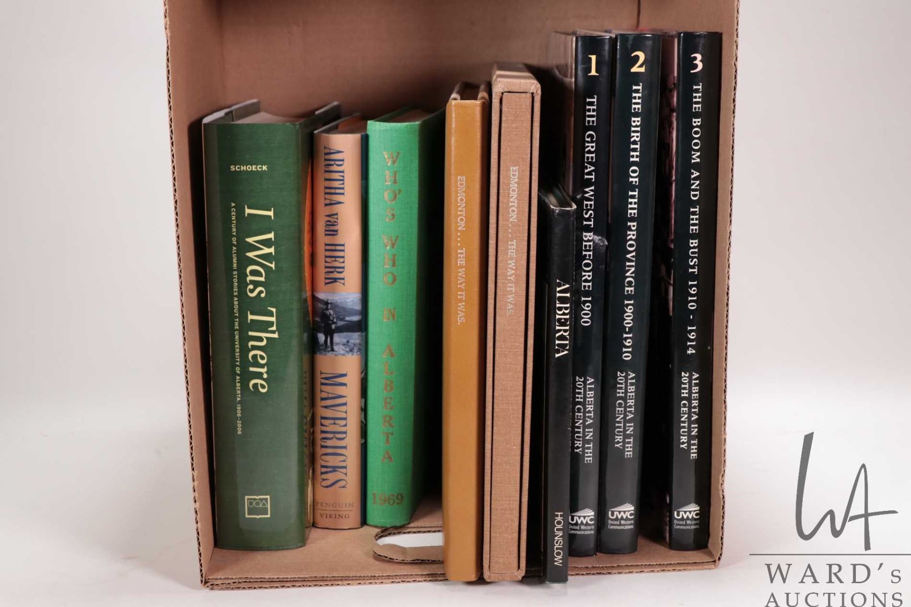 Nine hard cover books including "Edmonton-The Way it Was", volumes 1, 2 and 3 of "The Great West Before 1900" , "Who's Who in Alberta 1969", "I Was There- U of A" etc.