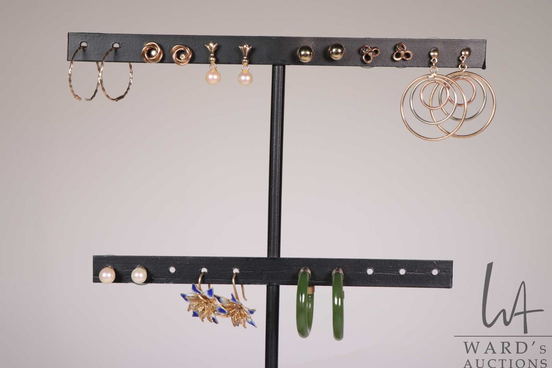 Nine pairs of earrings including 10kt yellow gold knots set with genuine diamonds, 10kt shamrock style studs, 14kt gold and pearls, 10kt balls etc. plus pair of jade hoops and filigree and enamel earrings