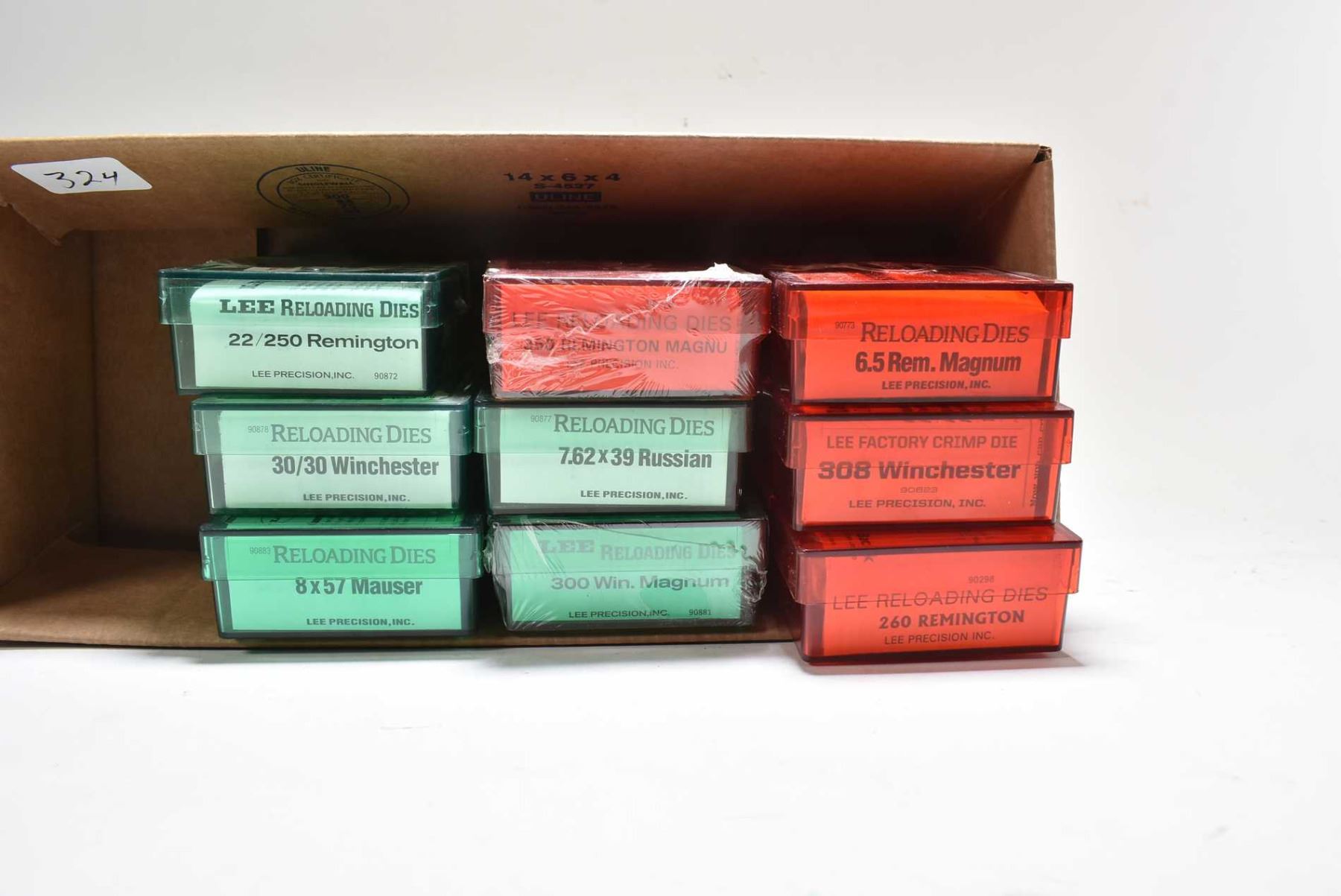 Nine sets of Lee dies including 22/250 Remington, 30/30 Winchester, 8X 57 Mauser, 350 Remington magnum, 7.62X39 Russian, 300 Win mag, 6.5 Rem mag. 303 Winchester and 260 Remington
