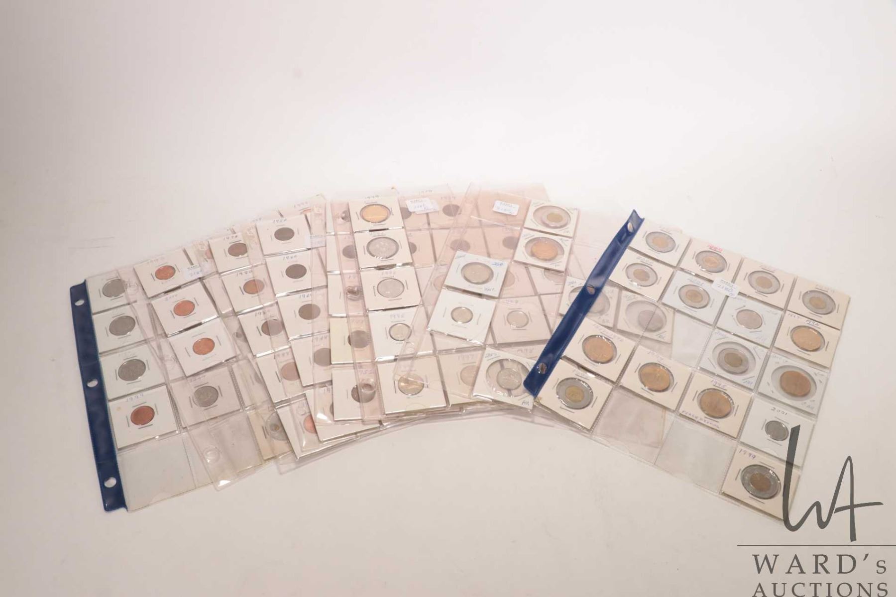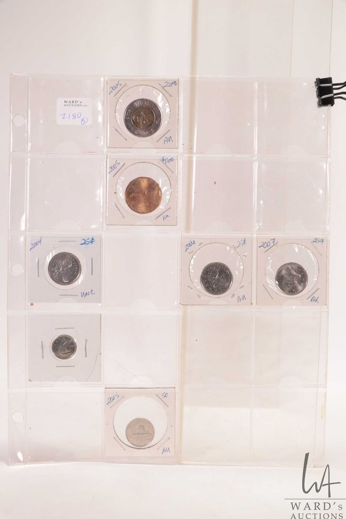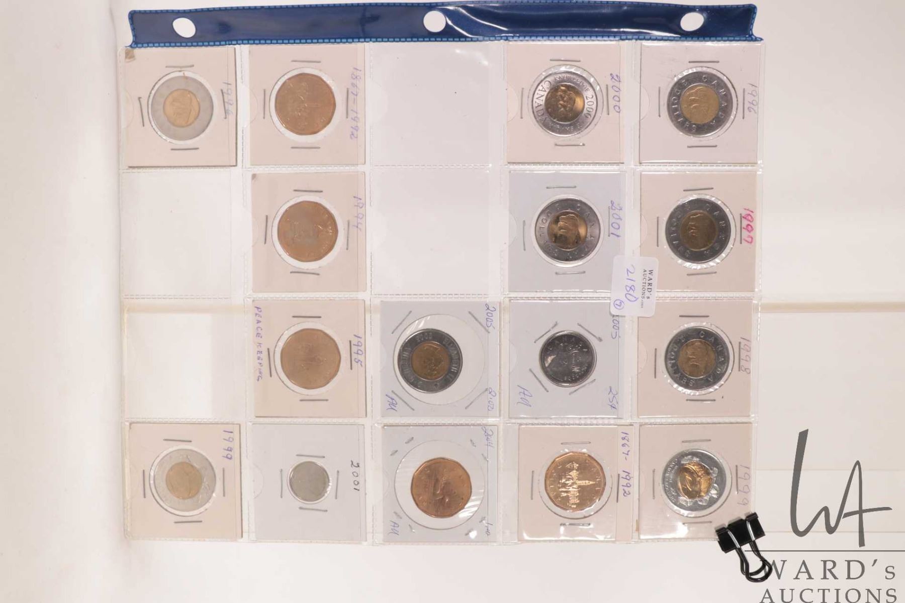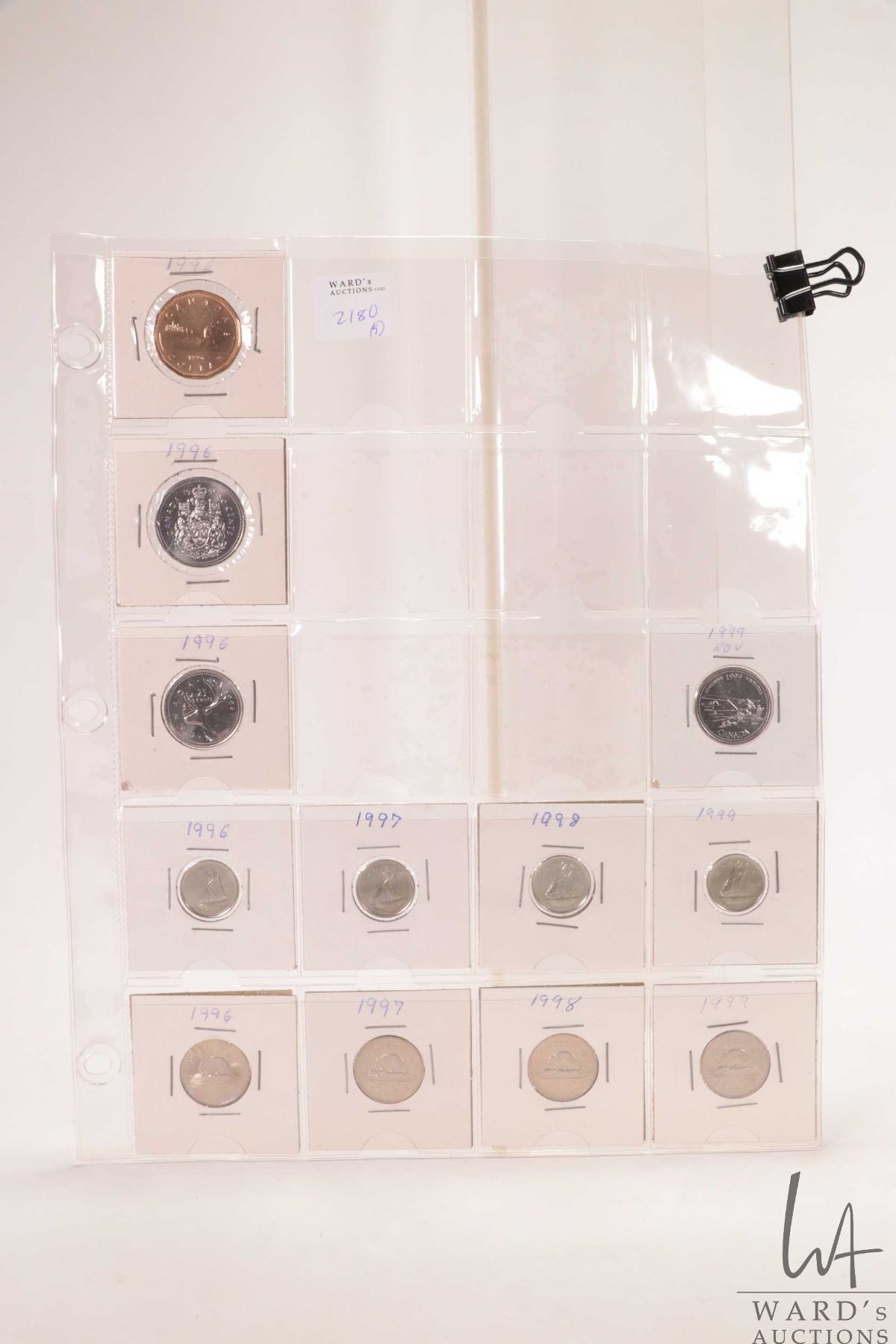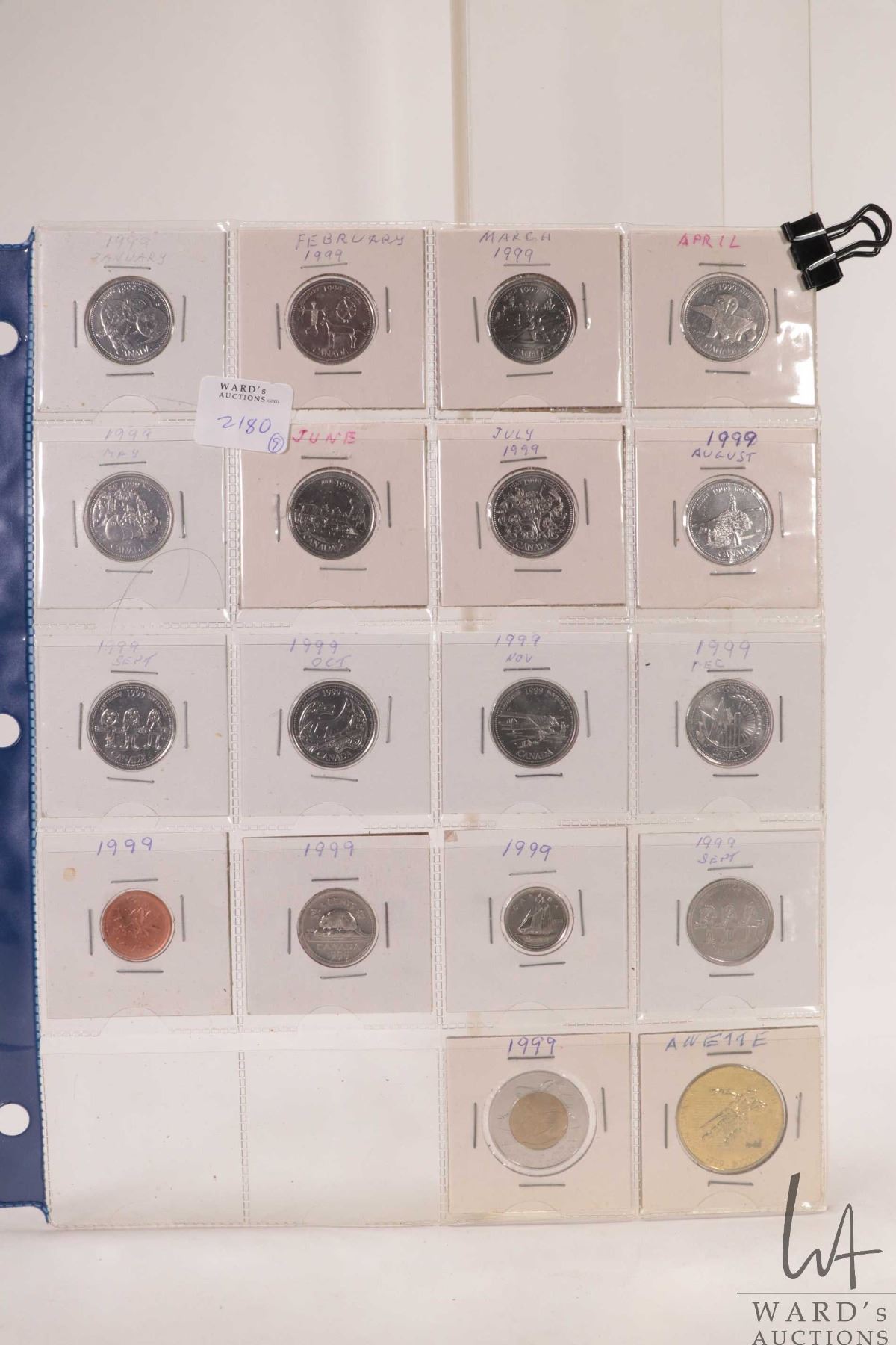 Nine sheets of Canadian coins including specialty quarters, selection of pennies, early loonies and twoonies etc. various dates