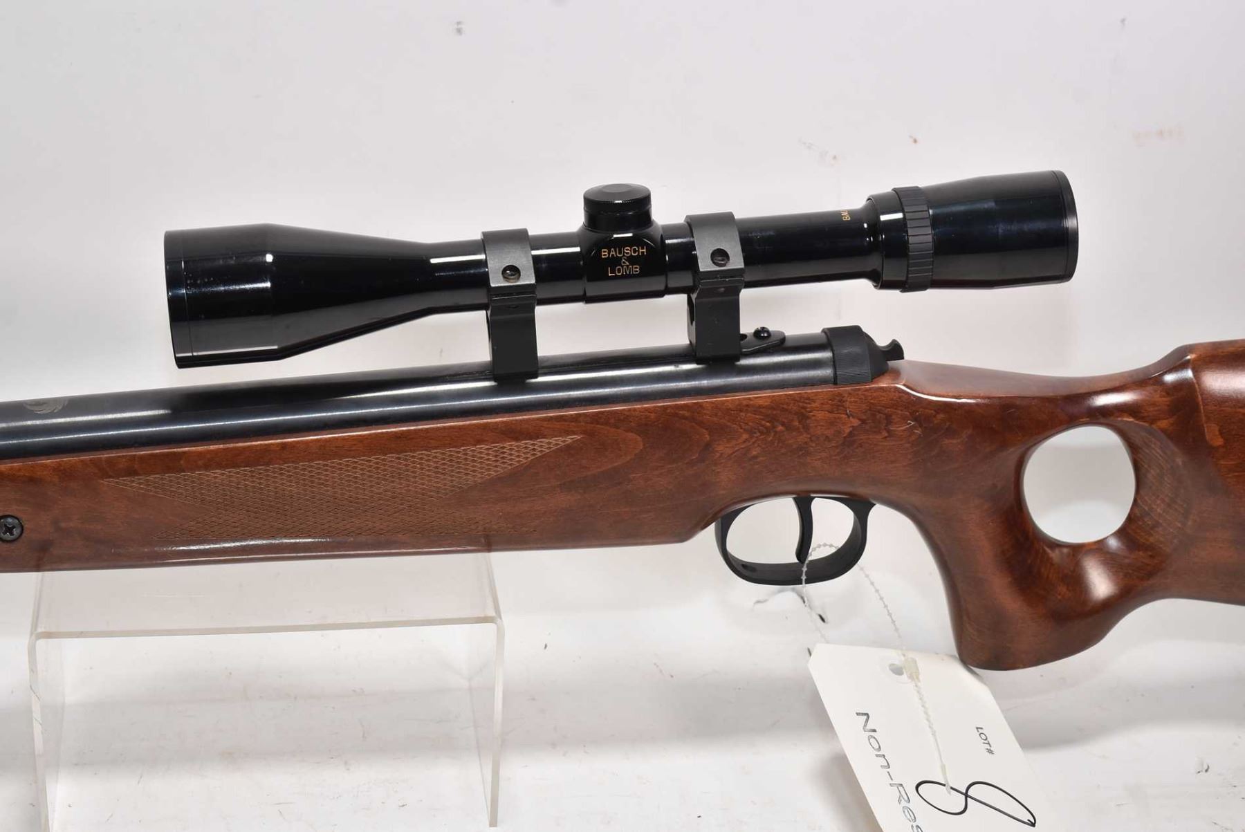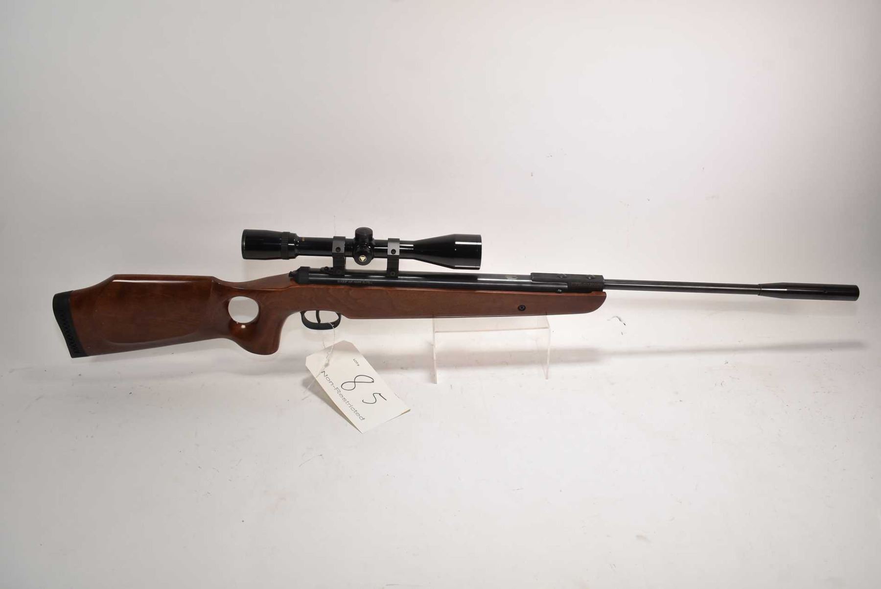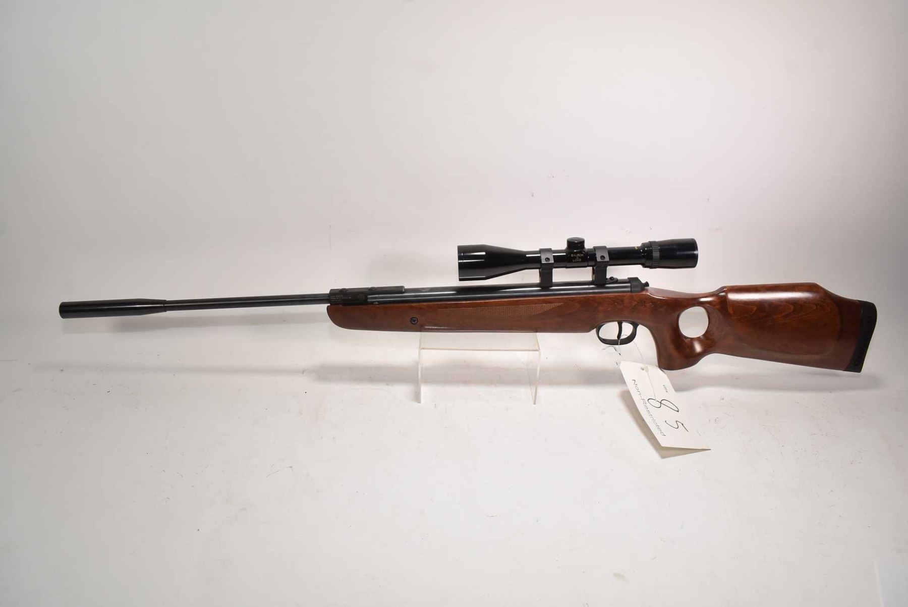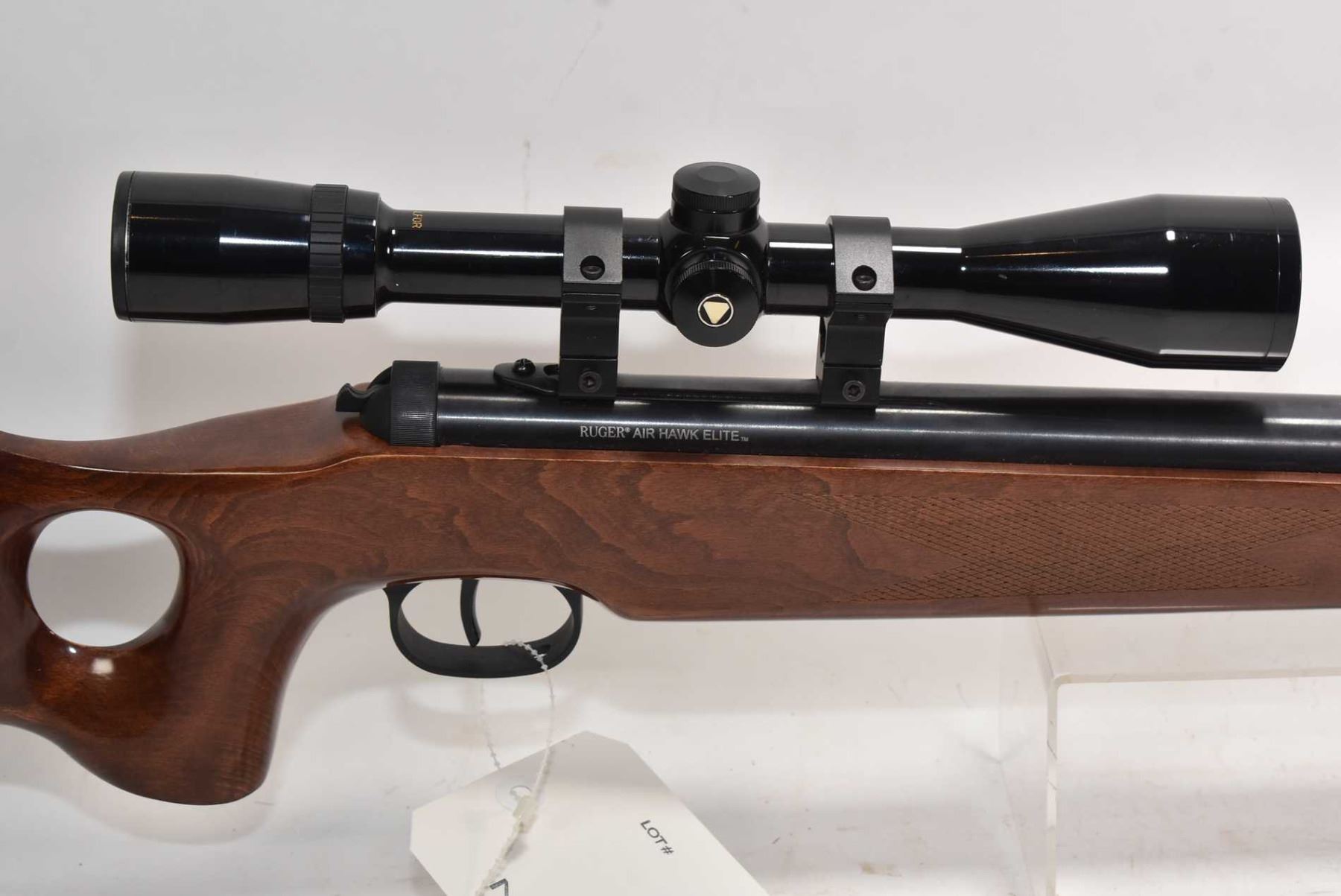 Non-Restricted Air Rifle Ruger model Air Hawk Elite, .177 single shot hinge break, w/ bbl length 14" [Blued barrel and action, no fixed sights. Fitted with Bausch & Lombe Balfor optic, one piece wooden target stock with recoil pad. Target barrel weight. Minor handling marks on wood and metal] serial # 000017781, PAL required