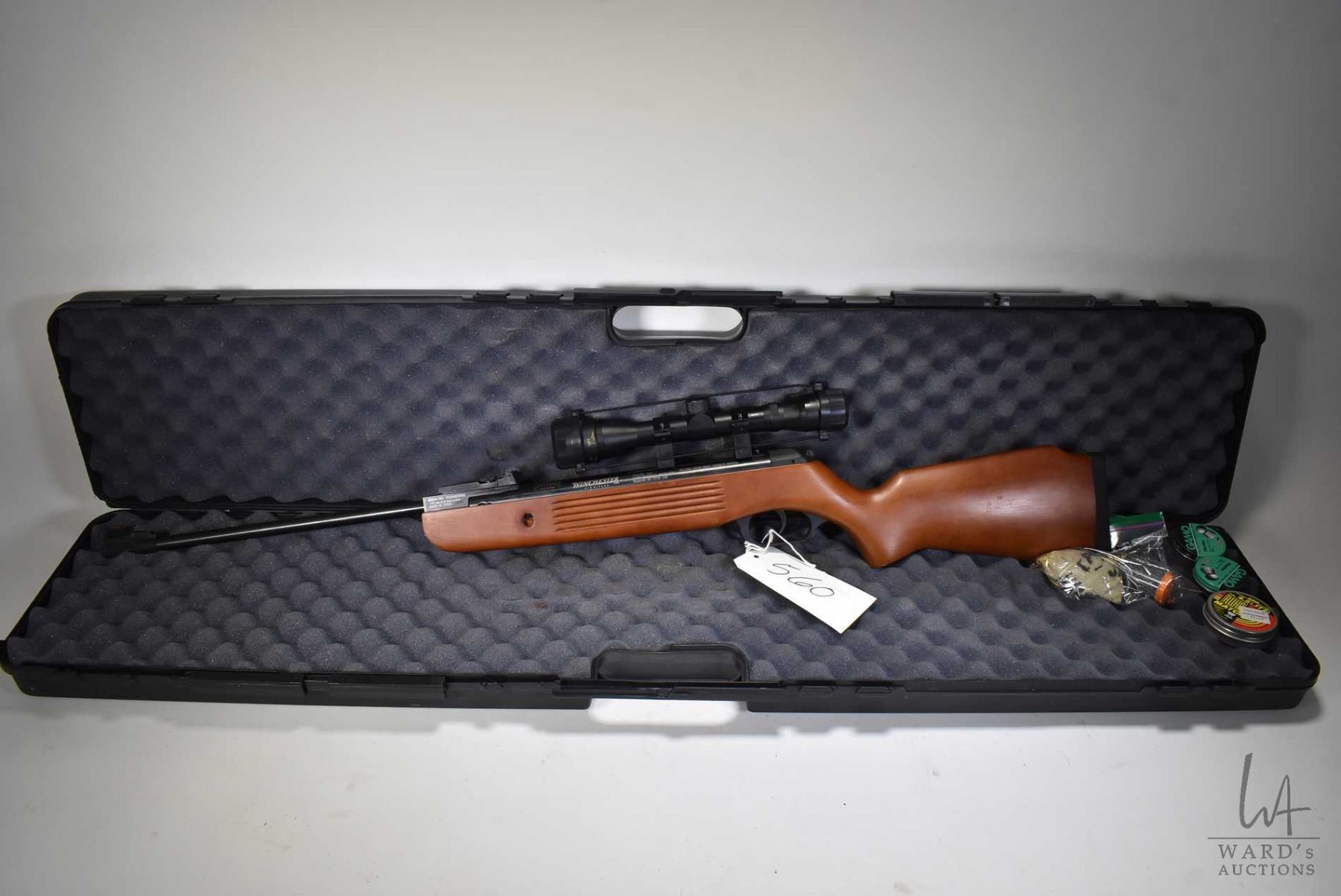 Non-Restricted Air Rifle Winchester model 500, 177 cal. single shot hinge break, w/ bbl length 17" [Blued finish, fiber optic front and adjustable target rear sight. Fitted with factory optic. Smooth wooden stock with thick plastic butt plate. 495 fps. Appears to have had little use with storage and handling marks. Includes selection of non-related pellets and foam lined hard case.] serial # 172011541310Q, No PAL required
