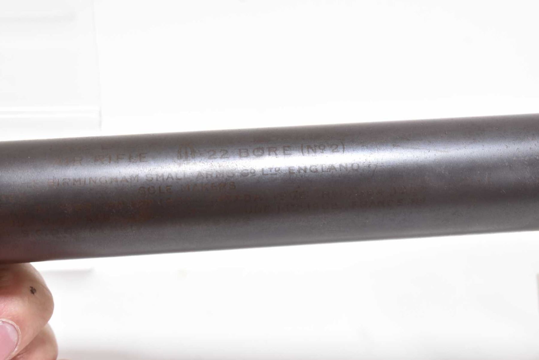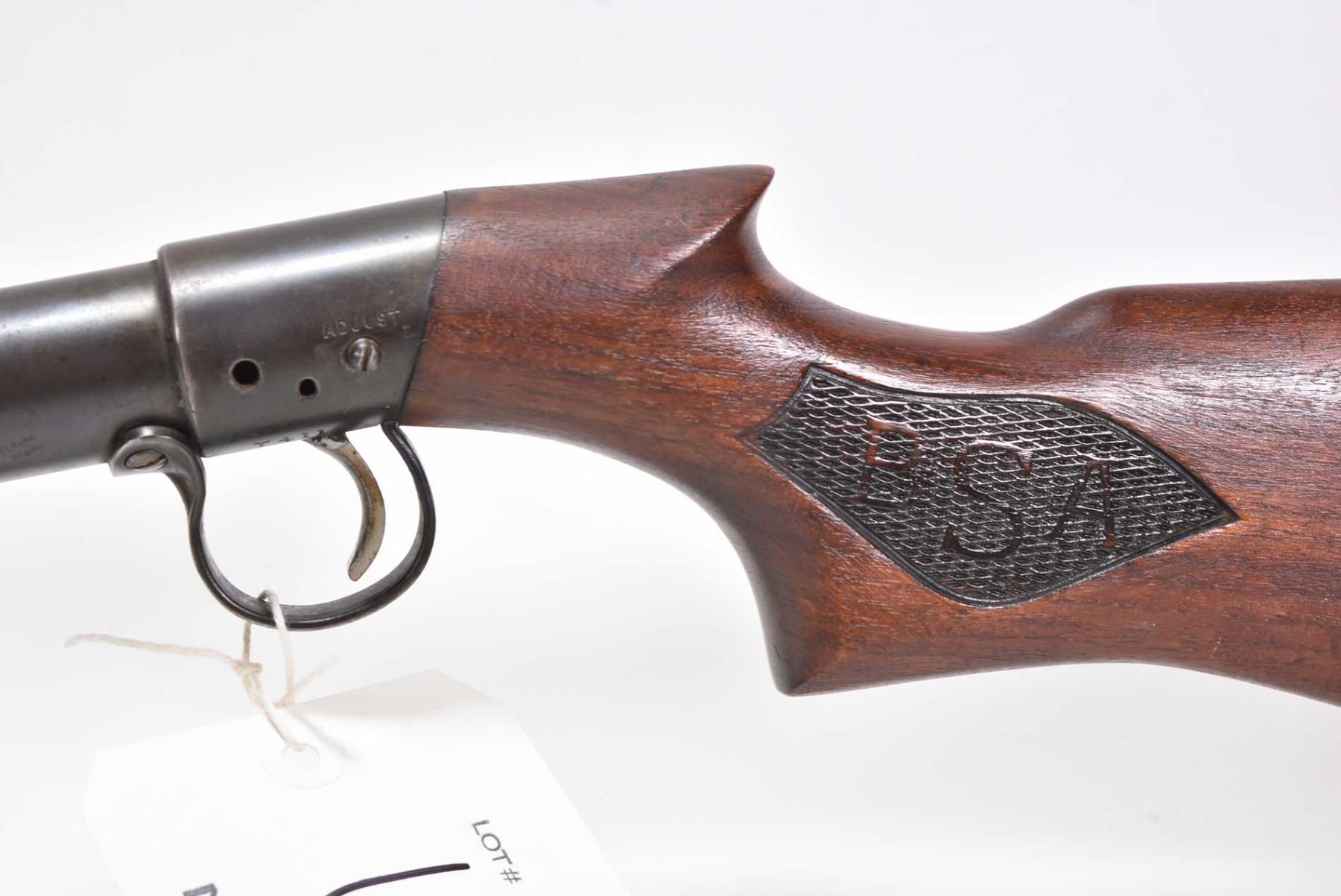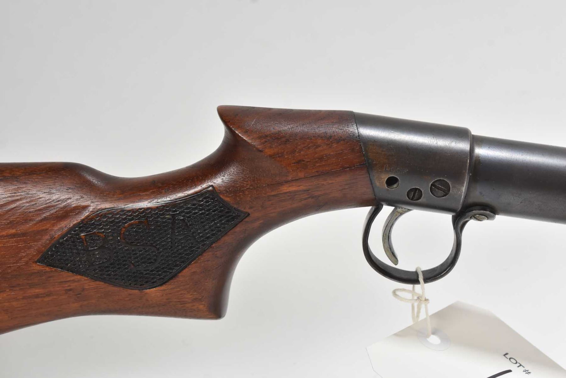 Non-Restricted air rifle BSA model Standard air rifle T Pat, .22 pump air rifle, w/ bbl length 19" [Blued and barrel and receiver turning brown. Fixed front sight and flip up rear sight. Hardwood stock with BSA branded checkered grip. 575 FPS. Overall used condition with nicks and marks to wood and metal. Storage, use and handling marks] serial # T4116, PAL required