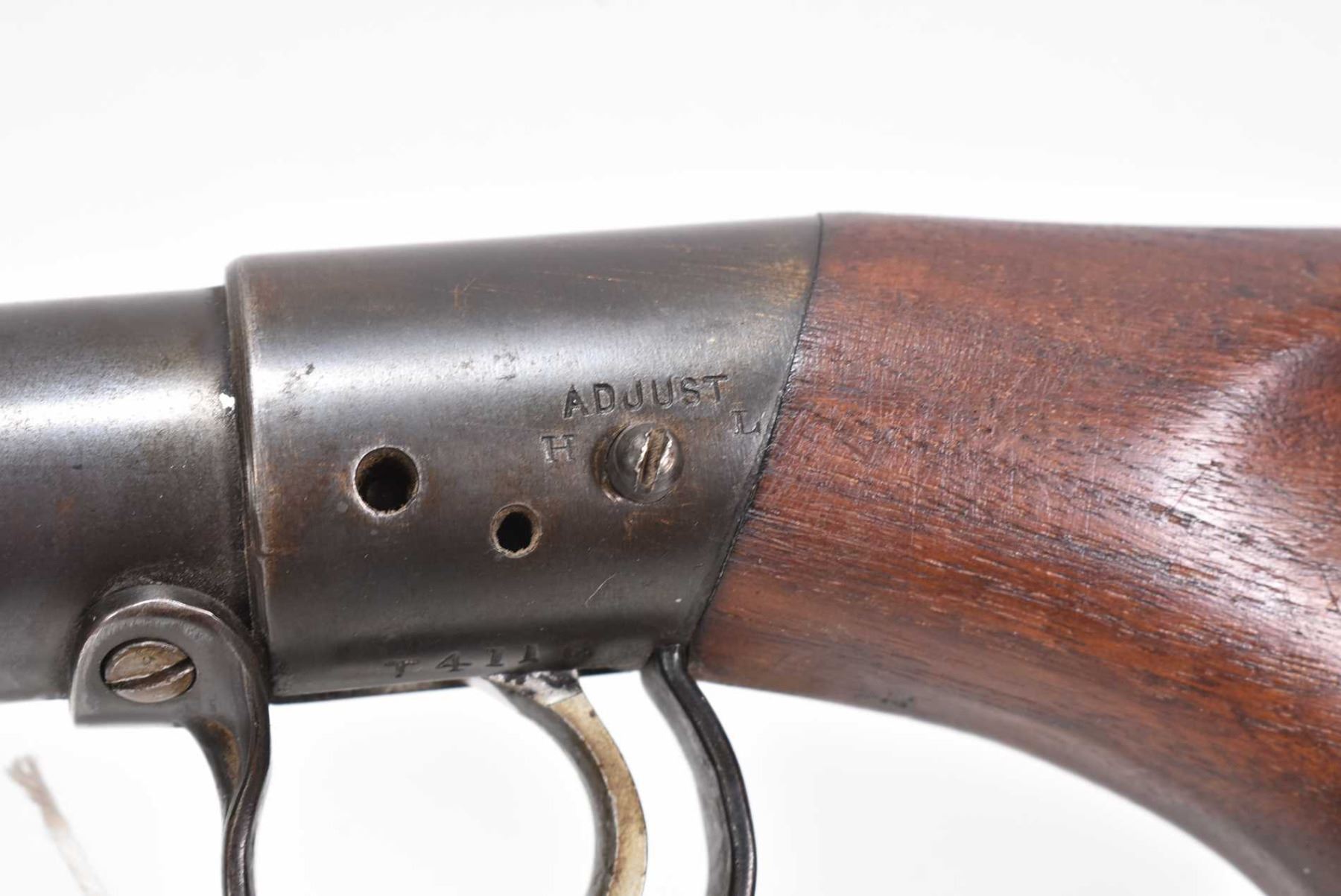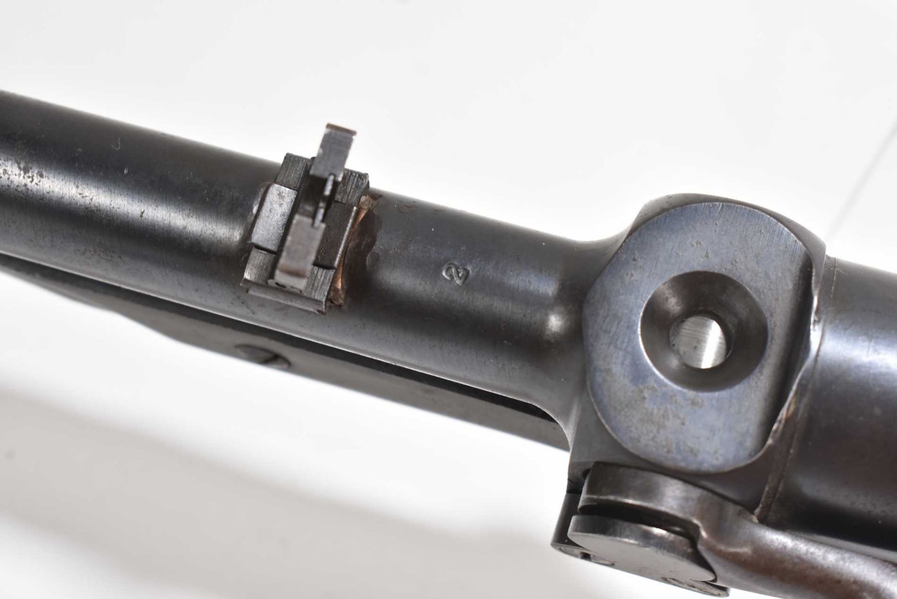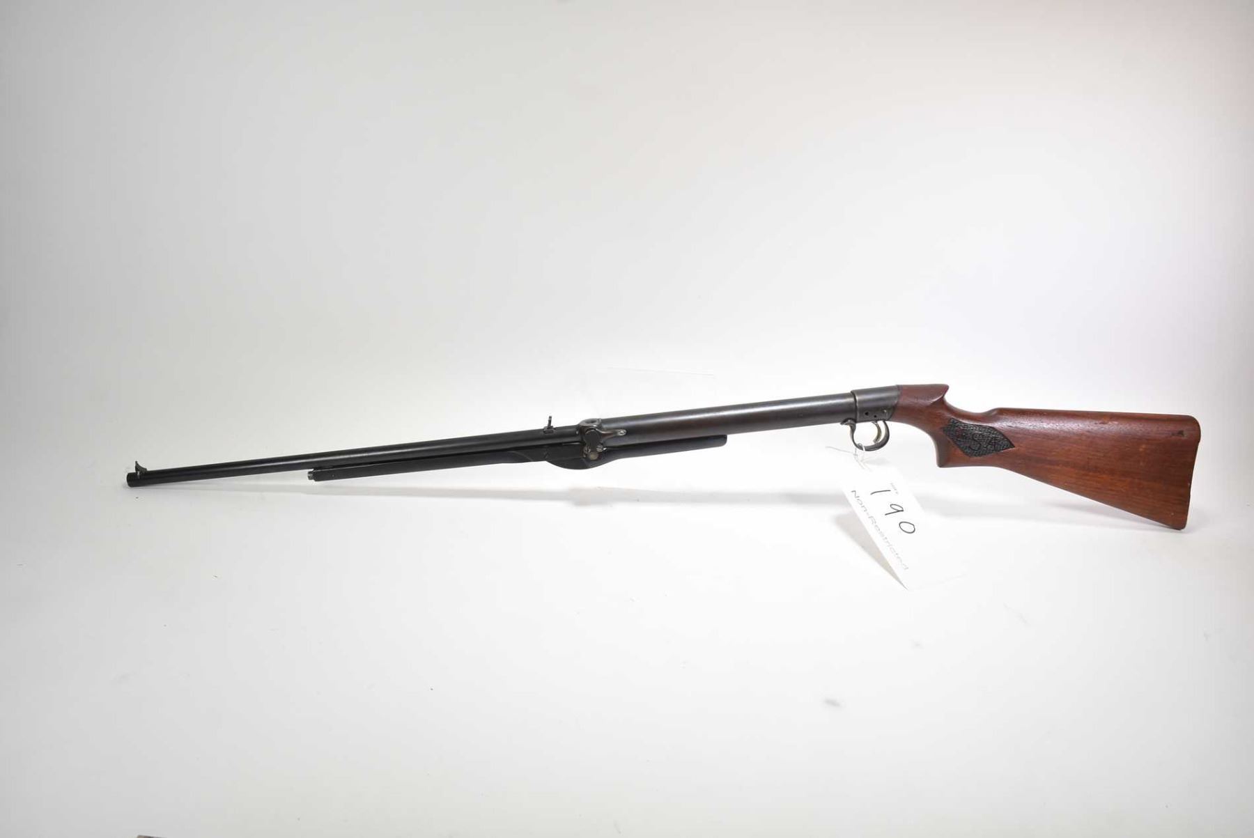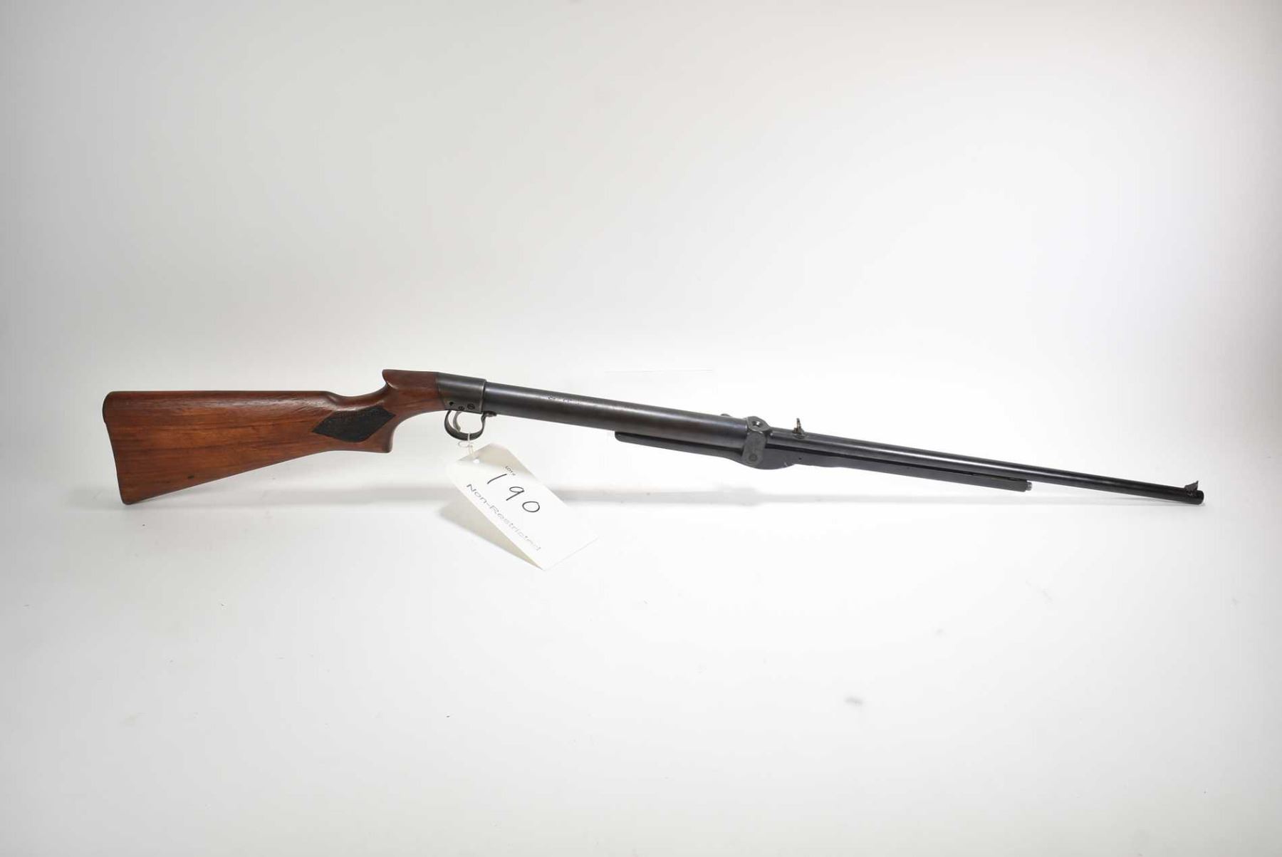 Non-Restricted air rifle BSA model Standard air rifle T Pat, .22 pump air rifle, w/ bbl length 19" [Blued and barrel and receiver turning brown. Fixed front sight and flip up rear sight. Hardwood stock with BSA branded checkered grip. 575 FPS. Overall used condition with nicks and marks to wood and metal. Storage, use and handling marks] serial # T4116, PAL required