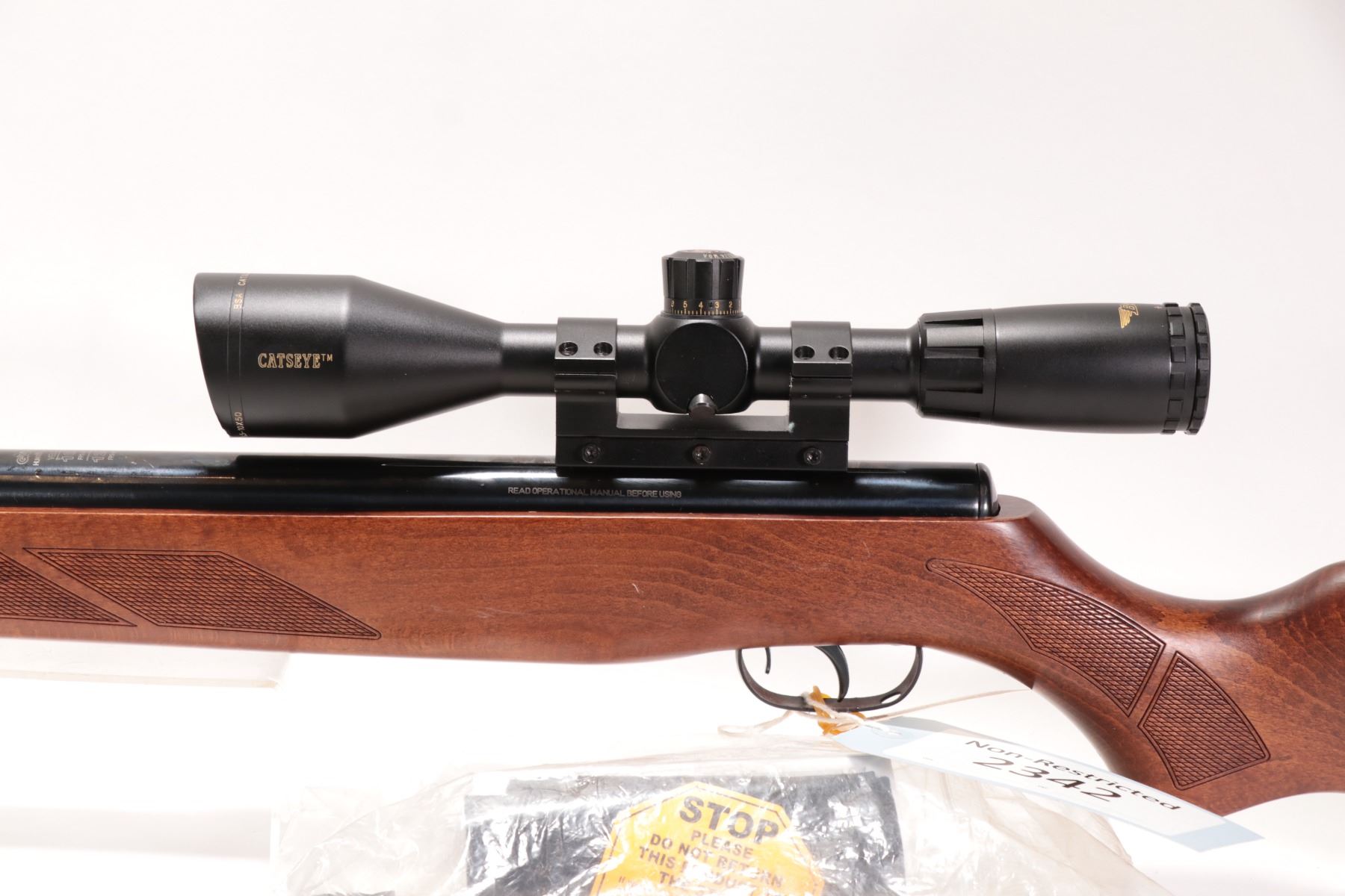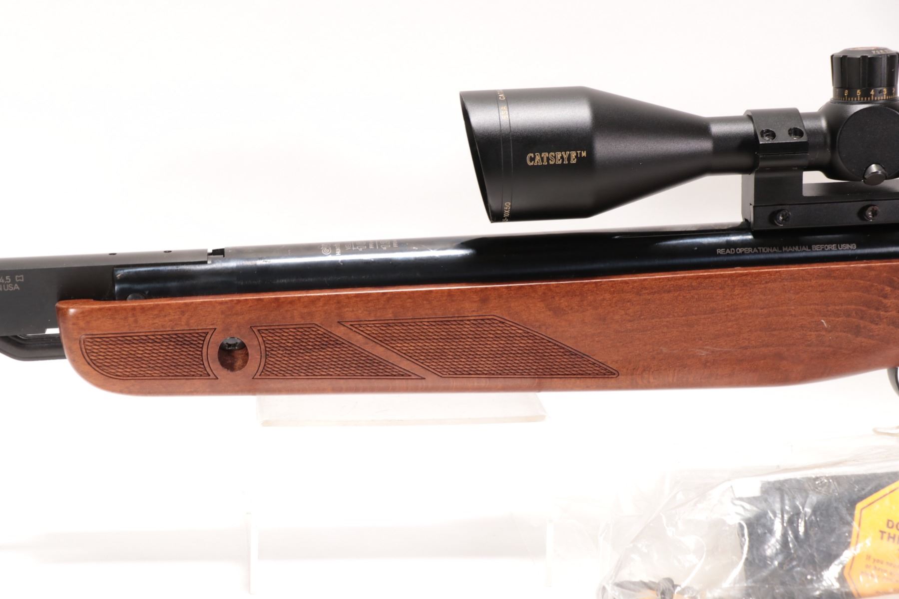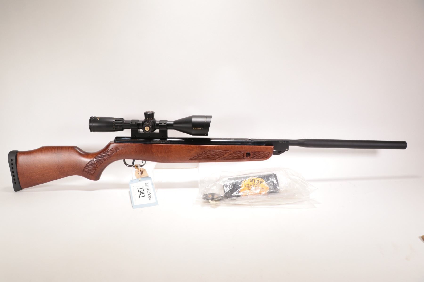 Non-Restricted air rifle Gamo model Hunter Extreme, .177 cal (1650 FPS) Single shot hinge break, w/ bbl length 17 12" [Blued style finish. No fixed sights. Fitted with BSA Catseye 3.5-10X50 scope. Includes original manual. Wooden stock with recoil pad. Advertised at 1650 fps with Gamo PBA non-lead hunting pellet and 1250 fps with traditional lead pellet. Mechanically and aesthetically appear near excellent with only minor use, handling and storage marks.] serial # 70099008, PAL required
