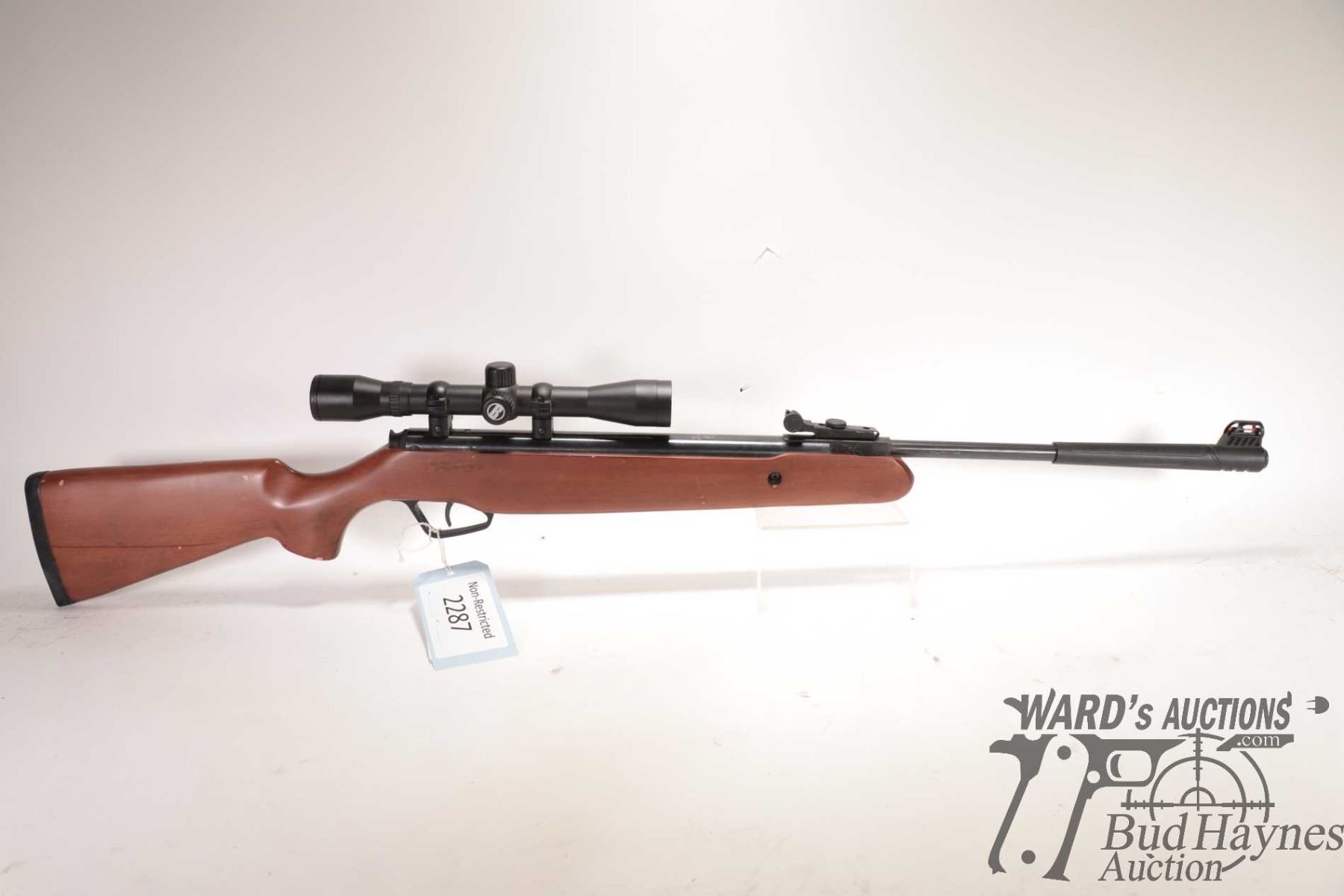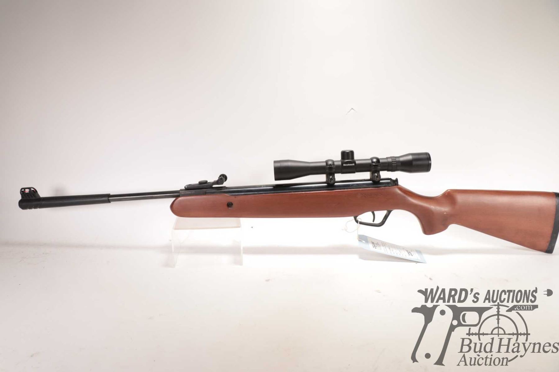 Non-Restricted air rifle Stoeger model X10, .177 Single shot hinge break, w/ bbl length 17" [Blued finish. Fixed front and adjustable rear sights, both with fiberoptic inserts. Fitted with Bushnell scope. Smooth wooden stock with recoil pad. Mechanically appears to function reasonably well. Minor bluing wear in use and handling areas and other use, handling and storage marks.] serial # STG1158620, PAL required