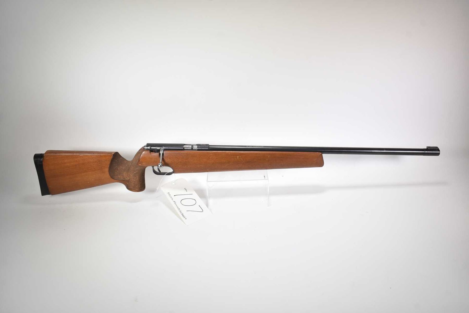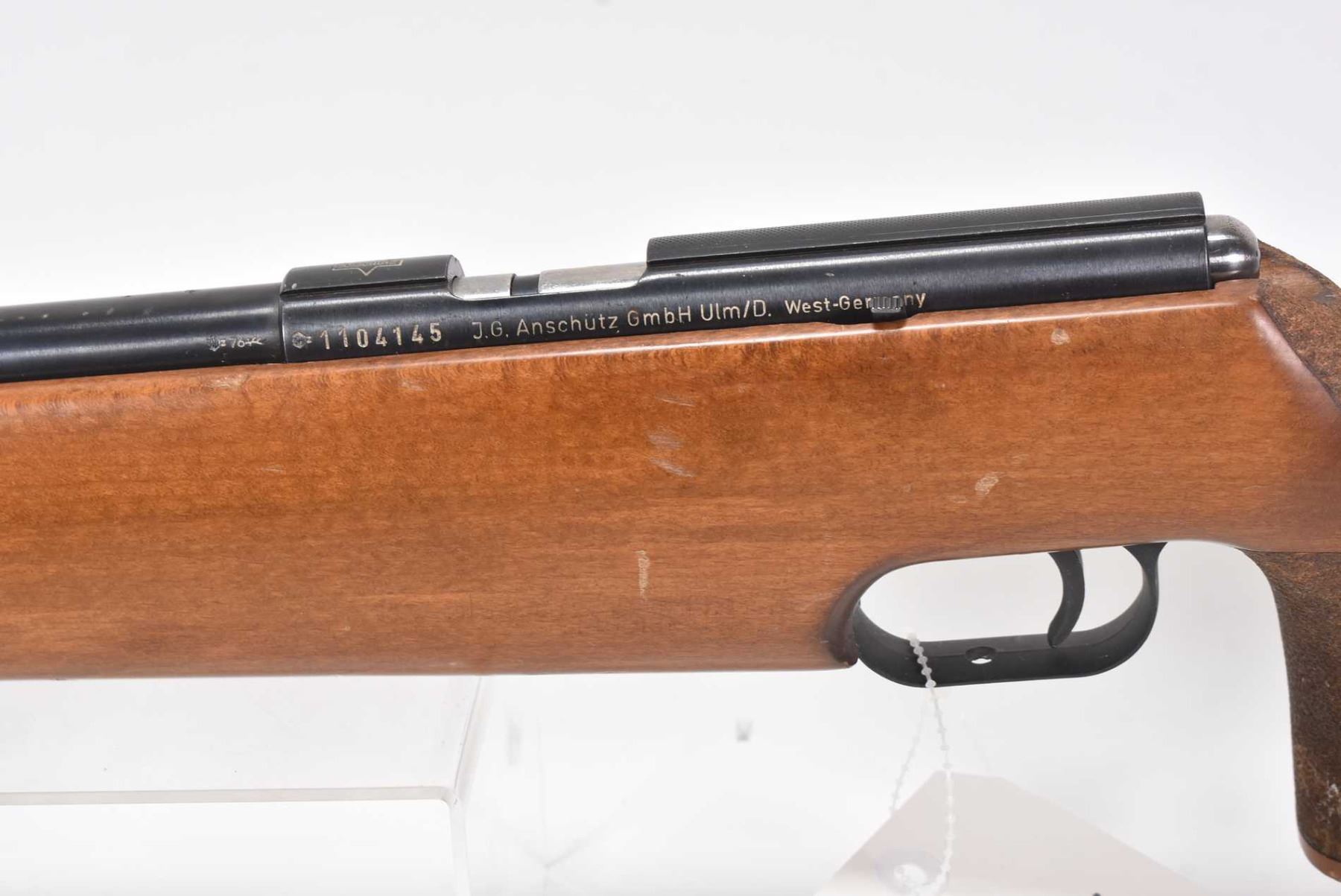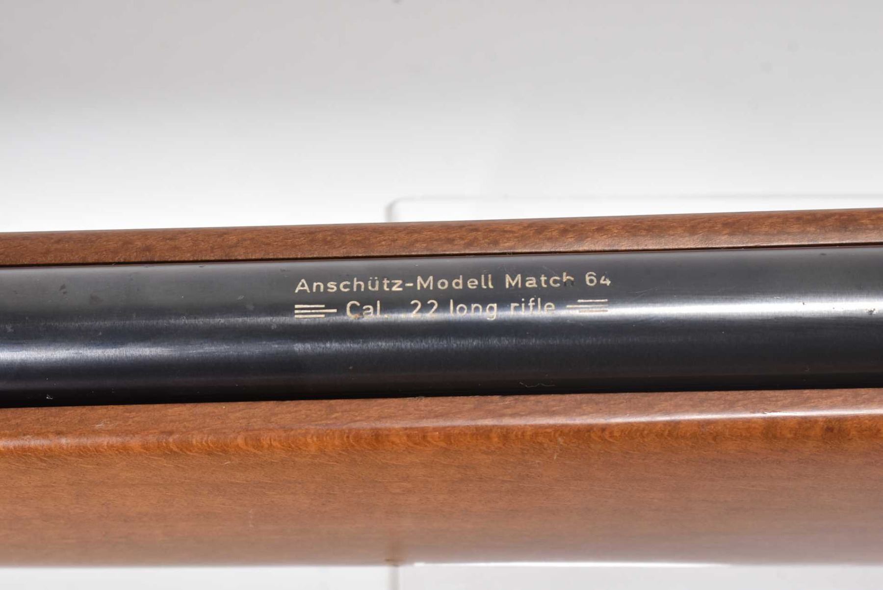 Non-Restricted rifle Anschutz model Match 64, .22 LR single shot bolt action, w/ bbl length 26" [Blued barrel and receiver, no sights, wooden target grip with checkered butt plate. Use handling and storage marks on wood and metal.] serial # 1104145, PAL required