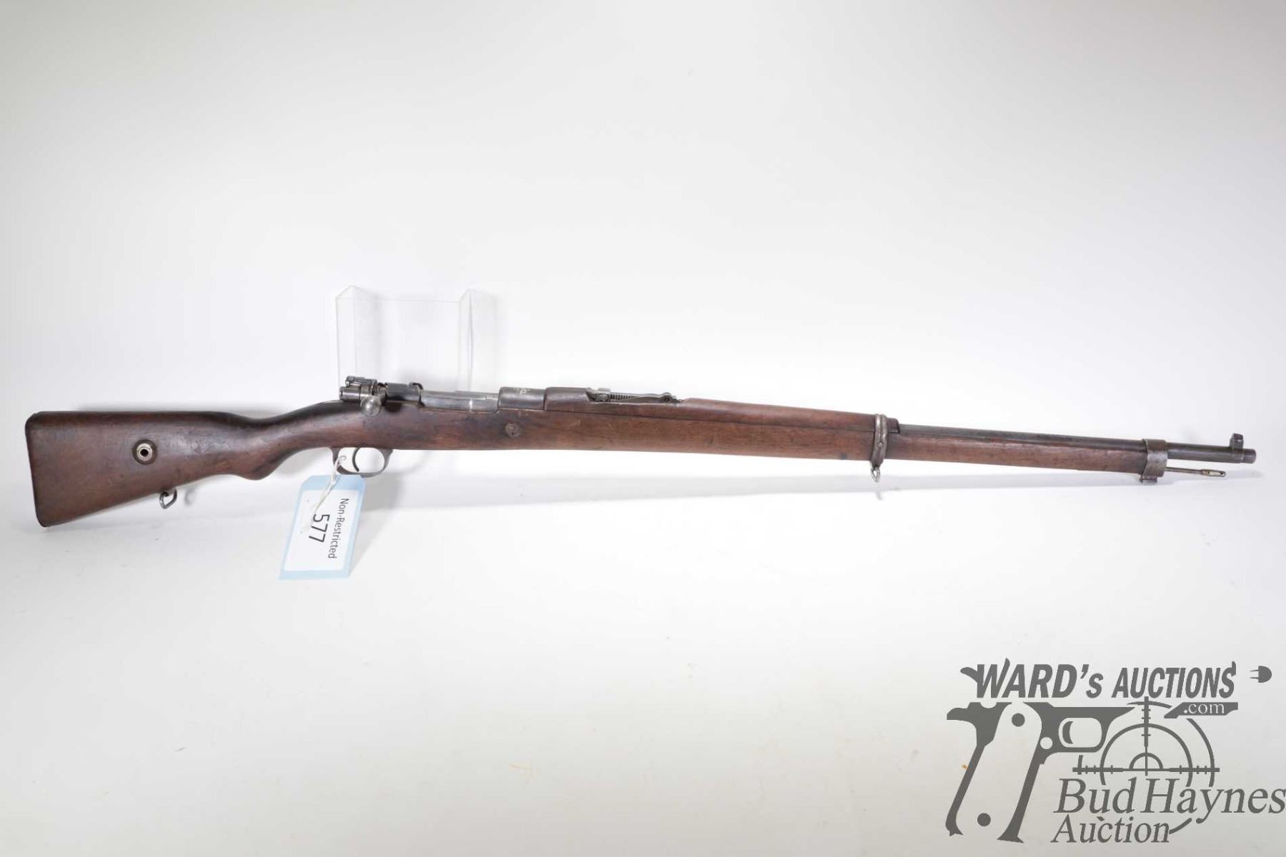 Non-Restricted rifle Asfa Ankara model Mauser 1903, 8mm bolt action, w/ bbl length 29 1/2" [Blued barrel and receiver. Fixed front and adjustable rear sights. Internal magazine. Full wood stock with metal butt plate. Fitted with sling rings, bayonet lug and includes cleaning rod. Matching serial number on receiver, rear sight etc., non-matching serial number on bolt. Other markings include the crest of the Ottoman Turkish Empire, and date stamp "1942" on top of receiver etc. Mechanically appears to function reasonably well. Most bluing worn with some surface rust and pitting and other use, handling and storage marks] serial # 97544,