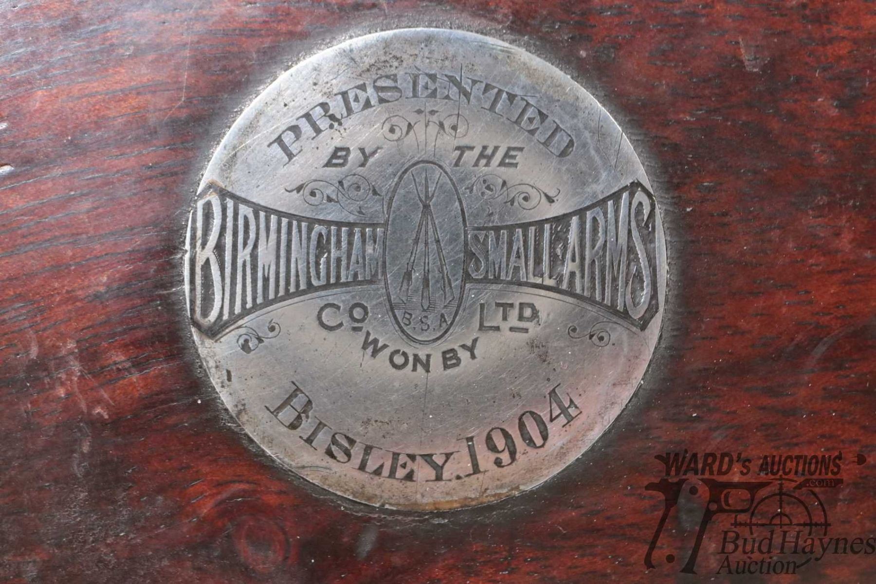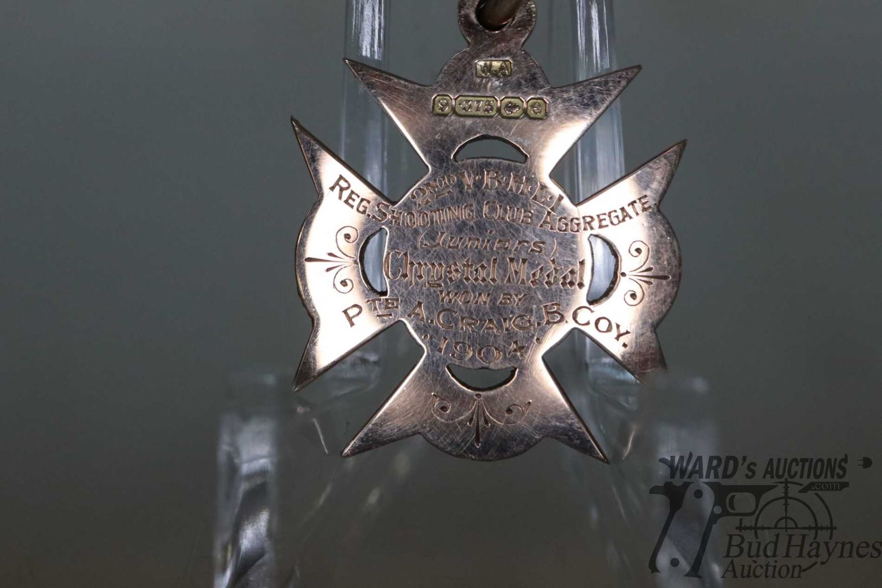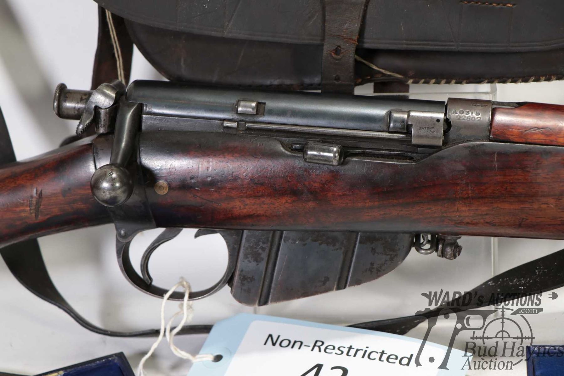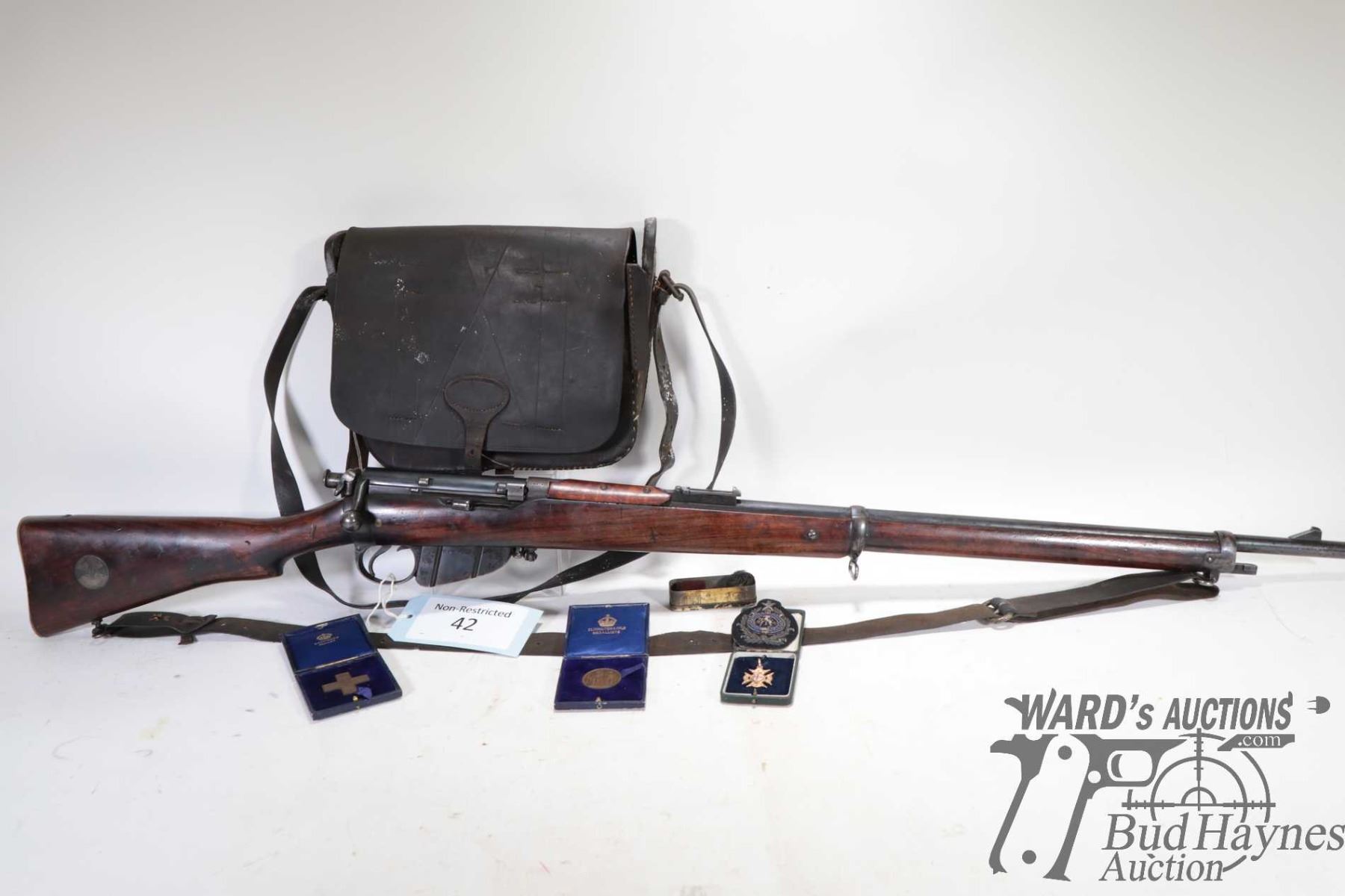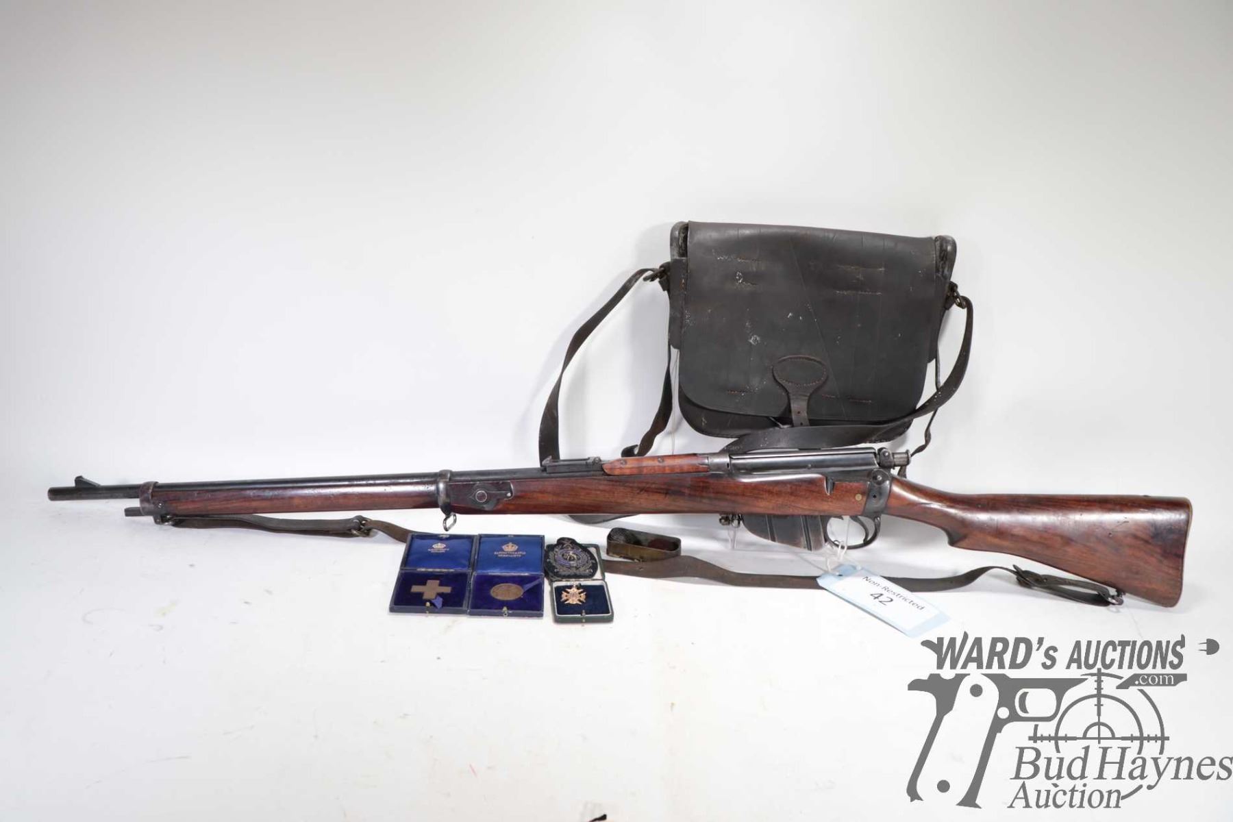 Non-Restricted rifle B.S.A. model Gibbs Lee Metford, .303 British ten shot bolt action, w/ bbl length 30" [Blued barrel and receiver. Fixed front and adjustable rear sights. Full wood stock with brass butt plate. Includes one detachable magazine and leather sling. Matching serial number on receiver and bolt. Other markings include "GIBBS, BRISTOL & LONDON' on top of barrel, 'FOR CORDITE ONLY" serial number and proof marks on top of receiver "B.S.A. CO." on right side of band, electric pencil 'M54350" on trigger guard. Fitted with Magazine cut-off and volley sight, although rear volley sight piece is missing. Mechanically appears near excellent. -This historically significant firearms was purportedly given as a prize as evident by the silver inset medallion on right side of stock from Birmingham Small Arms during the Bisley 1904 shooting Competition ( Bisley, Surrey England), note area on medallion given for the winner's name was never engraved). Also includes 9kt rose gold Maltese cross medallion with guilloche enamel St. George's cross and backside engraved to "2nd V.B.H.L.I ( Volunteer Battalion Highland Light Infantry) Reg. Shooting Club Aggregate Jrs.. Crystal Metal won by Pte. A. Craig B. Coy 1940" and also includes two different bronze NRA medallions each in original fitted boxes branded "ELKINGTON & CO. Medalists and a Scottish Rifle Association patch badge with metal thread and a period appropriate leather shooting satchel. Extremely scarce firearm with a fascinating history. Many hours could be spend in research of both the gun and the man. Wonderful addition to your collection. This collection was consigned by Pte. Coy's step-grandson.] serial # A031522602, PAL required