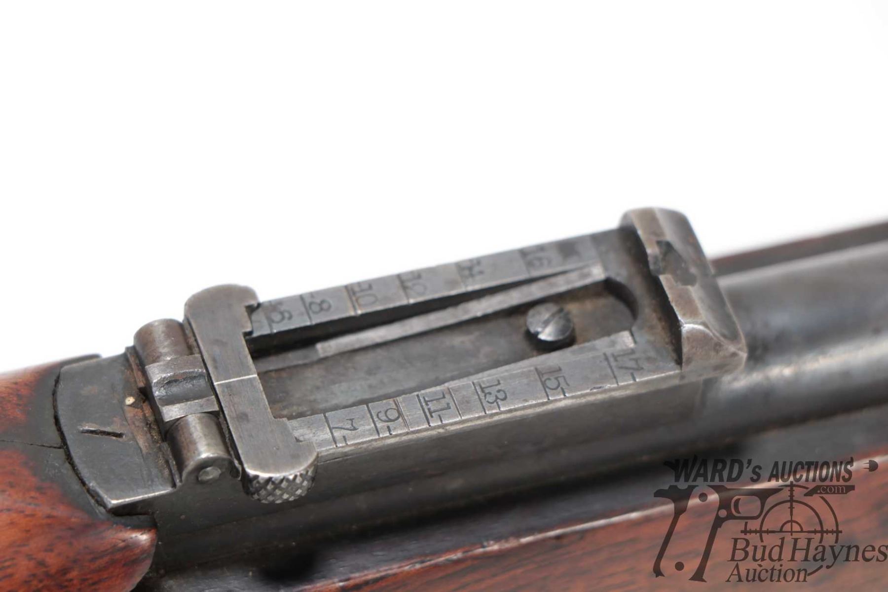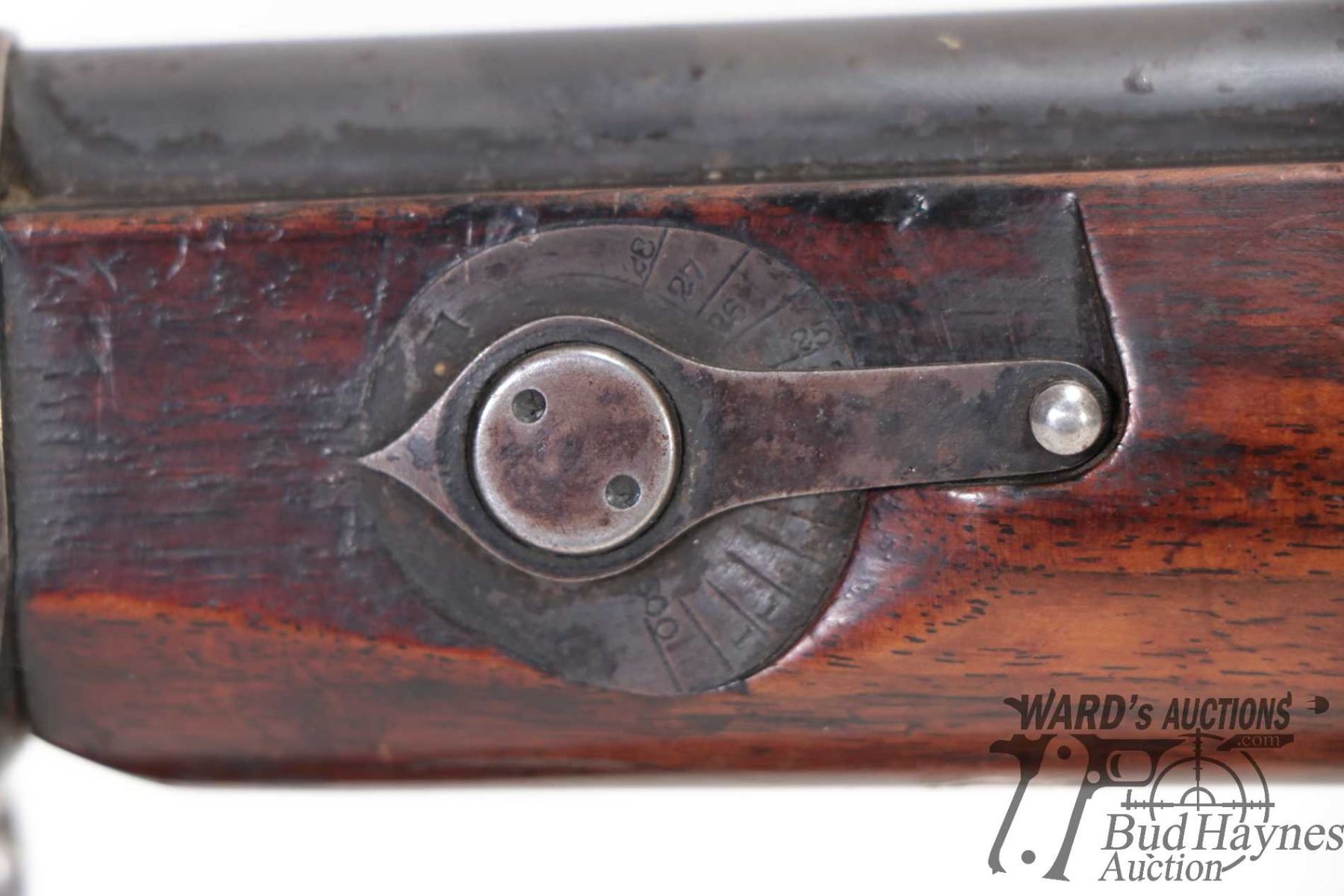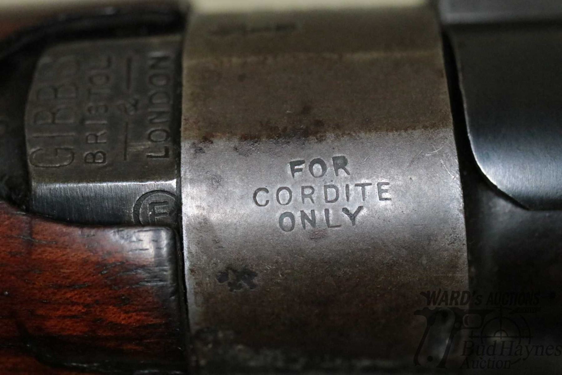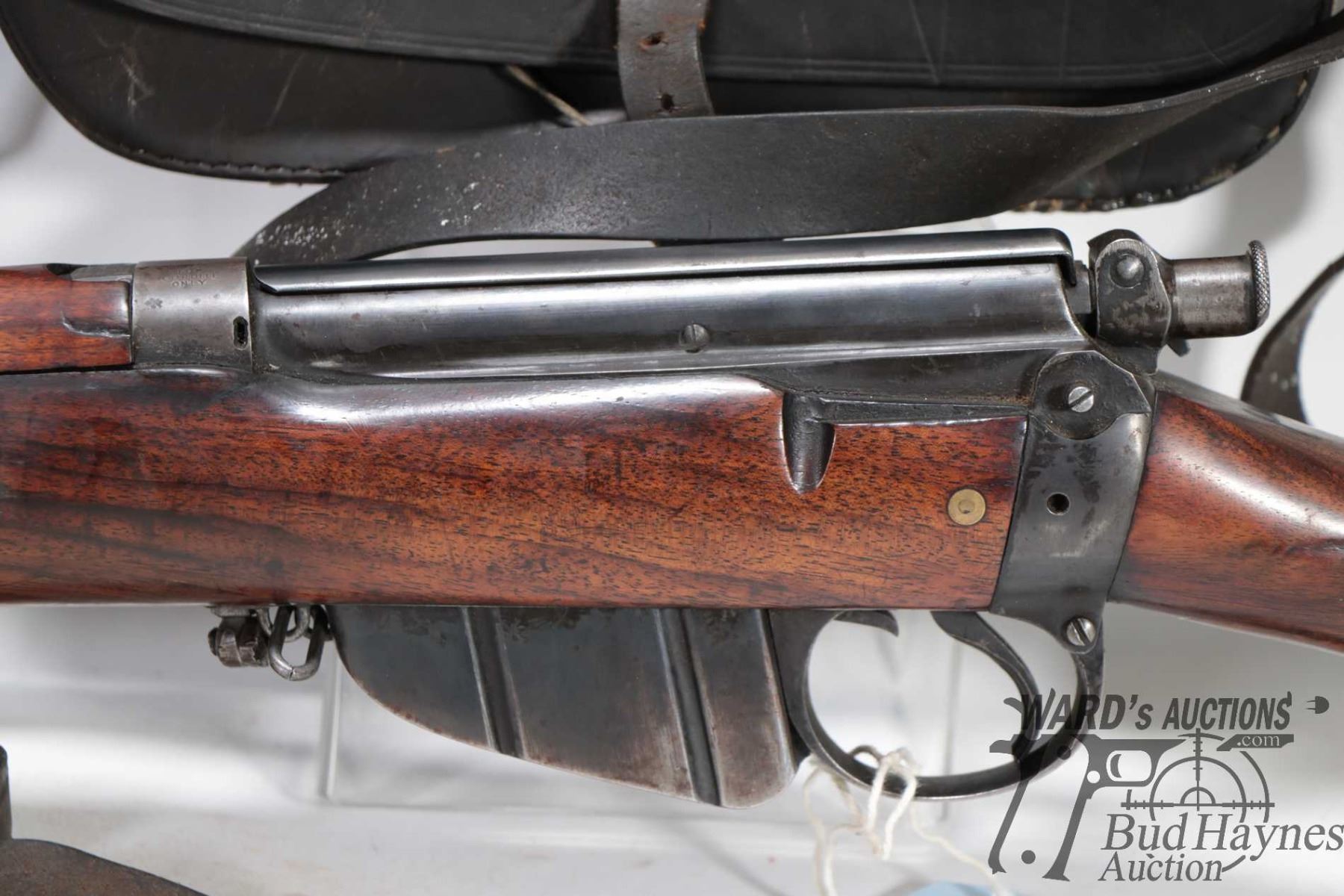 Non-Restricted rifle B.S.A. model Gibbs Lee Metford, .303 British ten shot bolt action, w/ bbl length 30" [Blued barrel and receiver. Fixed front and adjustable rear sights. Full wood stock with brass butt plate. Includes one detachable magazine and leather sling. Matching serial number on receiver and bolt. Other markings include "GIBBS, BRISTOL & LONDON' on top of barrel, 'FOR CORDITE ONLY" serial number and proof marks on top of receiver "B.S.A. CO." on right side of band, electric pencil 'M54350" on trigger guard. Fitted with Magazine cut-off and volley sight, although rear volley sight piece is missing. Mechanically appears near excellent. -This historically significant firearms was purportedly given as a prize as evident by the silver inset medallion on right side of stock from Birmingham Small Arms during the Bisley 1904 shooting Competition ( Bisley, Surrey England), note area on medallion given for the winner's name was never engraved). Also includes 9kt rose gold Maltese cross medallion with guilloche enamel St. George's cross and backside engraved to "2nd V.B.H.L.I ( Volunteer Battalion Highland Light Infantry) Reg. Shooting Club Aggregate Jrs.. Crystal Metal won by Pte. A. Craig B. Coy 1940" and also includes two different bronze NRA medallions each in original fitted boxes branded "ELKINGTON & CO. Medalists and a Scottish Rifle Association patch badge with metal thread and a period appropriate leather shooting satchel. Extremely scarce firearm with a fascinating history. Many hours could be spend in research of both the gun and the man. Wonderful addition to your collection. This collection was consigned by Pte. Coy's step-grandson.] serial # A031522602, PAL required