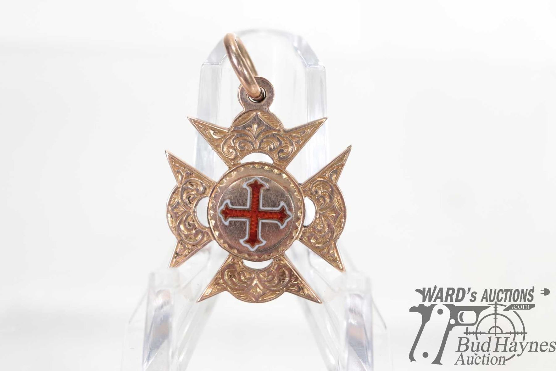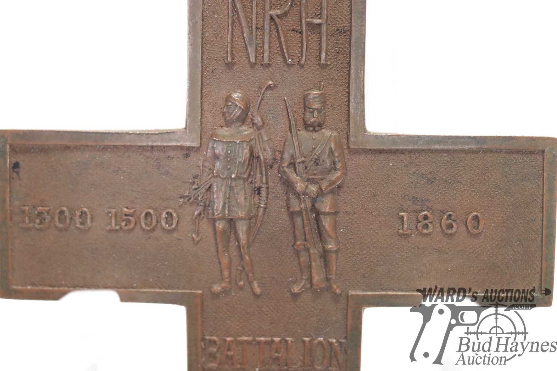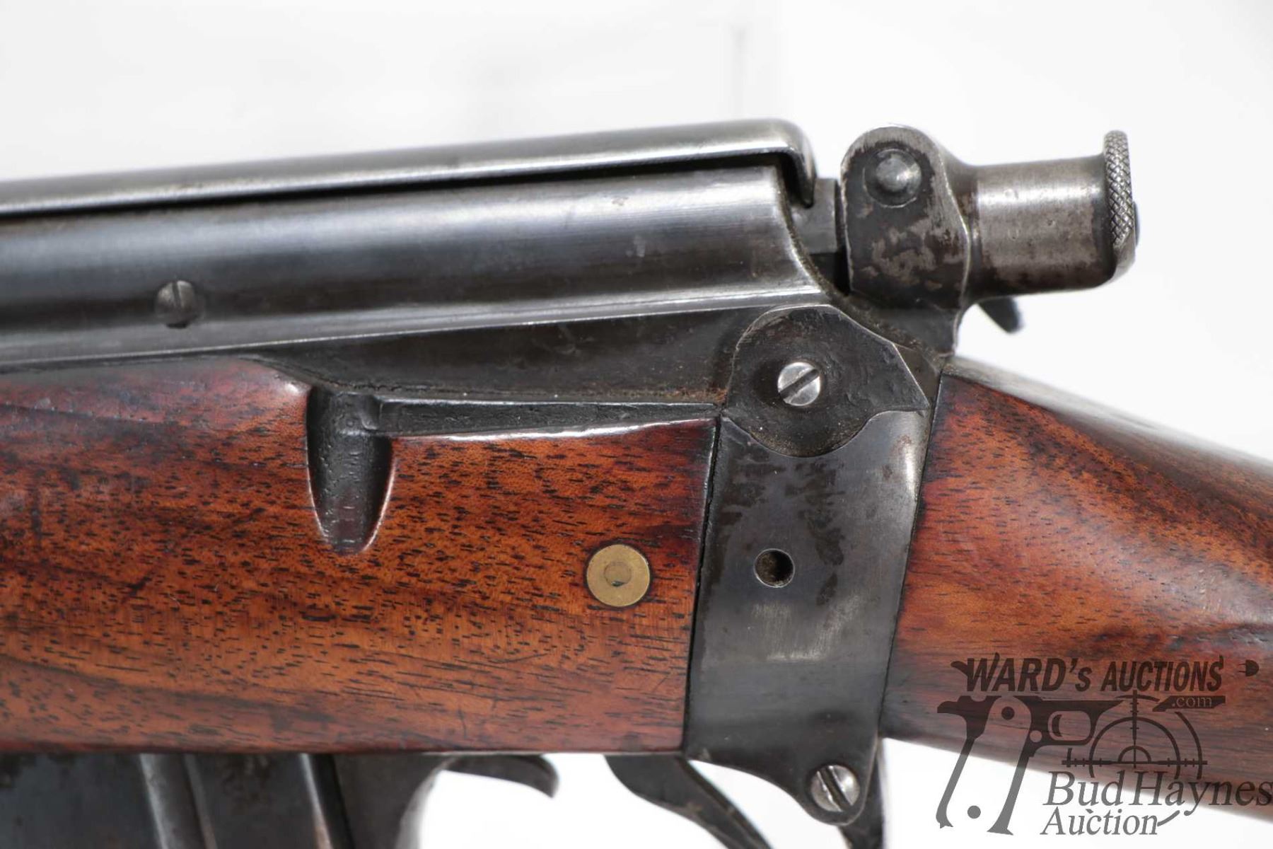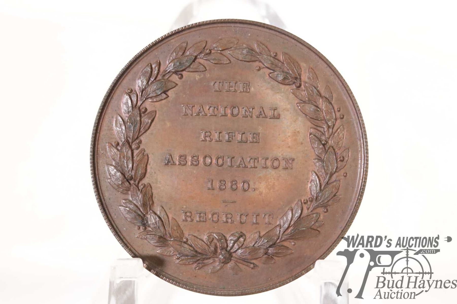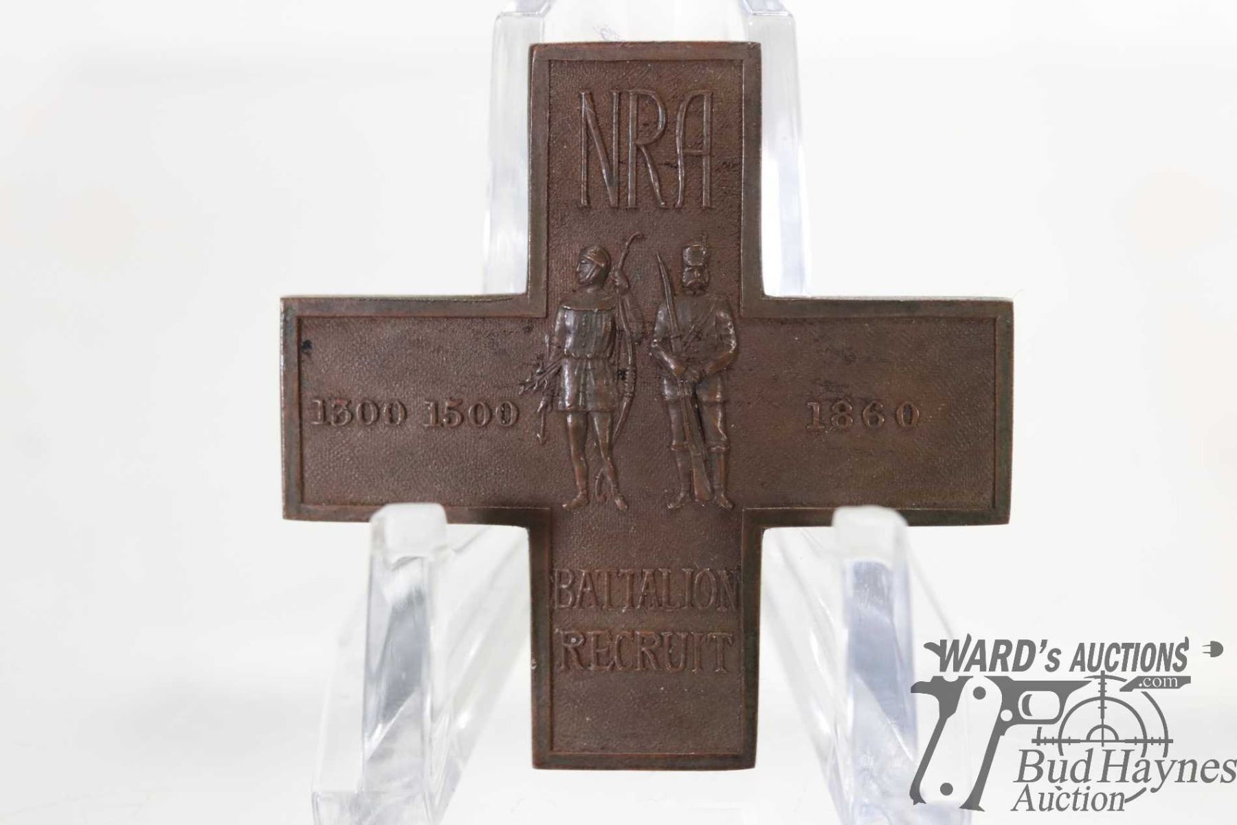 Non-Restricted rifle B.S.A. model Gibbs Lee Metford, .303 British ten shot bolt action, w/ bbl length 30" [Blued barrel and receiver. Fixed front and adjustable rear sights. Full wood stock with brass butt plate. Includes one detachable magazine and leather sling. Matching serial number on receiver and bolt. Other markings include "GIBBS, BRISTOL & LONDON' on top of barrel, 'FOR CORDITE ONLY" serial number and proof marks on top of receiver "B.S.A. CO." on right side of band, electric pencil 'M54350" on trigger guard. Fitted with Magazine cut-off and volley sight, although rear volley sight piece is missing. Mechanically appears near excellent. -This historically significant firearms was purportedly given as a prize as evident by the silver inset medallion on right side of stock from Birmingham Small Arms during the Bisley 1904 shooting Competition ( Bisley, Surrey England), note area on medallion given for the winner's name was never engraved). Also includes 9kt rose gold Maltese cross medallion with guilloche enamel St. George's cross and backside engraved to "2nd V.B.H.L.I ( Volunteer Battalion Highland Light Infantry) Reg. Shooting Club Aggregate Jrs.. Crystal Metal won by Pte. A. Craig B. Coy 1940" and also includes two different bronze NRA medallions each in original fitted boxes branded "ELKINGTON & CO. Medalists and a Scottish Rifle Association patch badge with metal thread and a period appropriate leather shooting satchel. Extremely scarce firearm with a fascinating history. Many hours could be spend in research of both the gun and the man. Wonderful addition to your collection. This collection was consigned by Pte. Coy's step-grandson.] serial # A031522602, PAL required