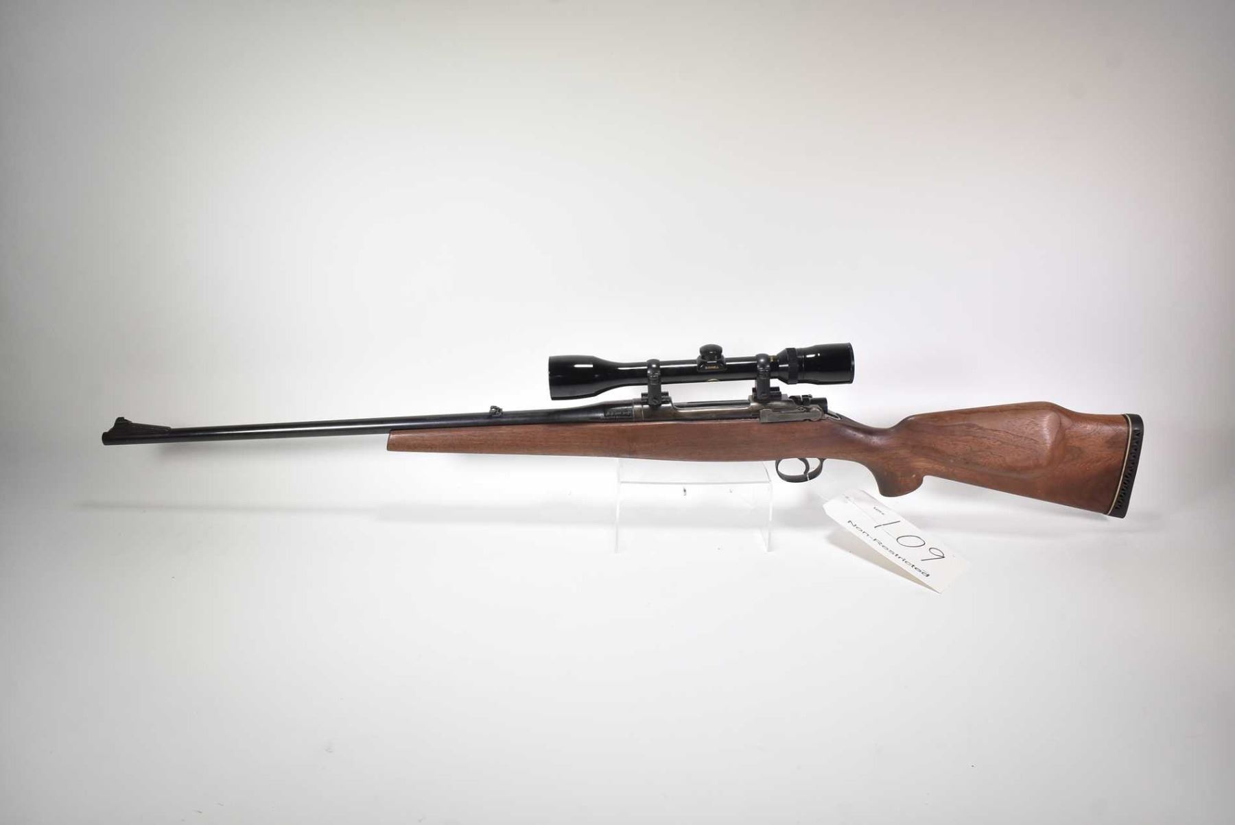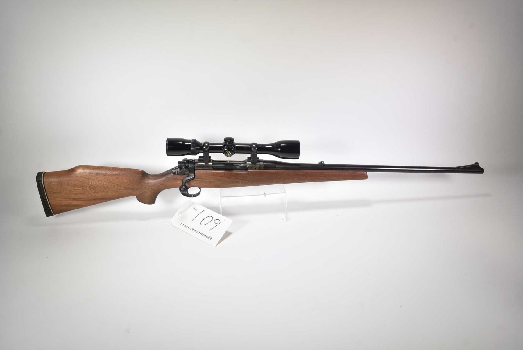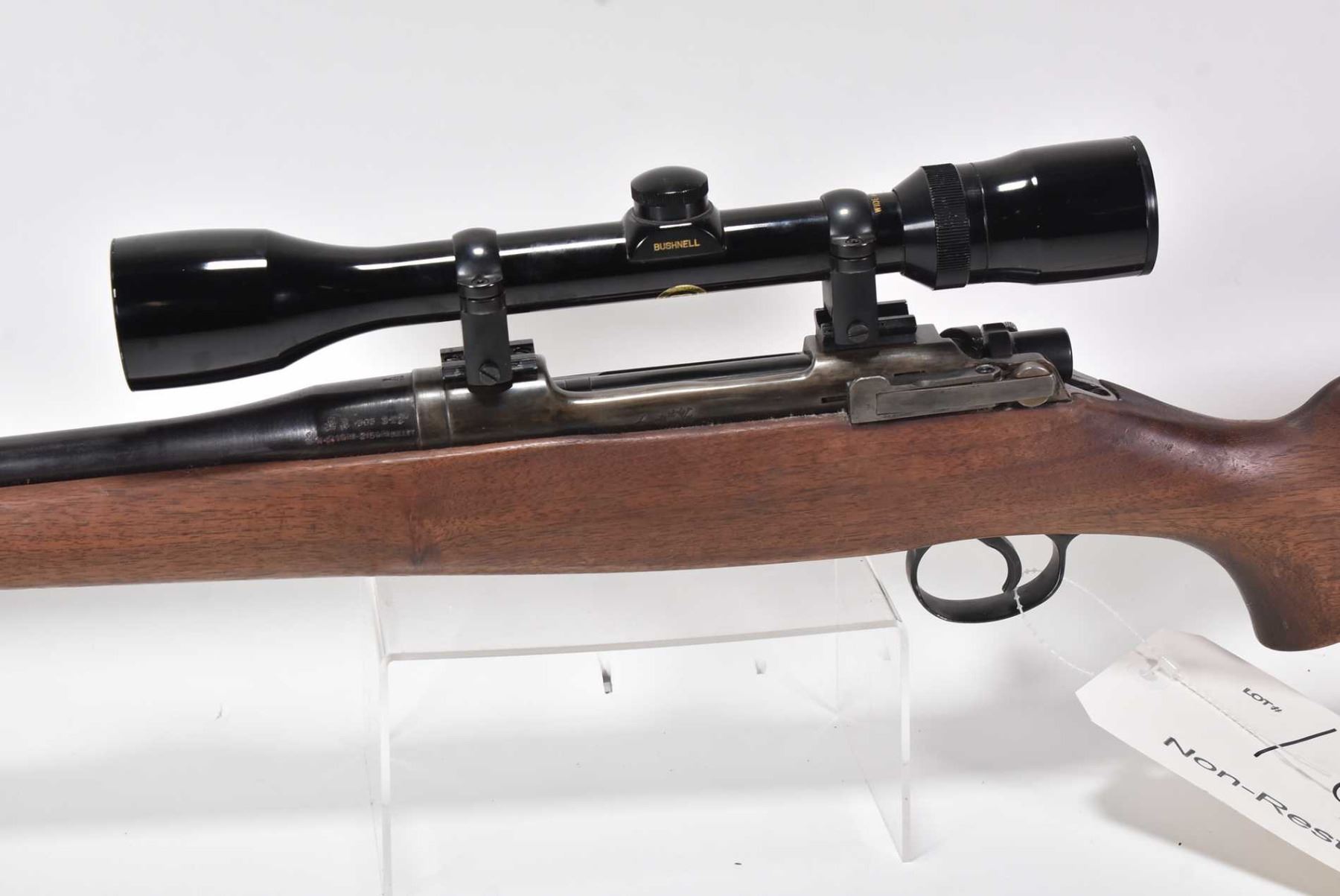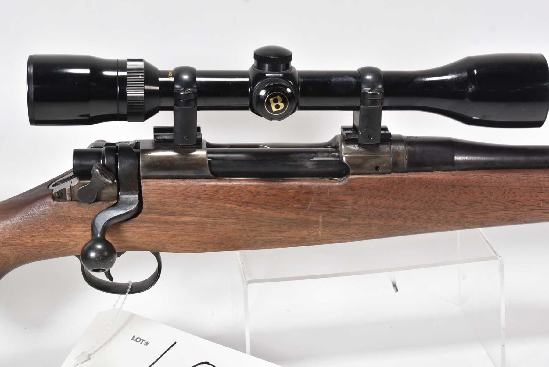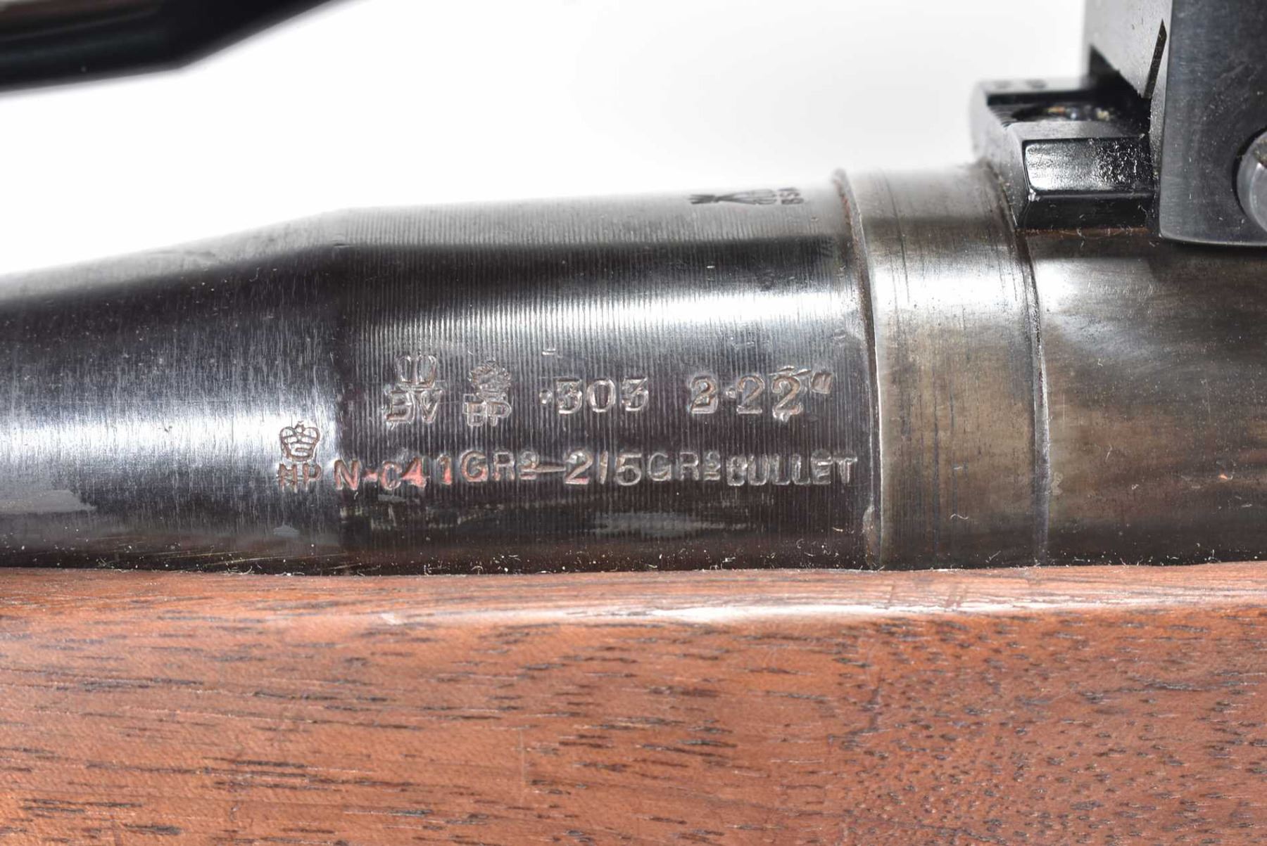 Non-Restricted rifle BSA 303 Mag fed bolt action, w/ bbl length 24" [Blued barrel and receiver, fixed front and adjustable rear sight, fitted with Bushnell wide angle scope, smooth wooden sporterized stock, Pachmyr recoil pad, top of barrel stamped "Made By The Birmingham Small Arms Co. England" in front of rear sight, rear of barrel stamped with assorted proof marks and BSA logo, left side of receiver stamped with assorted proof marks-see photos. Assorted use, storage and handling marks on wood and metal.] serial # 44293, PAL required
