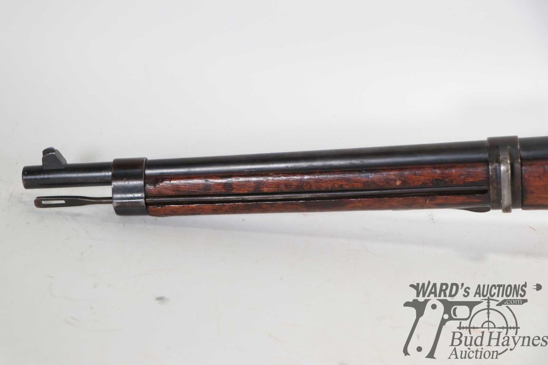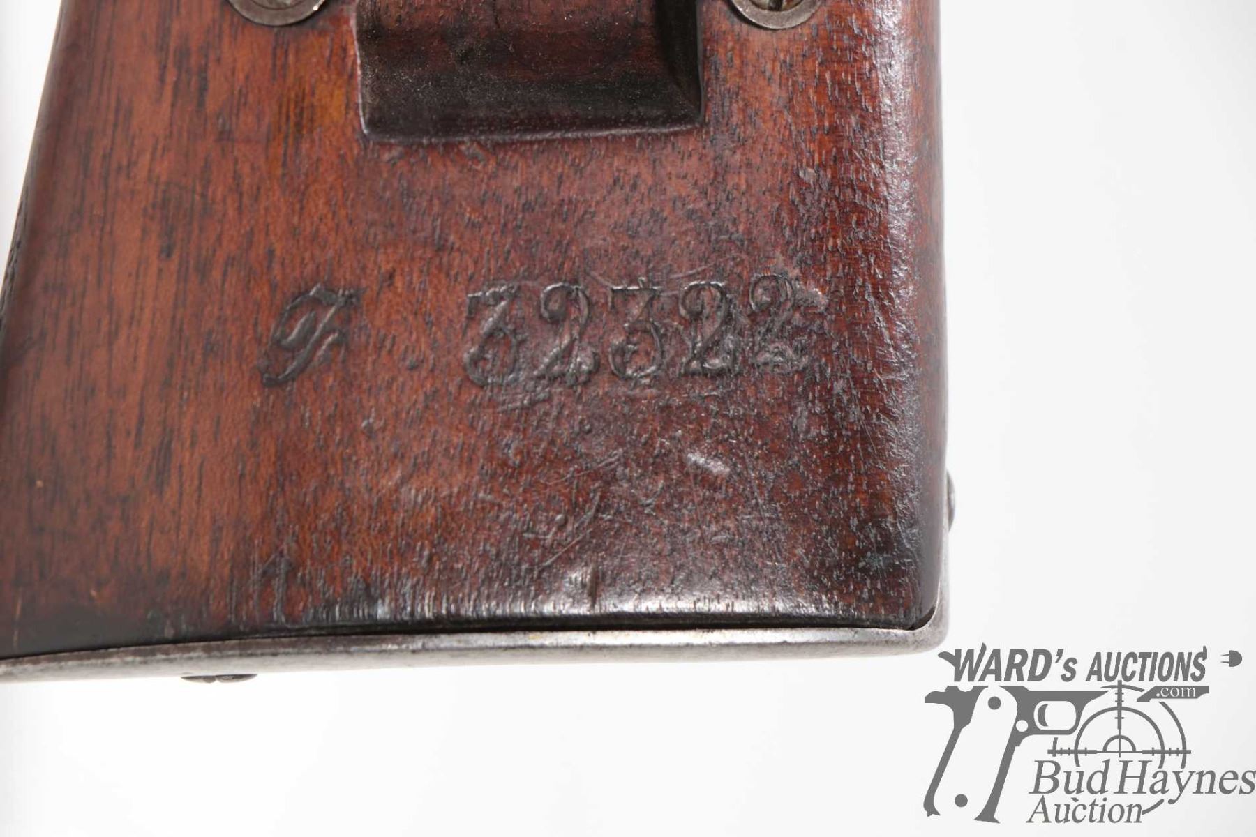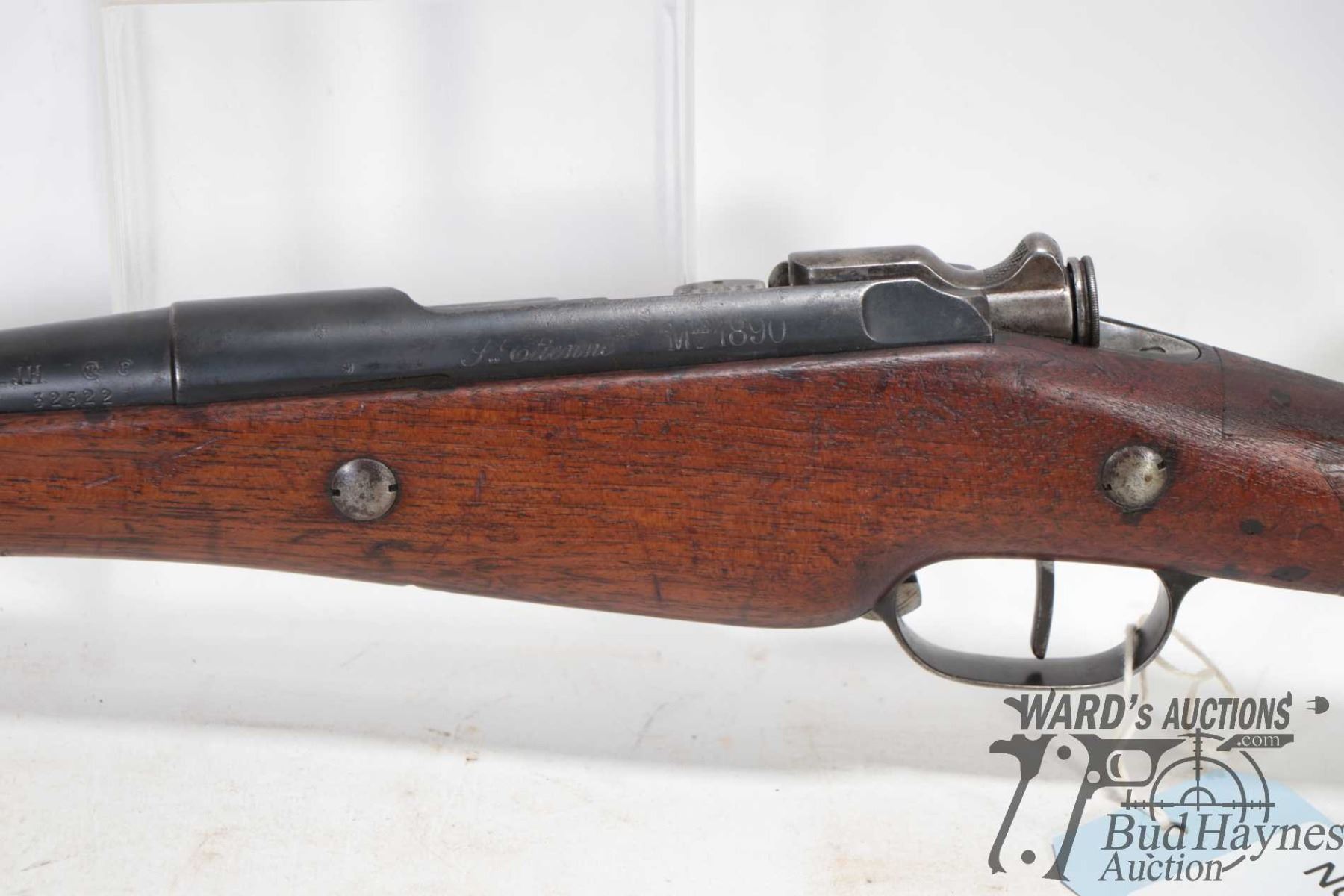 Non-Restricted rifle Berthier model MLE 1890, 8mm bolt action, w/ bbl length 18" [Blued barrel and receiver. Fixed front and adjustable rear sights. Full wood stock with metal butt plate. Fitted with sling rings. Includes cleaning rod. Matching serial numbers seen on receiver, bolt, mag base and stock. Other markings including "MA S 1891" on right side of stock, 'JH" and assorted proof marks on left side of barrel etc. Mechanically appears to function well. Bluing worn in use and handling areas. Stock has had old repairs including large crack and replacement pieces to strong hand grip areas and other use, handling and storage marks.] serial # 32322, PAL required