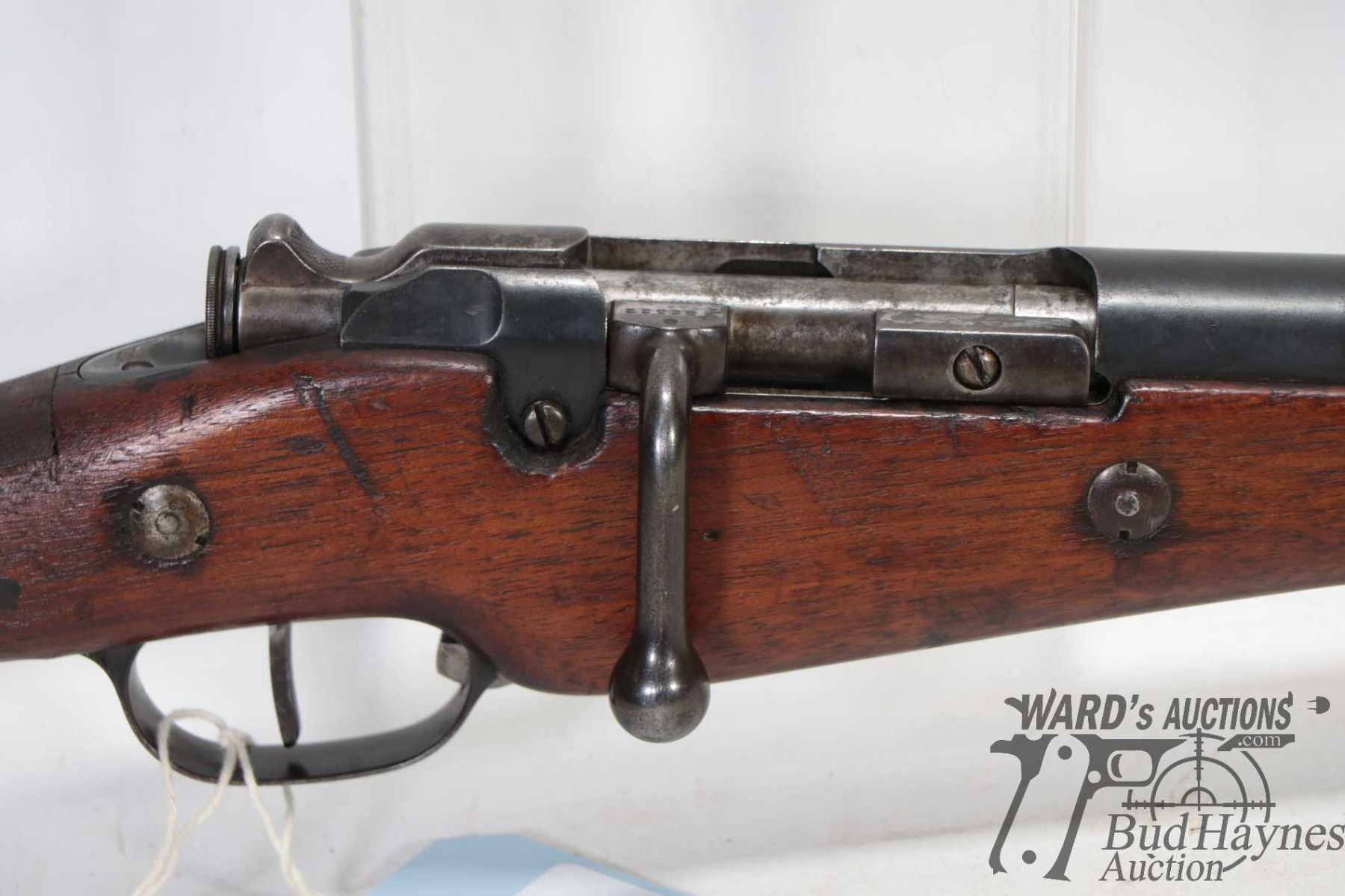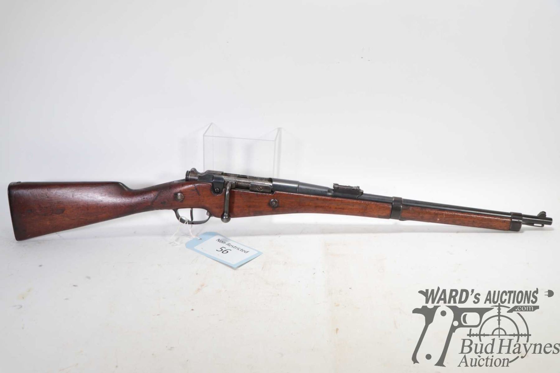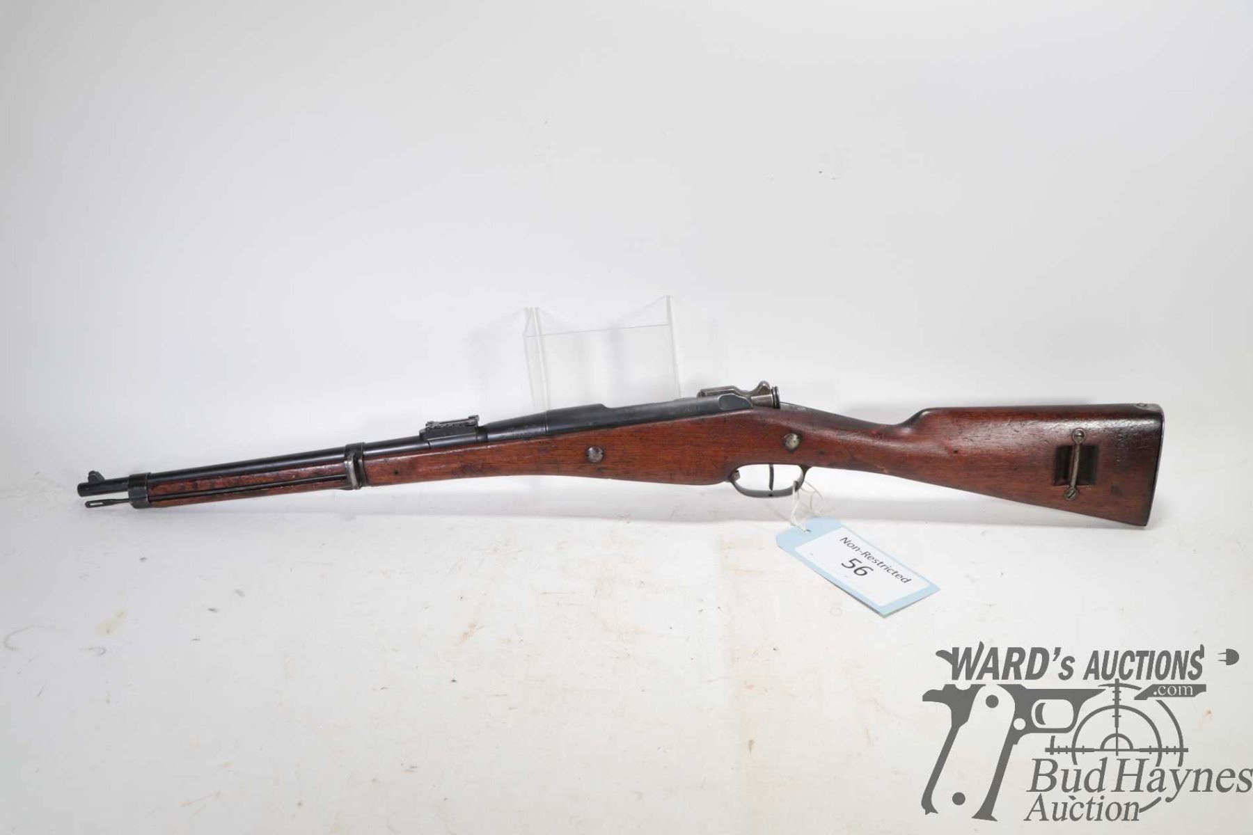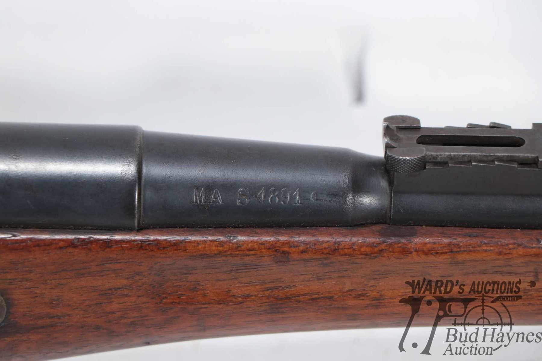 Non-Restricted rifle Berthier model MLE 1890, 8mm bolt action, w/ bbl length 18" [Blued barrel and receiver. Fixed front and adjustable rear sights. Full wood stock with metal butt plate. Fitted with sling rings. Includes cleaning rod. Matching serial numbers seen on receiver, bolt, mag base and stock. Other markings including "MA S 1891" on right side of stock, 'JH" and assorted proof marks on left side of barrel etc. Mechanically appears to function well. Bluing worn in use and handling areas. Stock has had old repairs including large crack and replacement pieces to strong hand grip areas and other use, handling and storage marks.] serial # 32322, PAL required