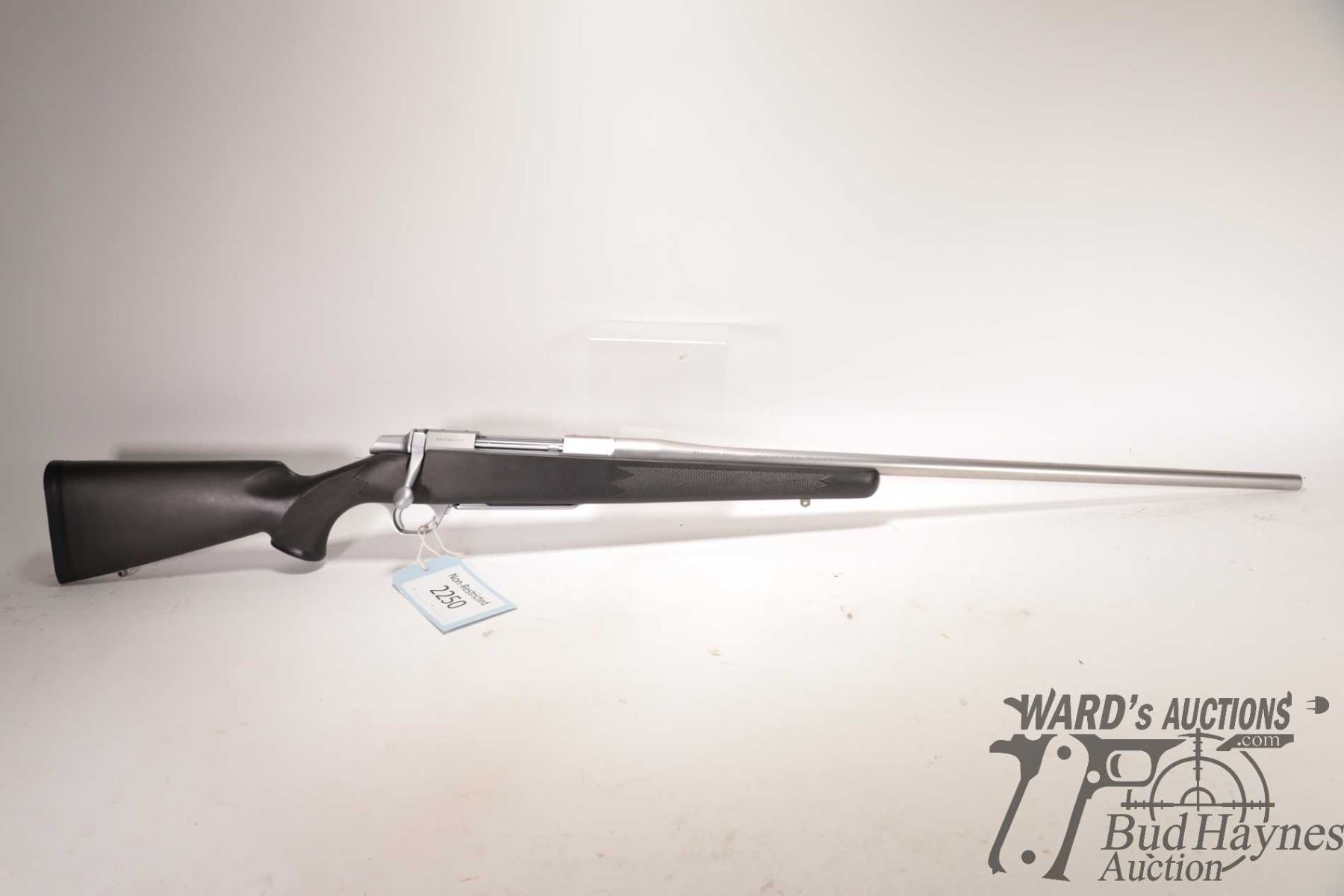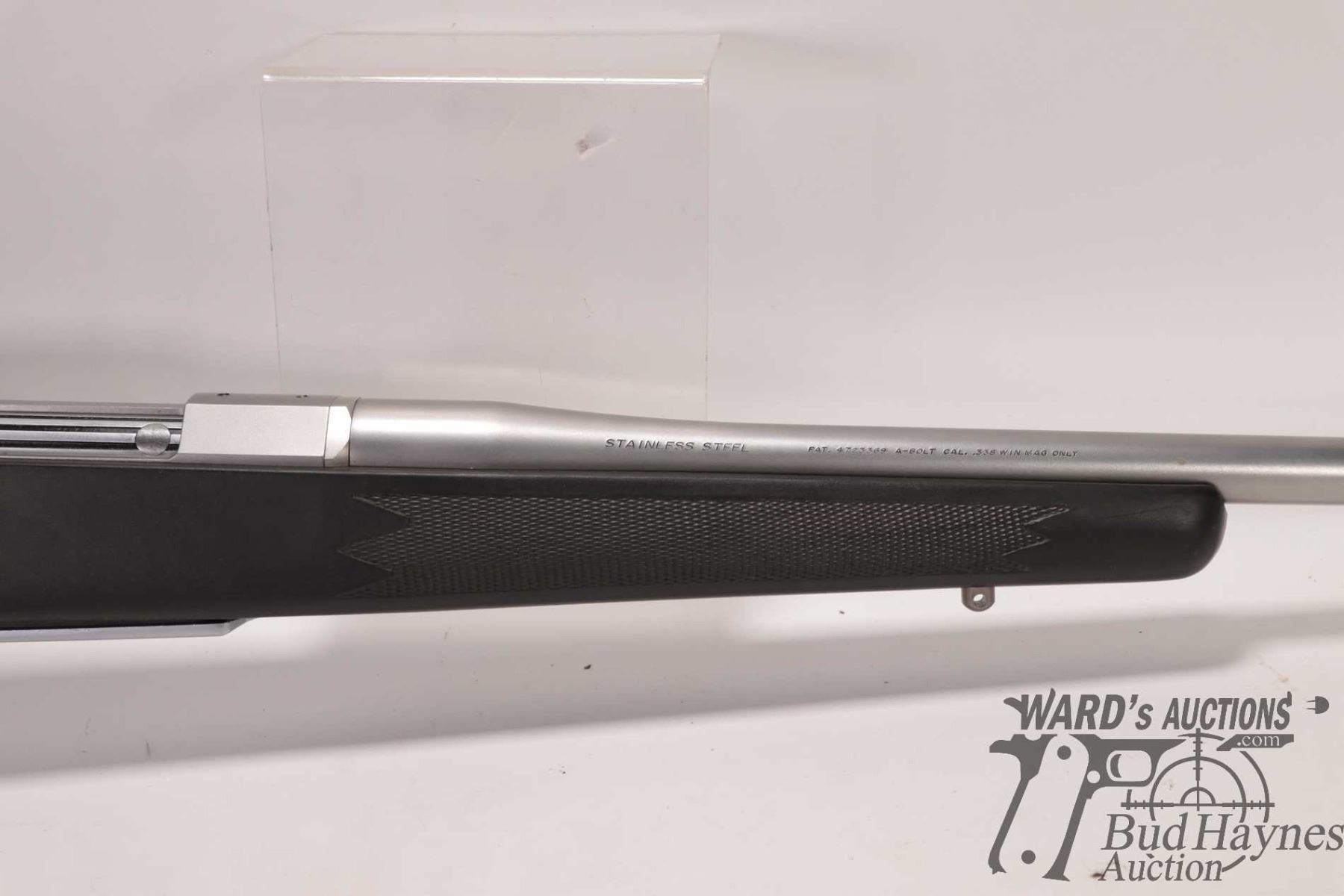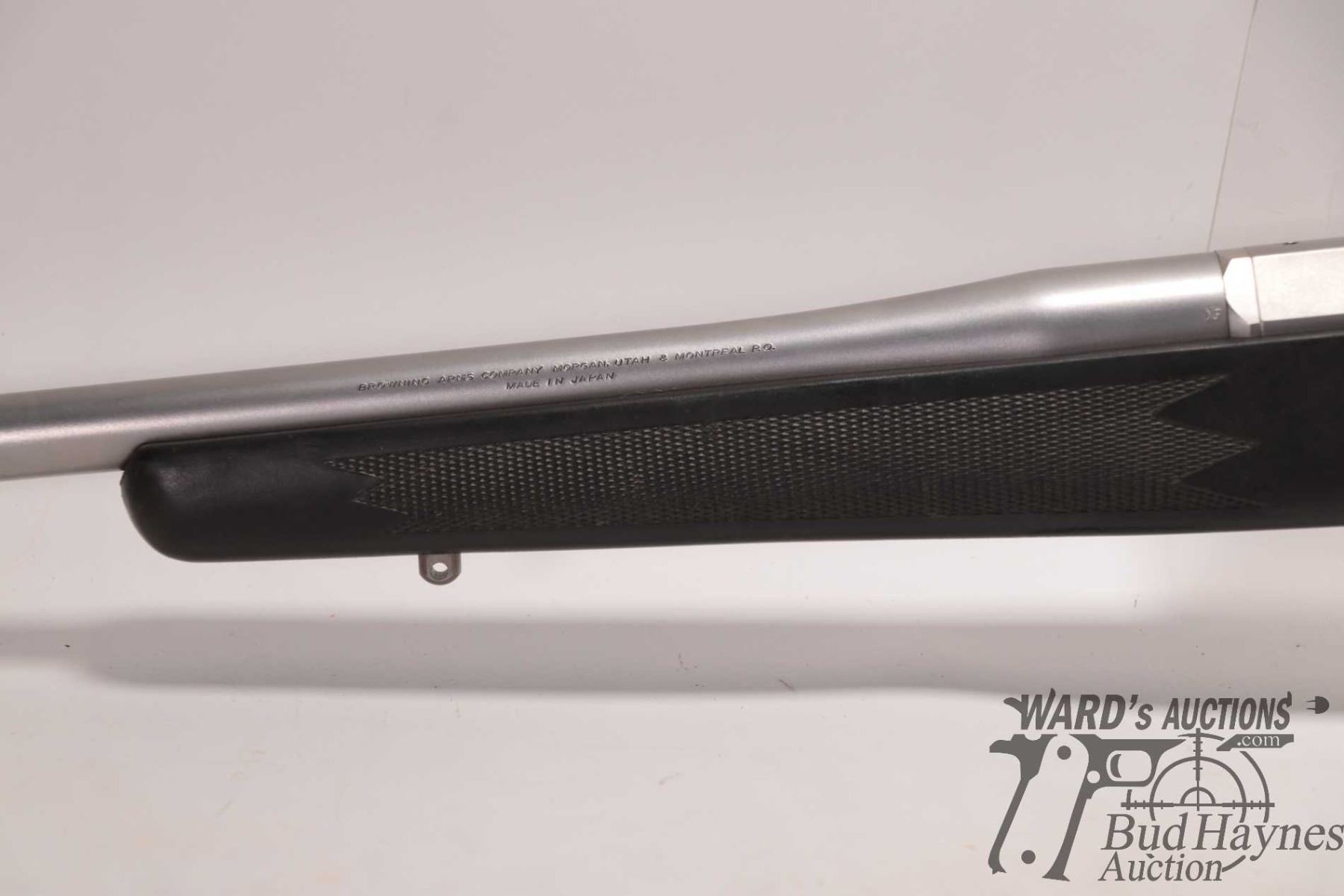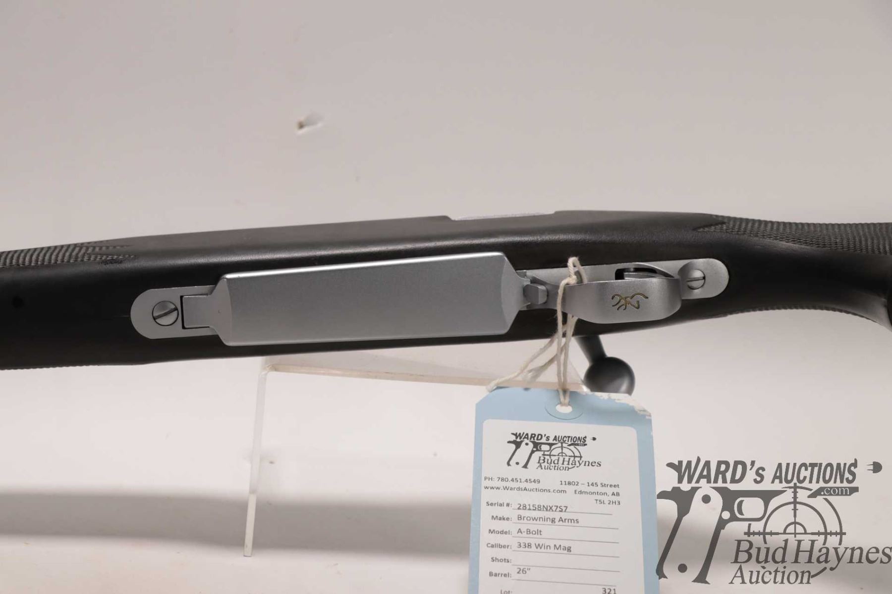 Non-Restricted rifle Browning Japan model A-Bolt, 338 Win Mag bolt action, w/ bbl length 26" [Satin stainless barrel and receiver. No fixed sights. Includes two internal/ detachable box magazines. Black synthetic stock with branded recoil pad. Mechanically appears near excellent with only minor use, handling and storage marks.] serial # 28158NX7S7, PAL required