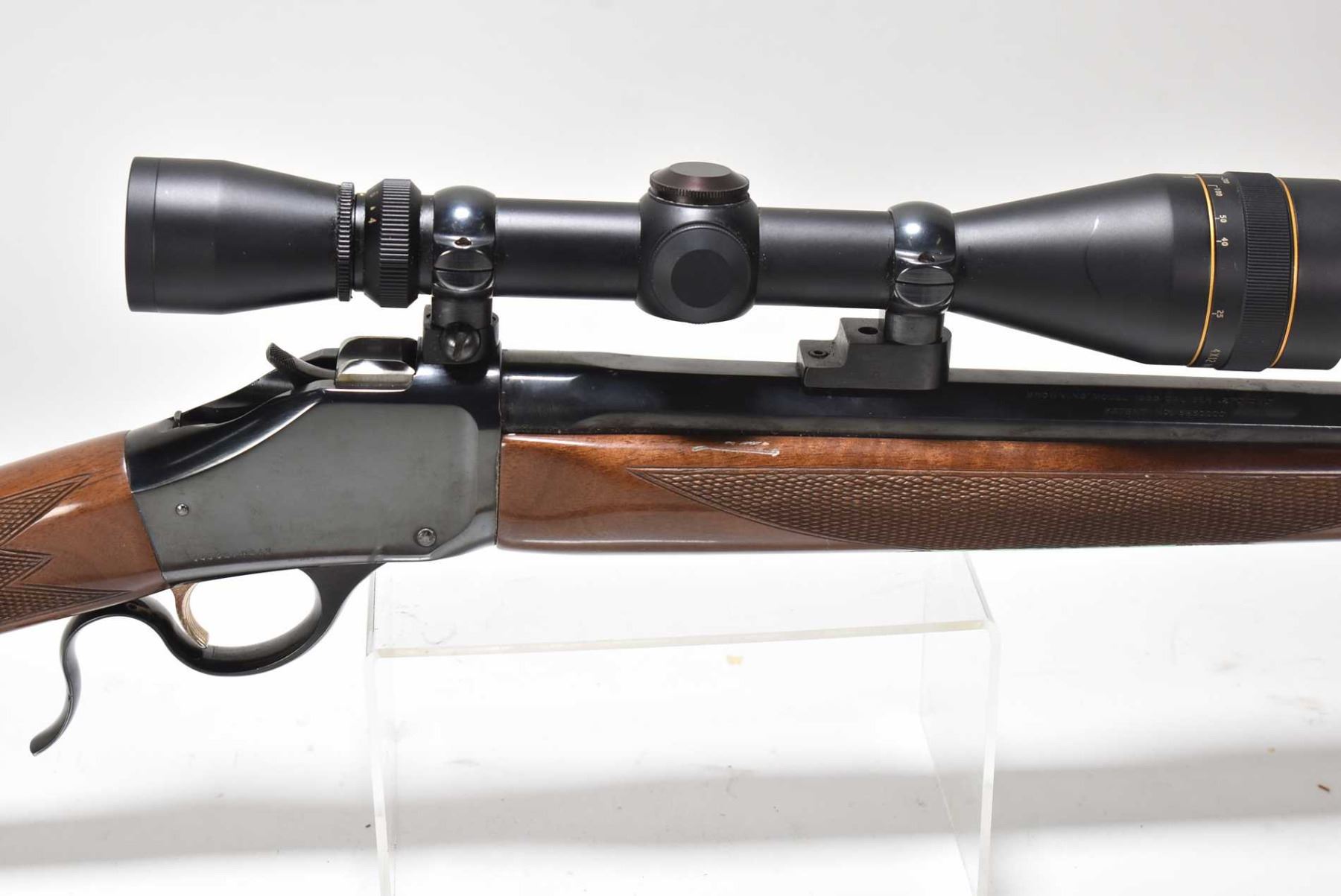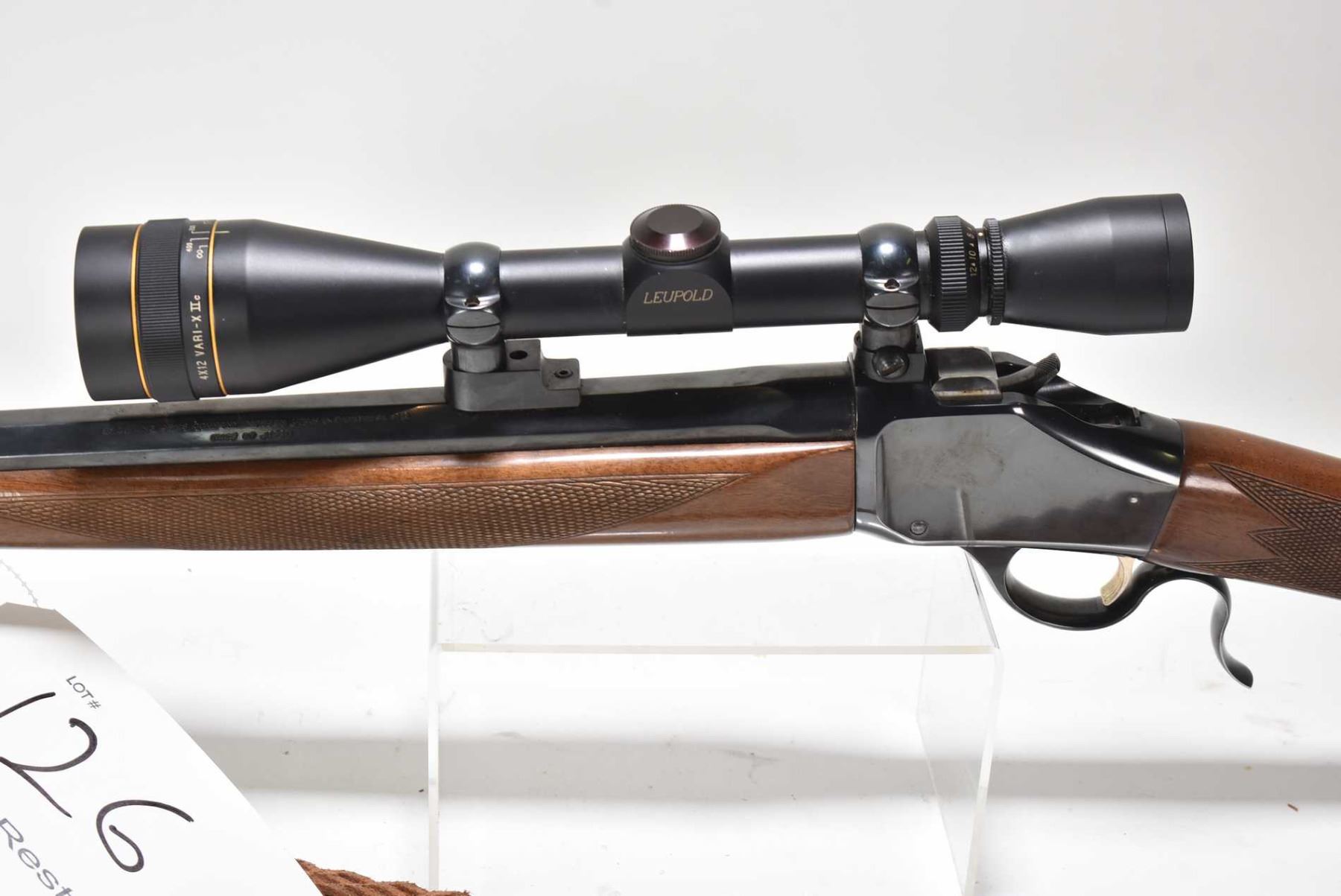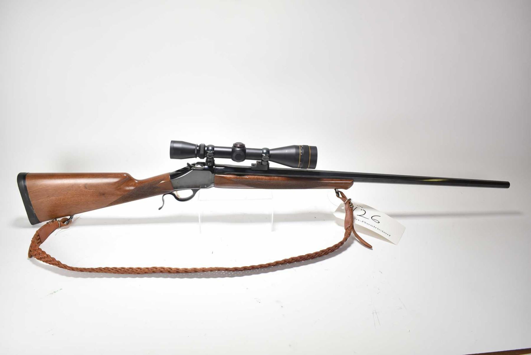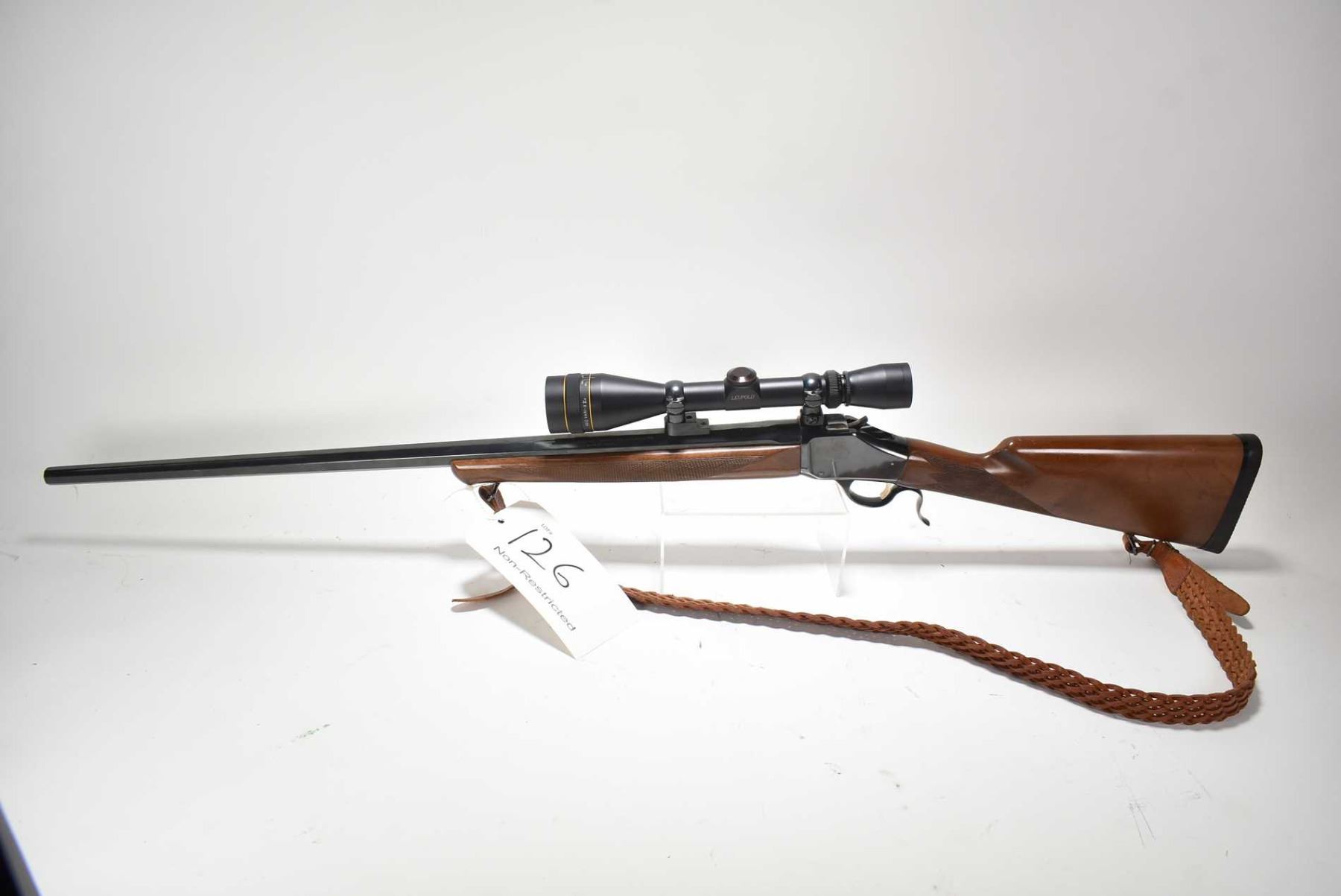 Non-Restricted rifle Browning model 1885, .270 cal single shot falling block, w/ bbl length 28" [Blued octagonal barrel and receiver, no fixed sights, fitted with Leupold 4x12 Vari-X IIc scope SNY143861, straight walnut stock with checkered grip and forend, braided leather sling. Appears to have had light use. Use and handling marks on wood and metal.] serial # 05362PV247, PAL required