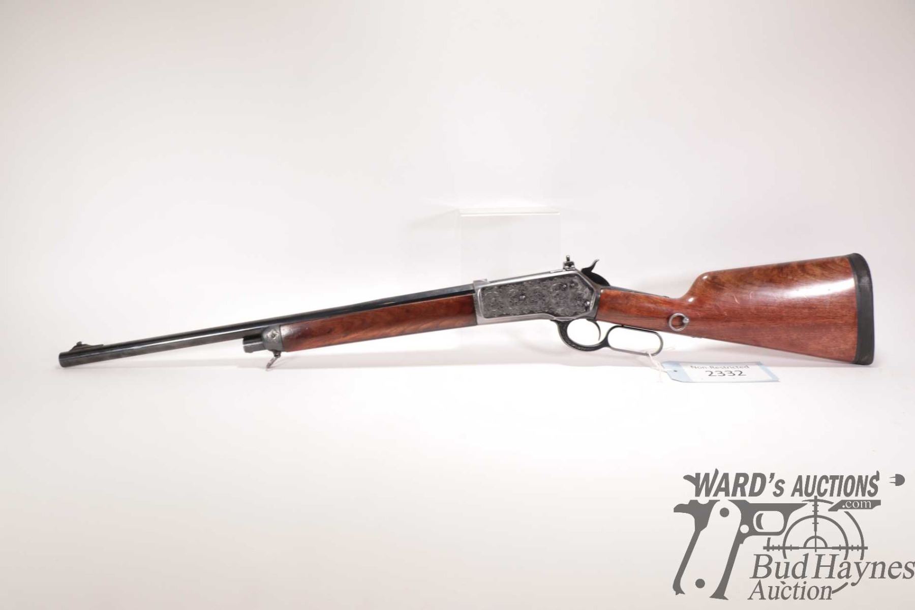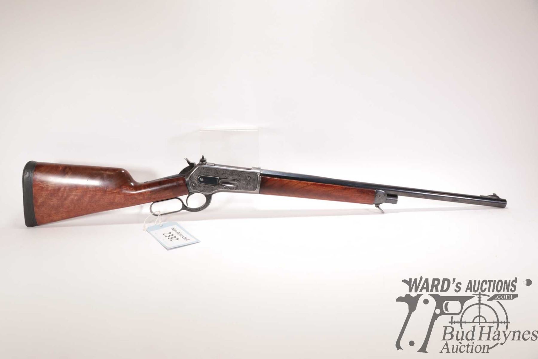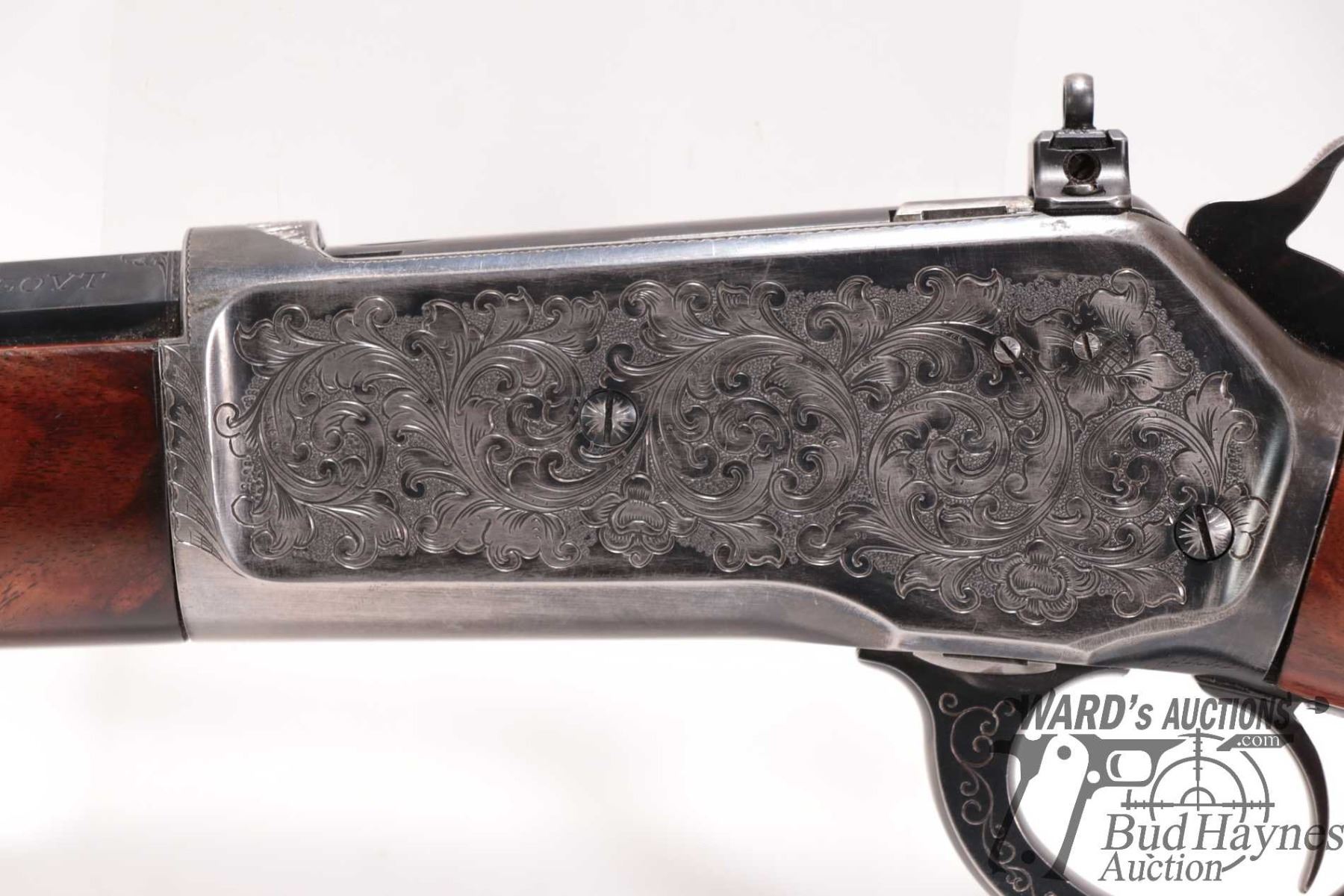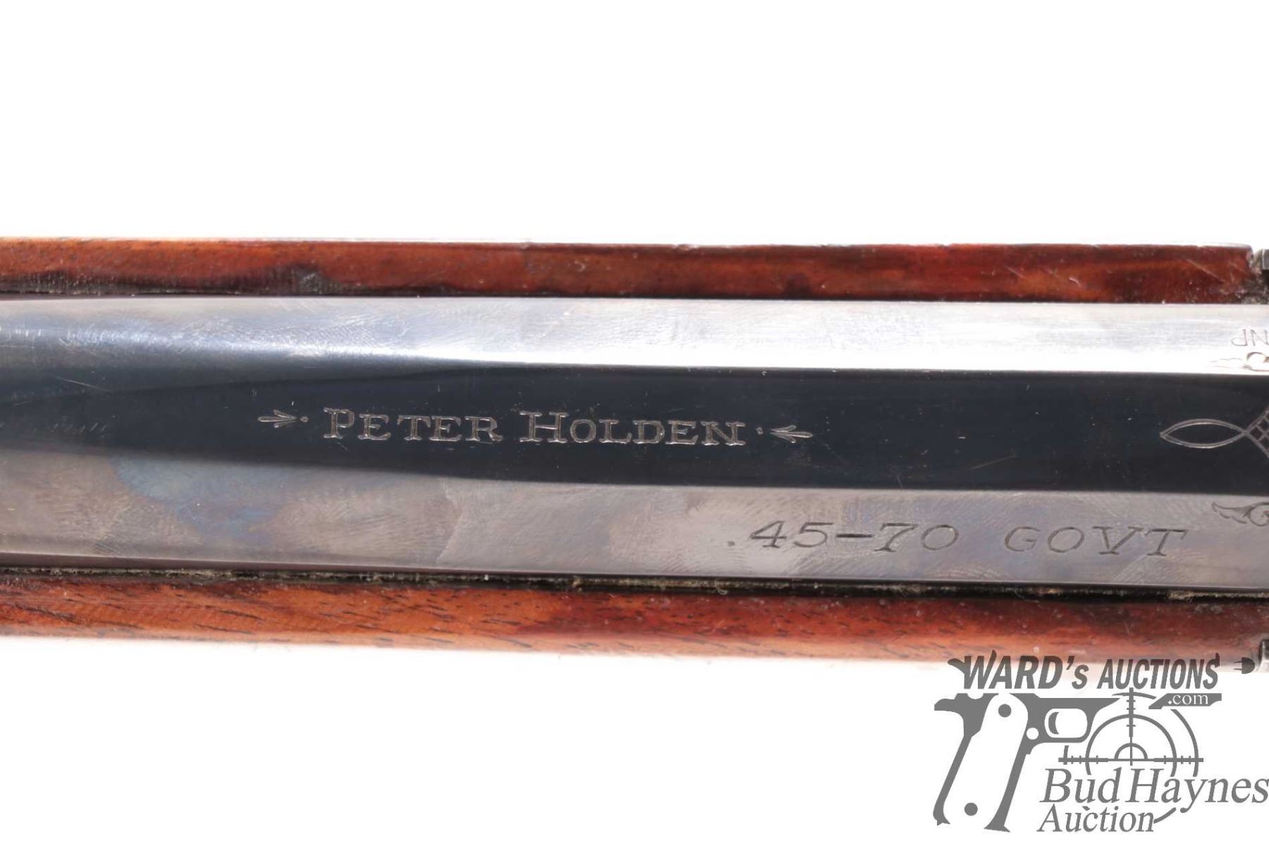 Non-Restricted rifle Browning model 1886 ( Peter Holden), .45-70 Govt. lever action, w/ bbl length 21 1/2" [Blued barrel and receiver. Fixed front sight. Original barrel mount rear sight removed and filled. Fitted with rear peep sight. Half length tubular magazine. Oversize hardwood stock with recoil pad. Beautifully custom hand engraving on receiver, lever, forend cap etc. and top of barrel marked "PETER HOLDEN', presumed to be owner who commissioned engraving. Mechanically appears near excellent. Bluing worn predominantly on receiver, which in contrast to the receiver shows wonderful patina.] serial # 04511PT197, PAL required