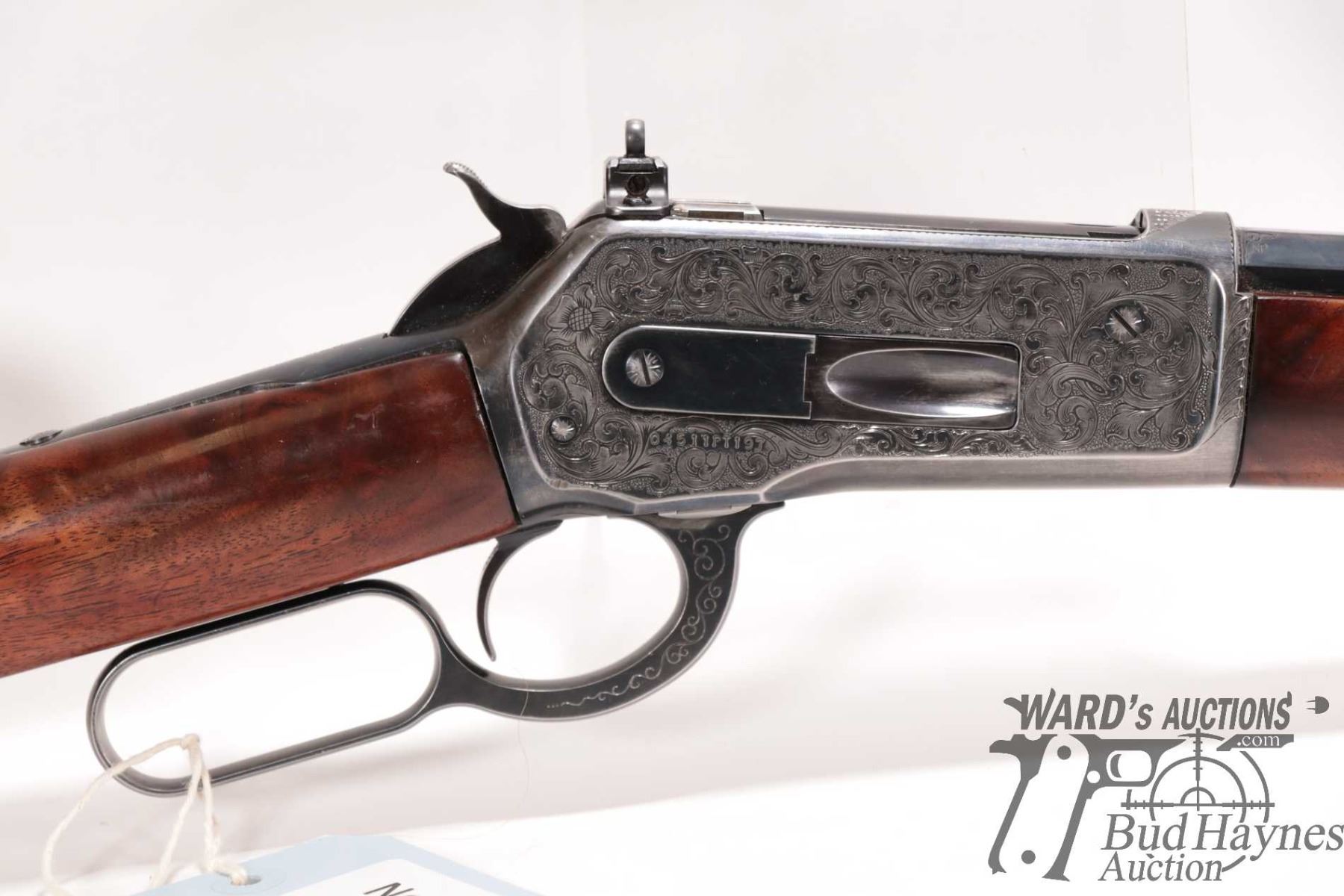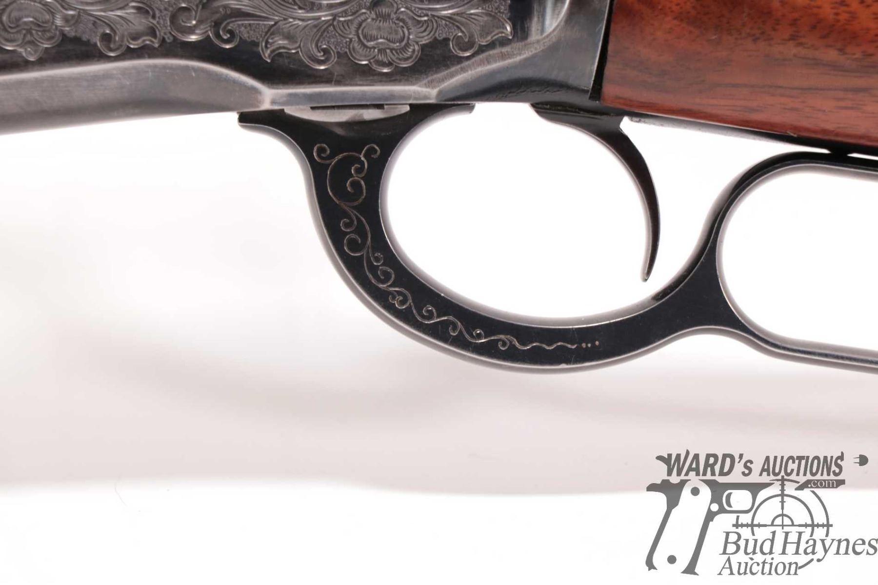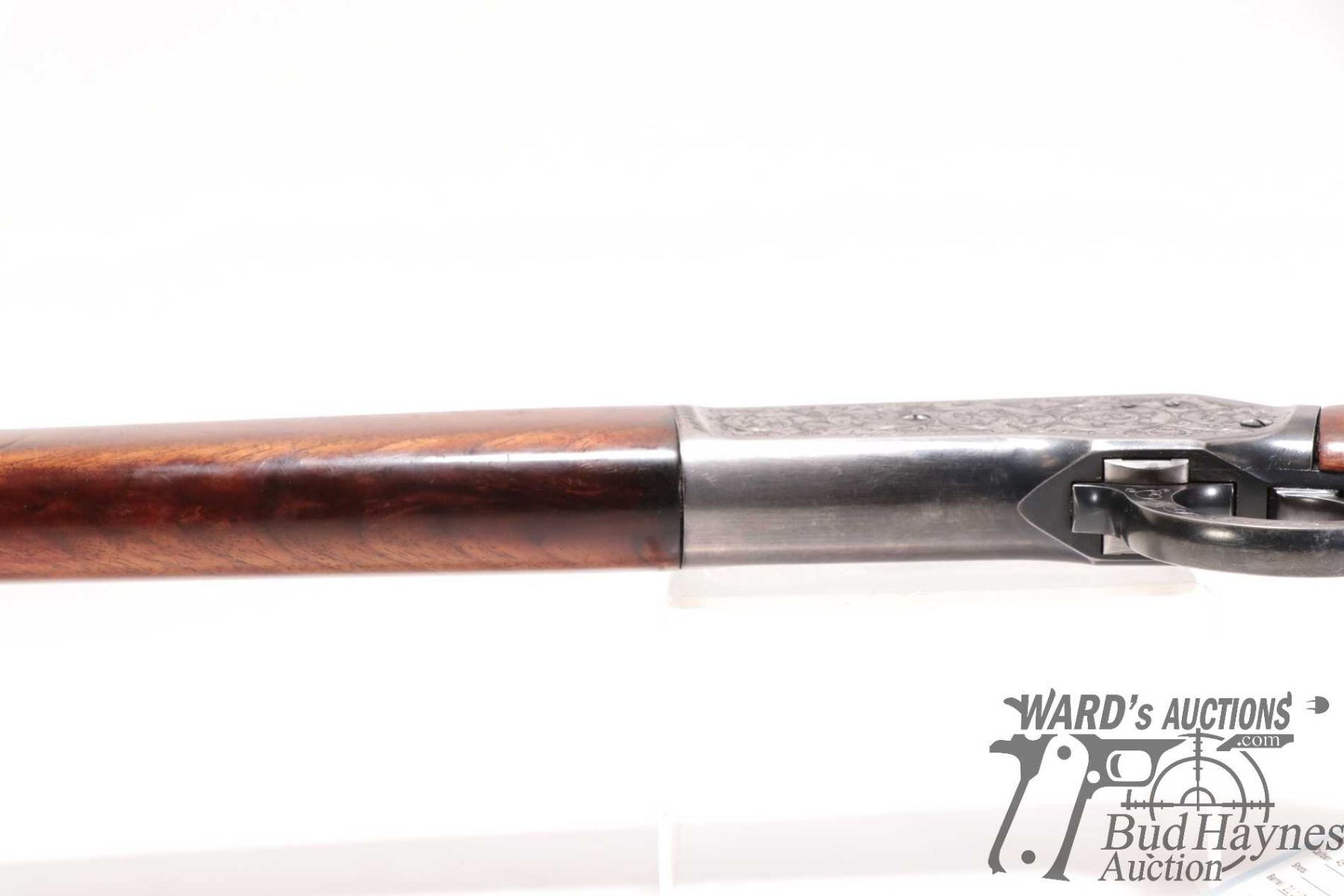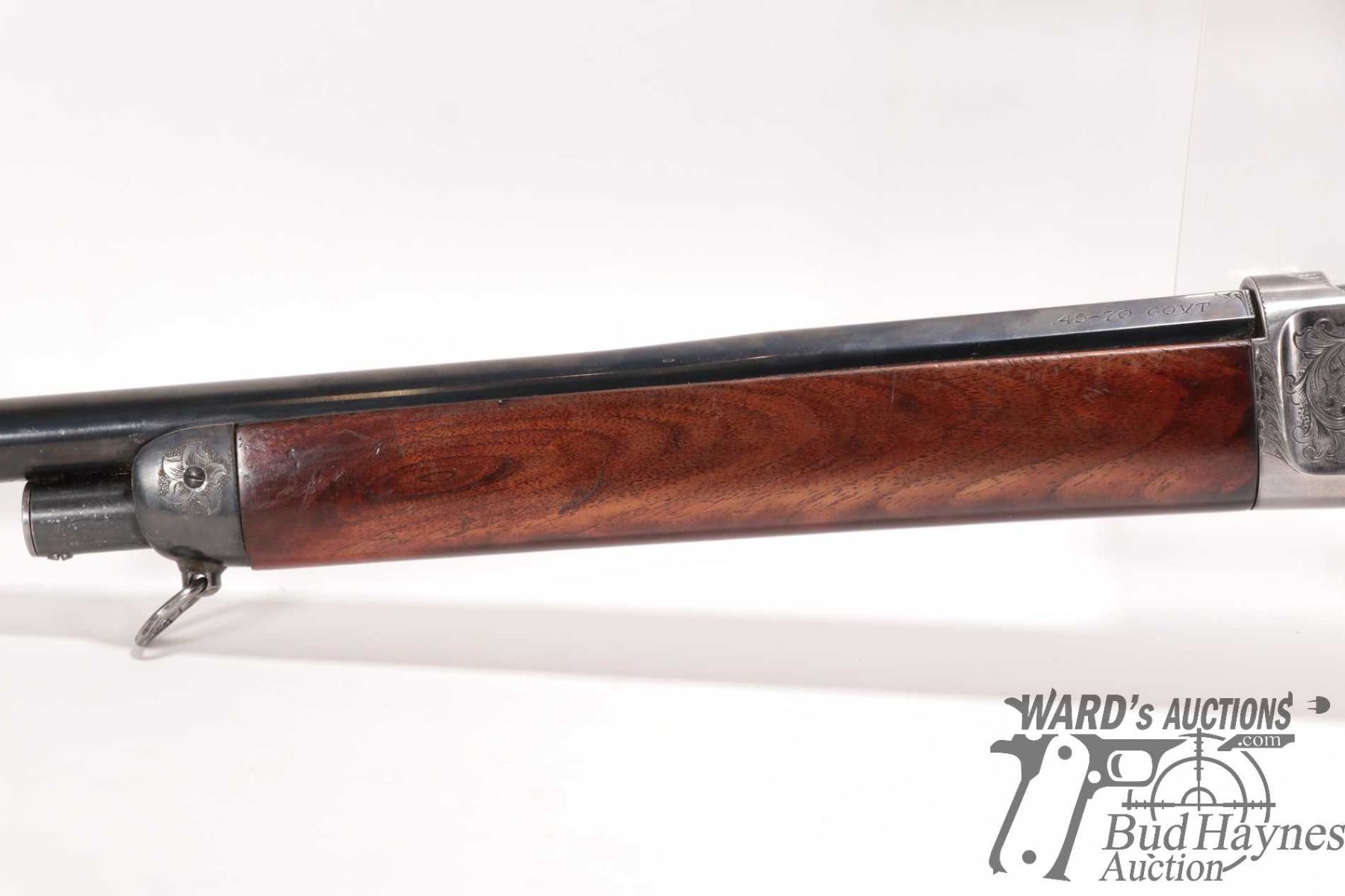 Non-Restricted rifle Browning model 1886 ( Peter Holden), .45-70 Govt. lever action, w/ bbl length 21 1/2" [Blued barrel and receiver. Fixed front sight. Original barrel mount rear sight removed and filled. Fitted with rear peep sight. Half length tubular magazine. Oversize hardwood stock with recoil pad. Beautifully custom hand engraving on receiver, lever, forend cap etc. and top of barrel marked "PETER HOLDEN', presumed to be owner who commissioned engraving. Mechanically appears near excellent. Bluing worn predominantly on receiver, which in contrast to the receiver shows wonderful patina.] serial # 04511PT197, PAL required