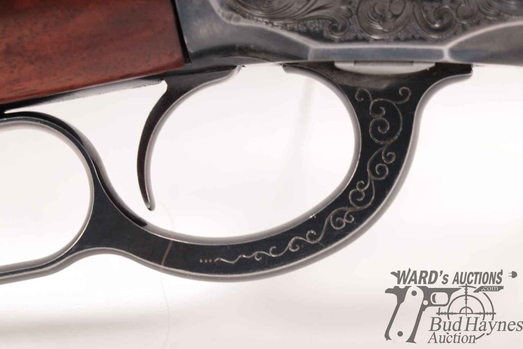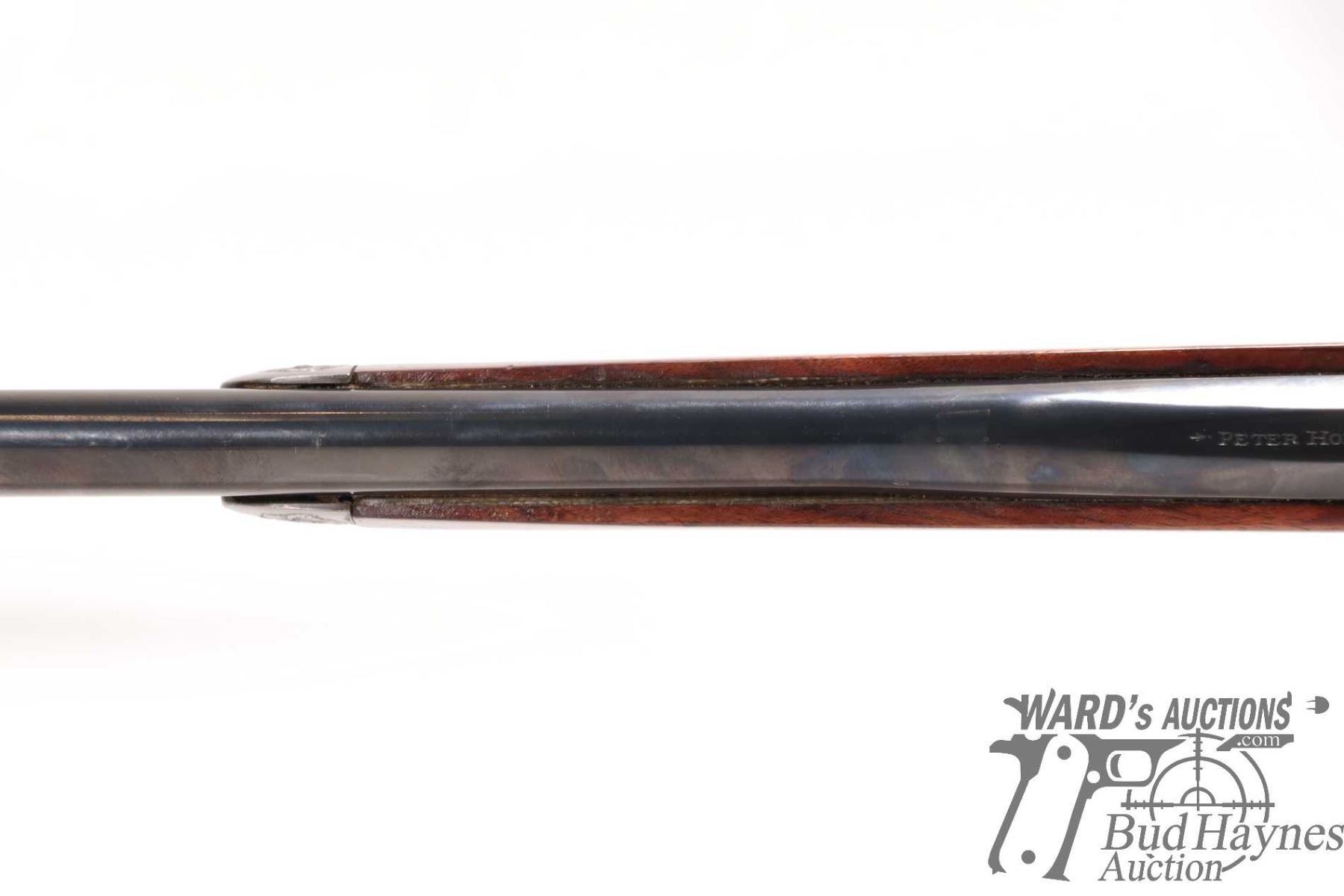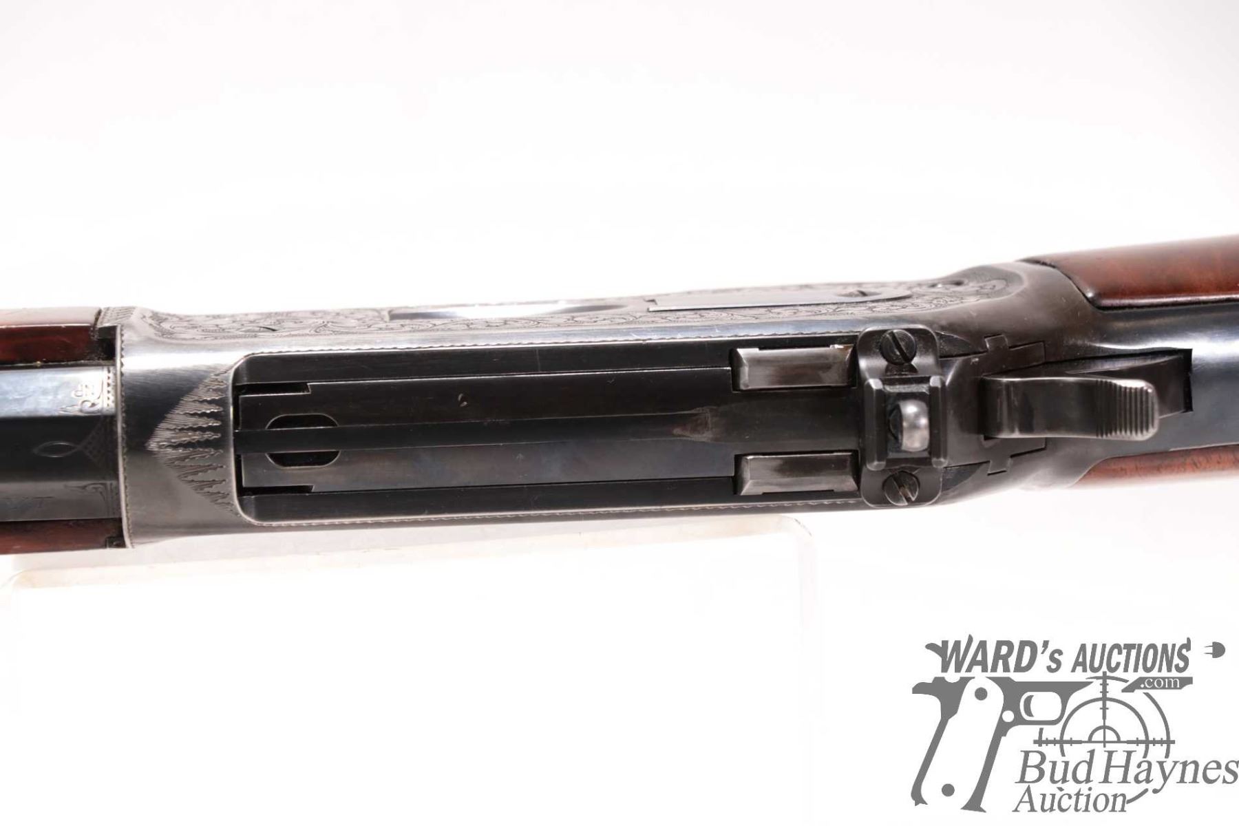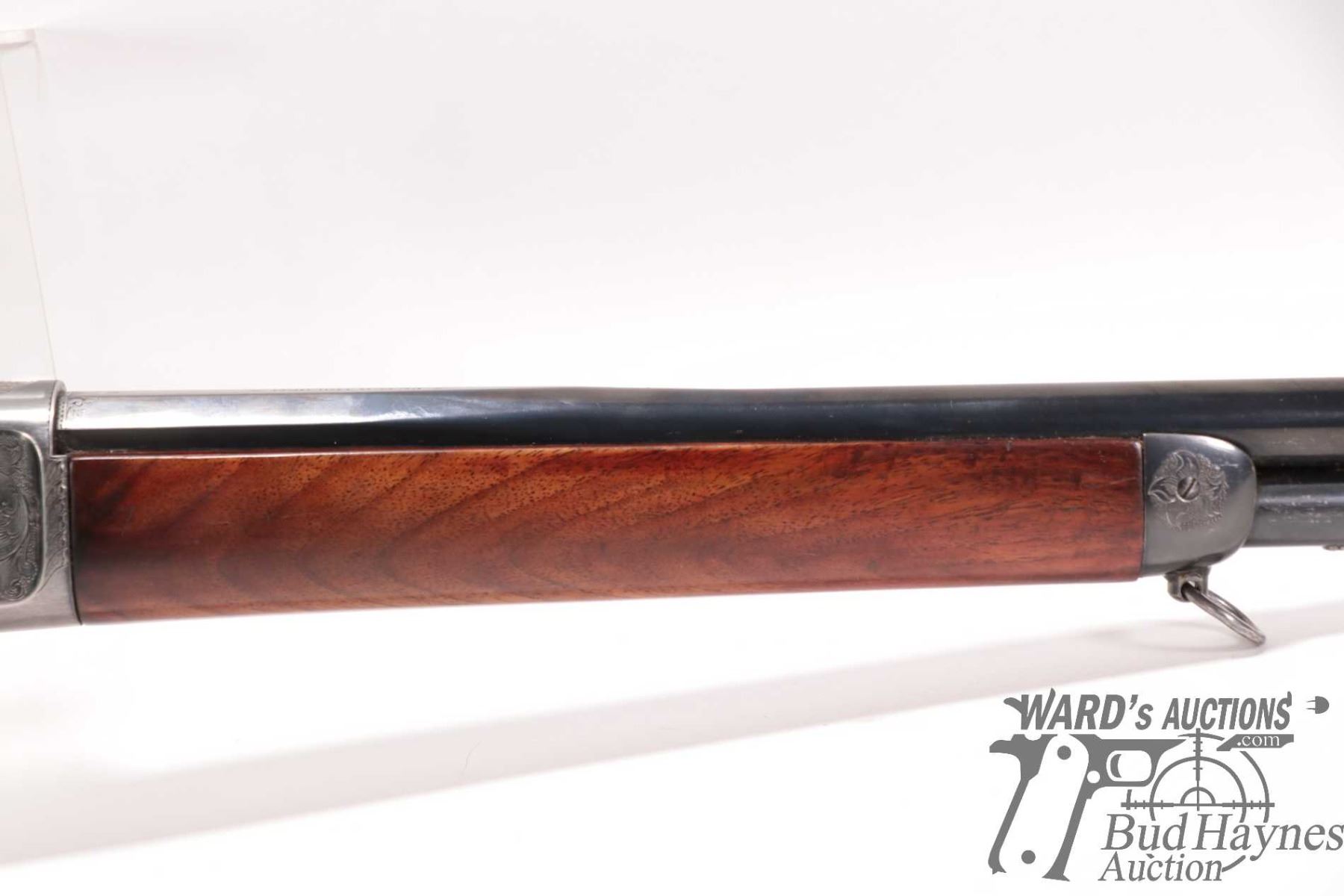 Non-Restricted rifle Browning model 1886 ( Peter Holden), .45-70 Govt. lever action, w/ bbl length 21 1/2" [Blued barrel and receiver. Fixed front sight. Original barrel mount rear sight removed and filled. Fitted with rear peep sight. Half length tubular magazine. Oversize hardwood stock with recoil pad. Beautifully custom hand engraving on receiver, lever, forend cap etc. and top of barrel marked "PETER HOLDEN', presumed to be owner who commissioned engraving. Mechanically appears near excellent. Bluing worn predominantly on receiver, which in contrast to the receiver shows wonderful patina.] serial # 04511PT197, PAL required