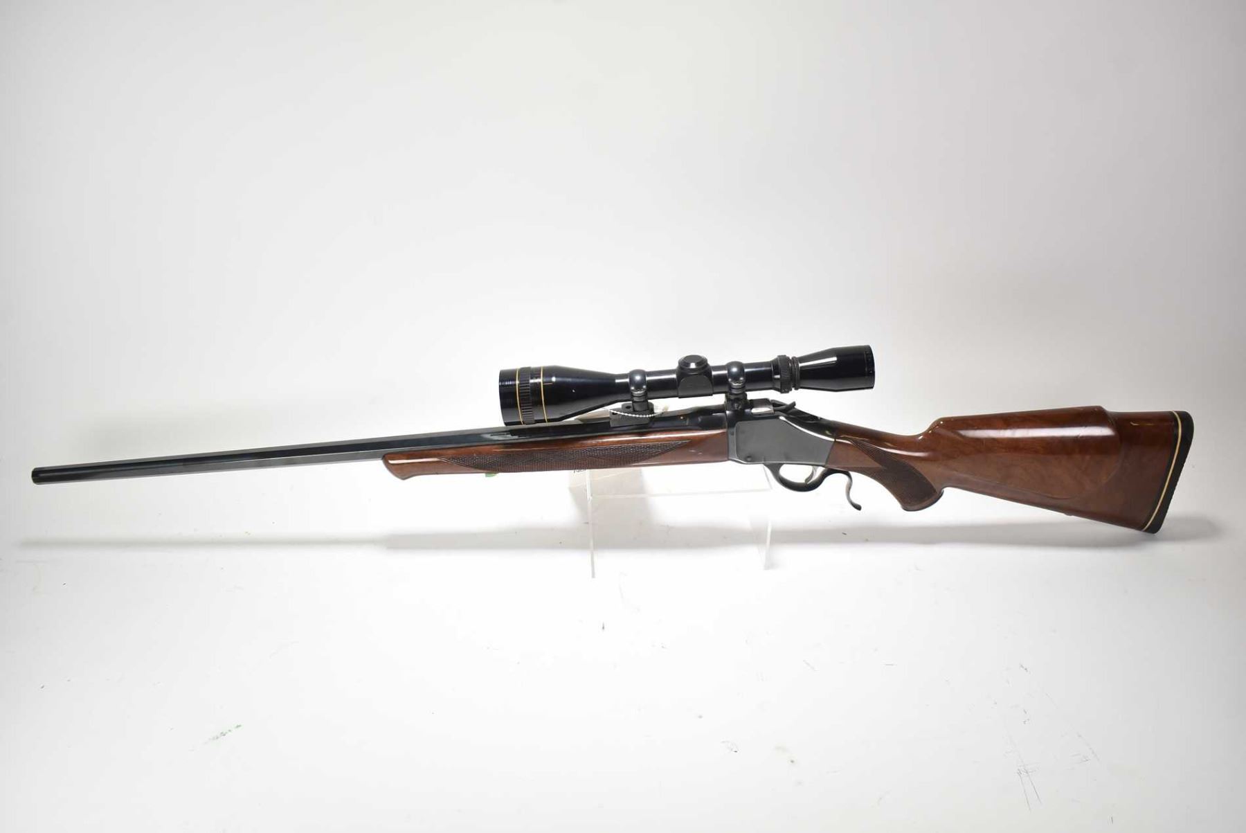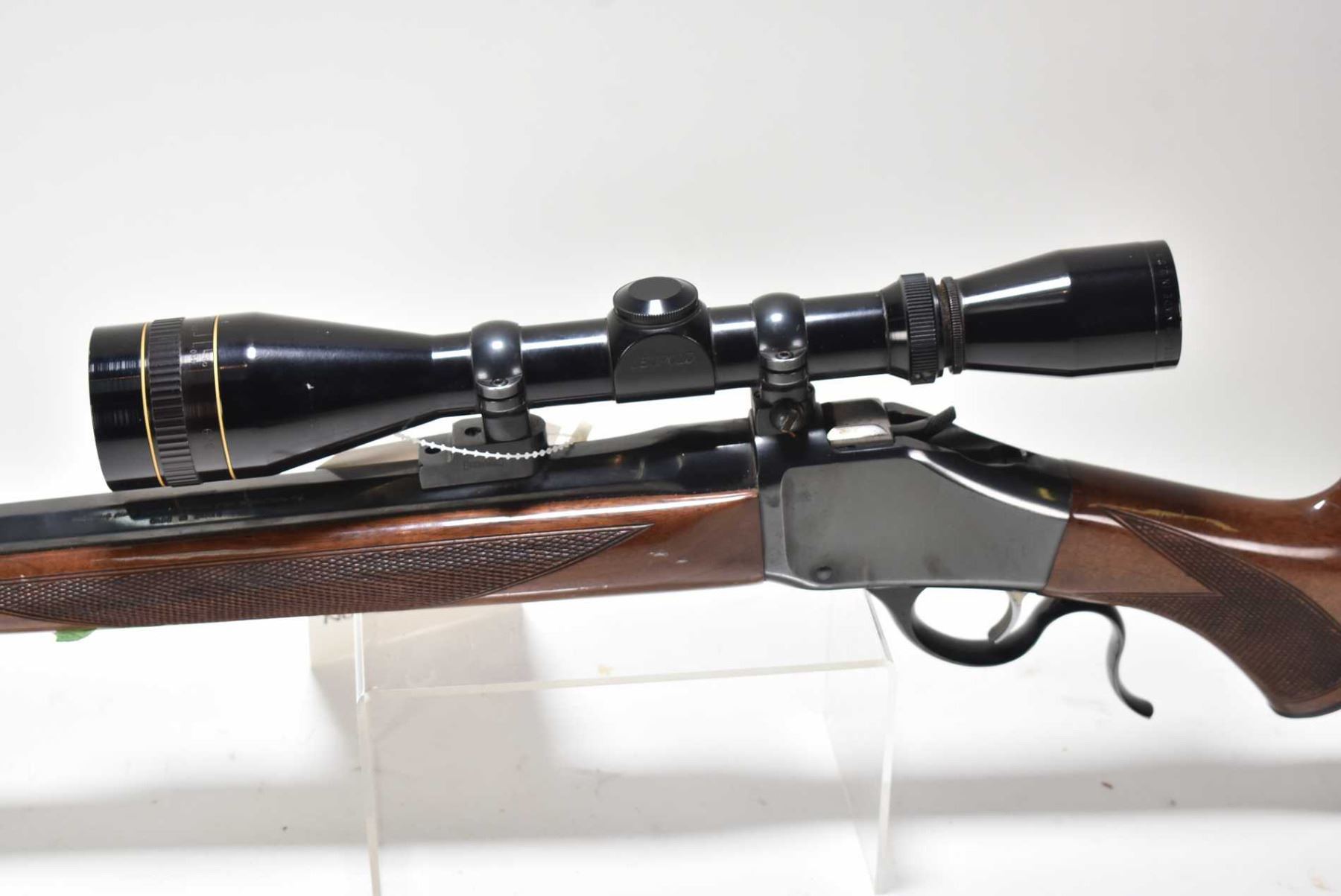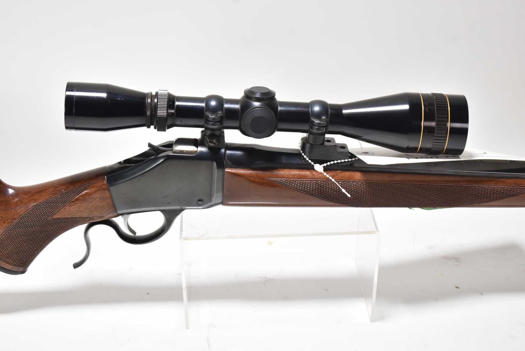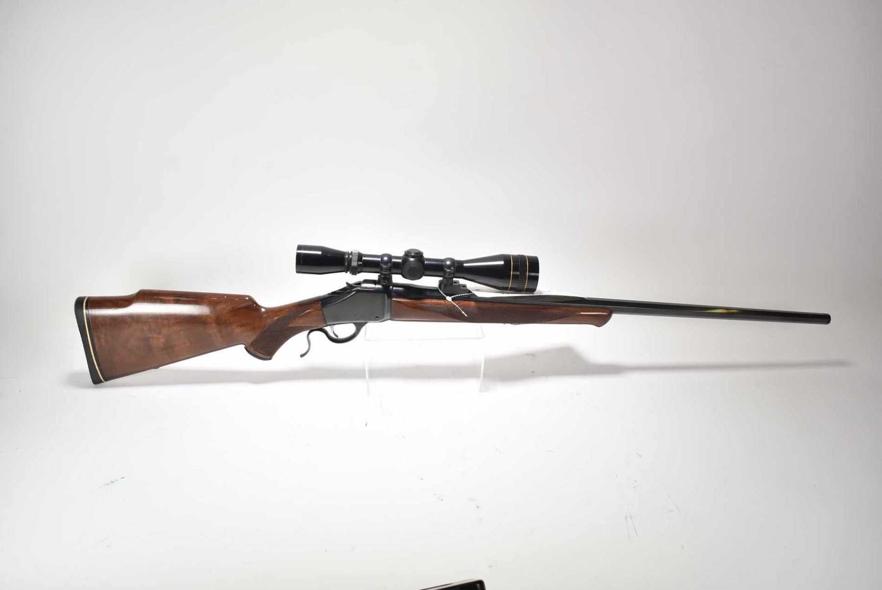 Non-Restricted rifle Browning model 78, 6mm Rem single shot falling block, w/ bbl length 26" [Blued octagonal barrel and receiver, no fixed sights, fitted with Leupold 3x9 scope SN K294401, wooden stock with checkered semi pistol grip and forend, Browning recoil pad. Appears to have had light use, marks on wood and metal more storage and handling related.] serial # 15037RT147, PAL required