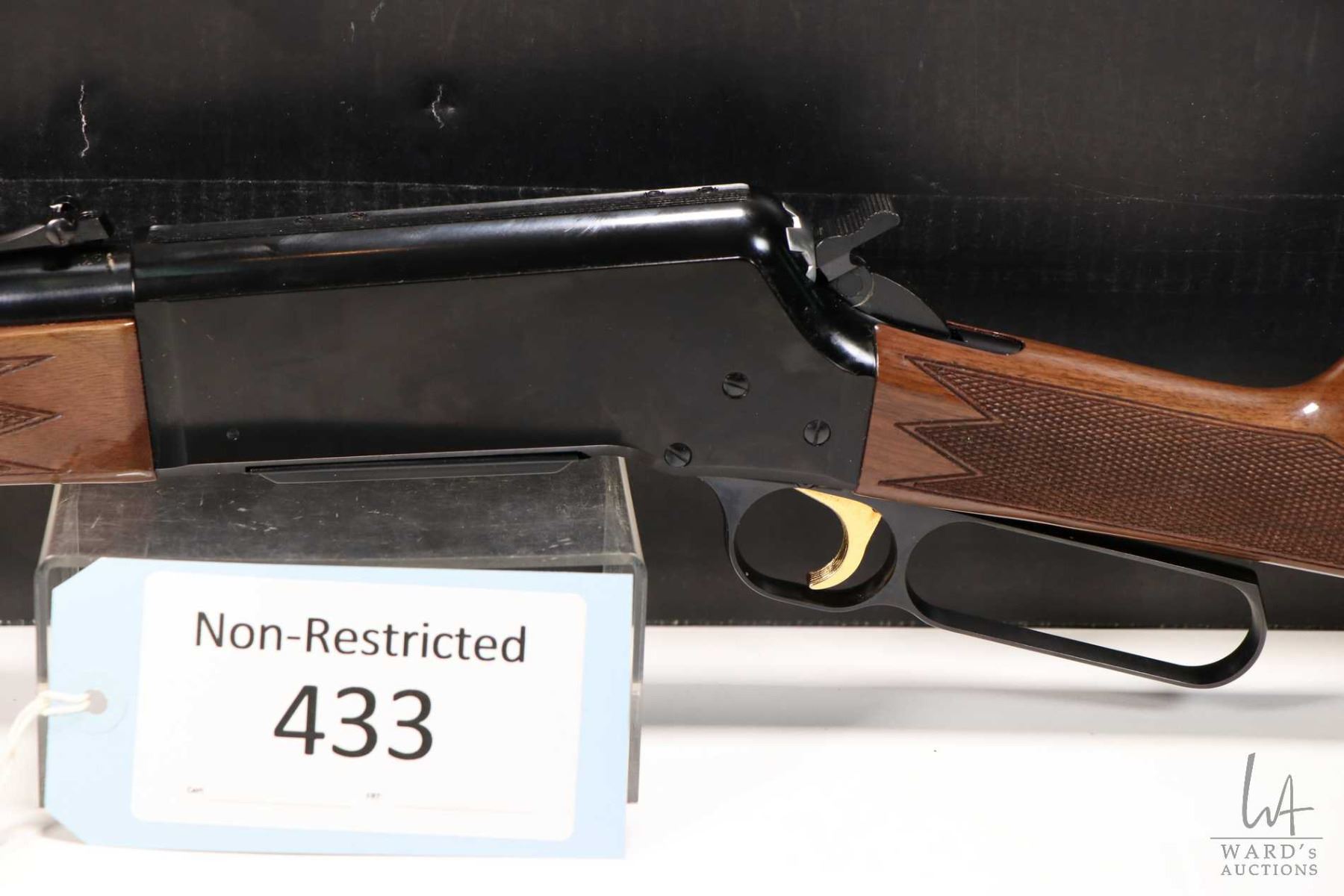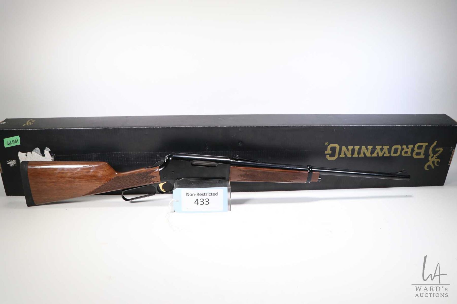 Non-Restricted rifle Browning model BLR LT WT 81, .358 Win lever action, w/ bbl length 20" [Blued barrel and receiver. Fixed front and adjustable rear sights. Tapped and threaded for optic mount. Original plugs included. Straight wooden stock with checkered strong and weak hand grips. Branded recoil pad. Gold toned trigger. Appears to be virtually unused with only slight, storage and handling marks. Includes original Browning box, owner's manual and pad lock.] serial # 06648MW341, PAL required