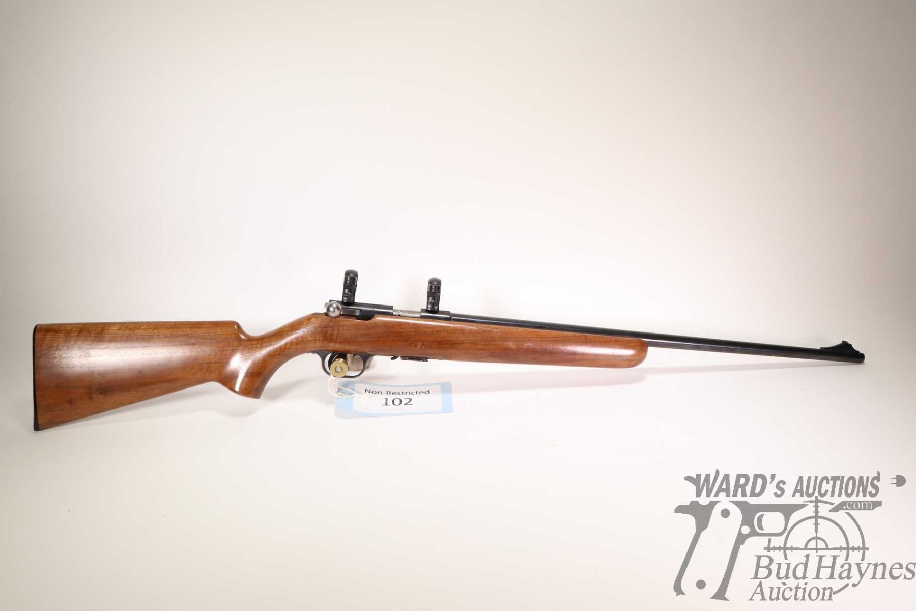 Non-Restricted rifle Browning model T-Bolt, 22LR five shot bolt action, w/ bbl length 22" [Blued barrel and receiver. Fixed front and no rear sight. Fitted with scope rings. Smooth wooden stock with branded plastic butt plate. Includes one detachable five round magazine. Action and trigger appear to function reasonably smoothly. Use, handling and storage marks on wood and metal.] serial # 29175X7, PAL required