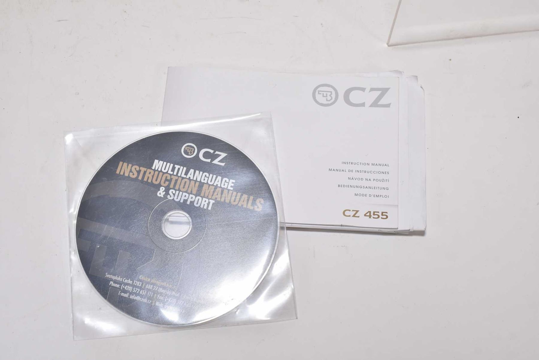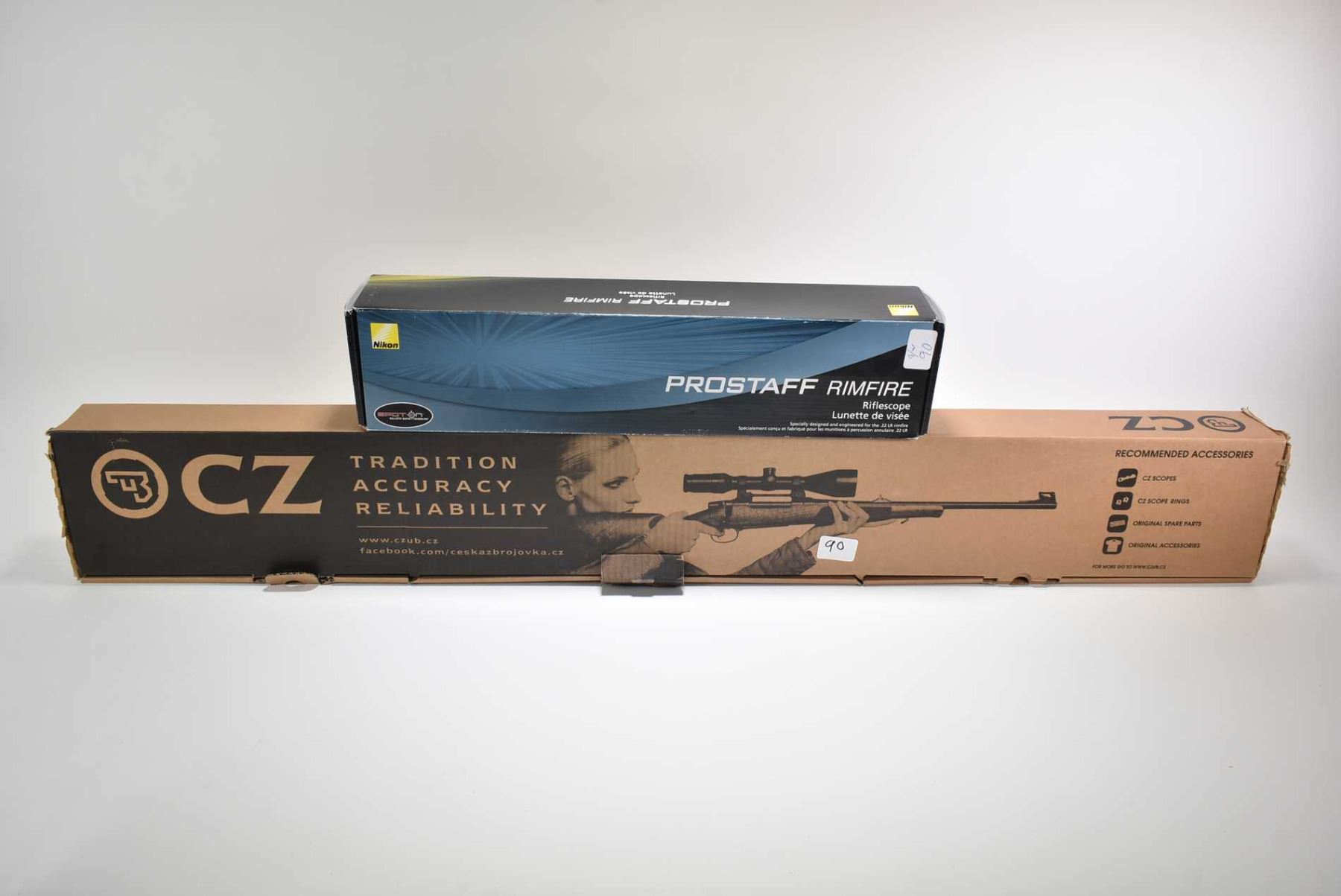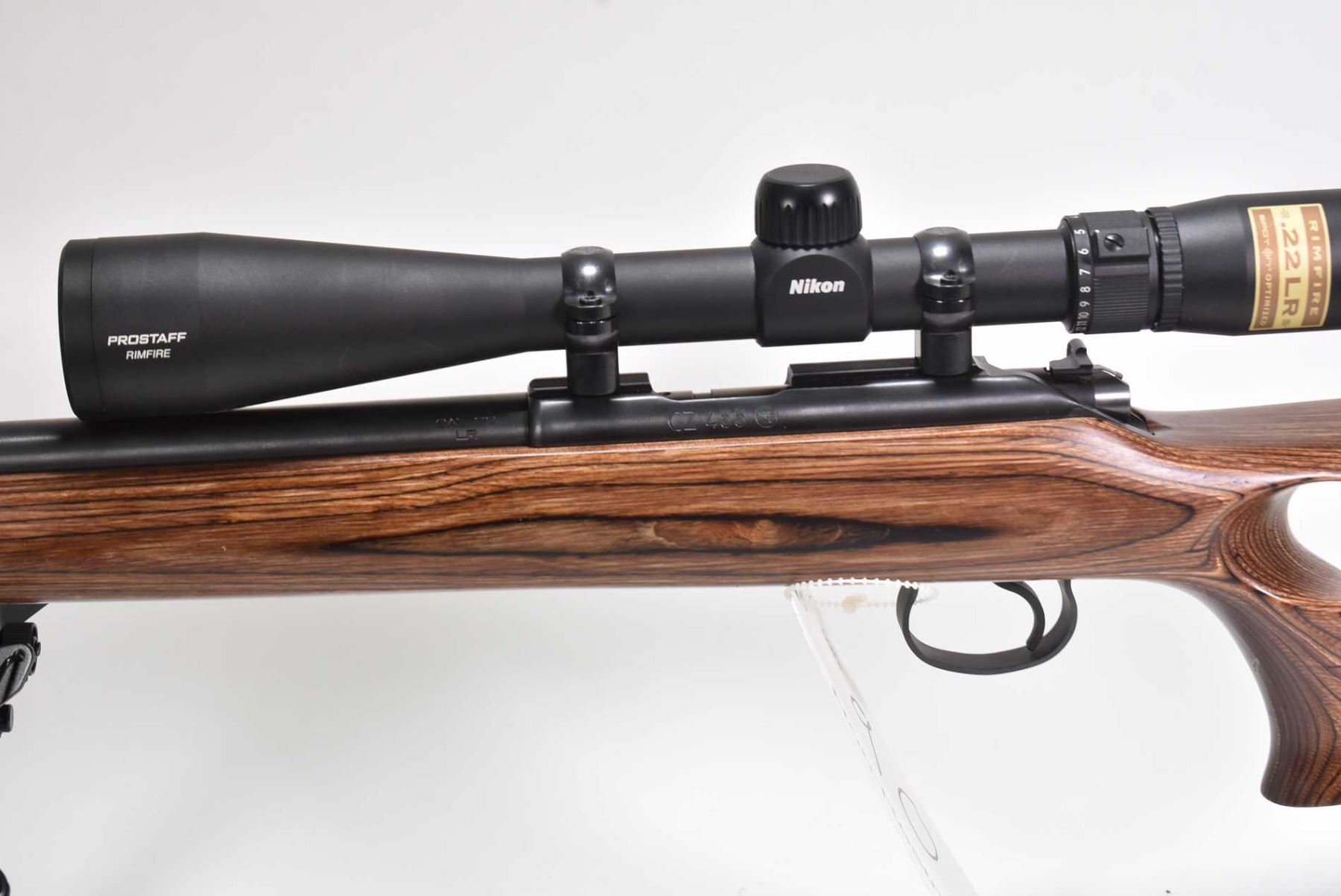 Non-Restricted rifle CZ model 455, .22 LR mag fed bolt action, w/ bbl length 20 1/2" [Heavy blued barrel and receiver, no fixed sights. Fitted with Nikon Prostaff Rimfire II 4-12 X 40mm, serial no. 3024133. Deluxe wooden stock with recoil pad. Fitted Caldwell folding bi-pod. Includes three detachable magazine and including one 25 round and original box. Appears to have had light us with minor use, handling and storage marks.] serial # C296093, PAL required