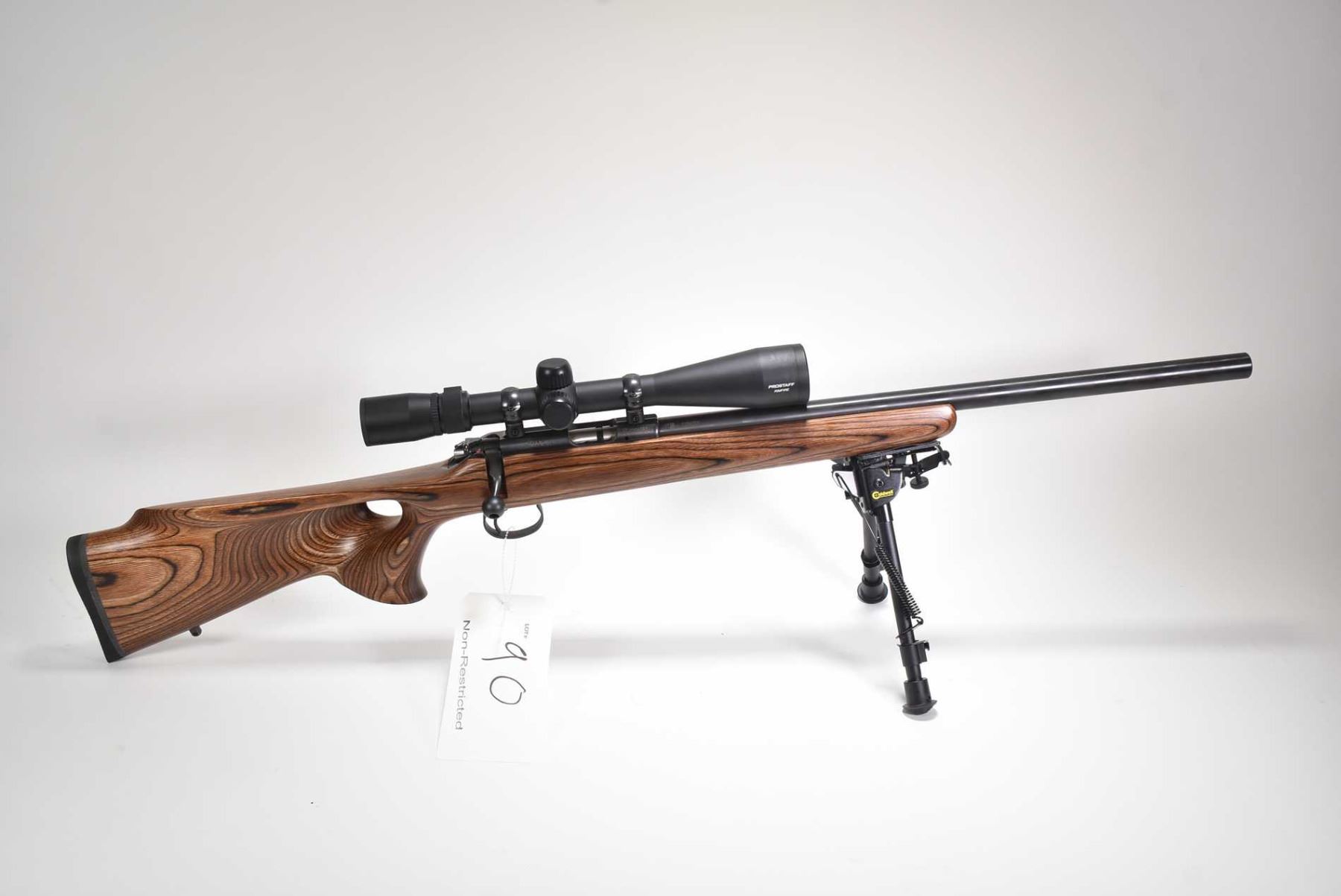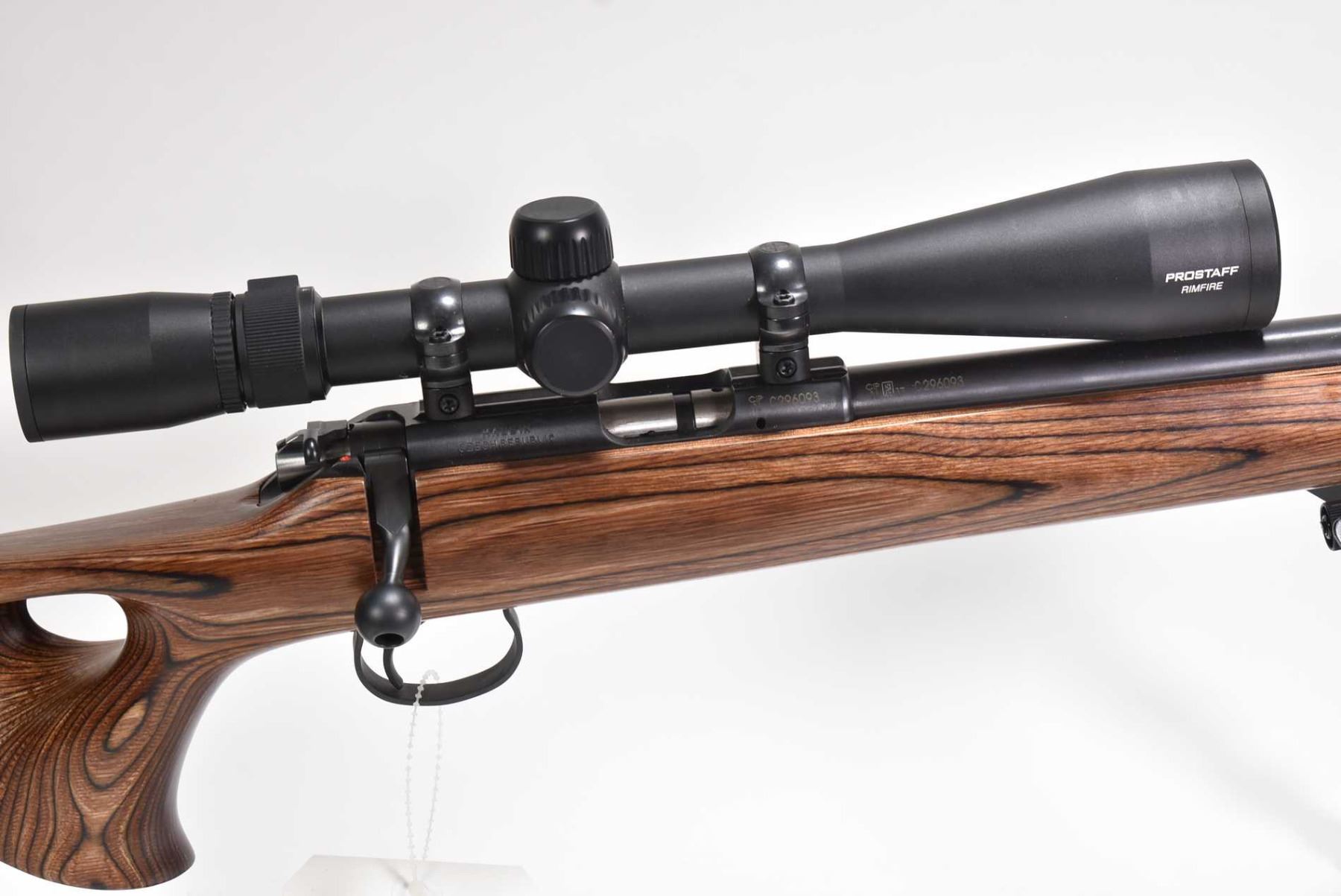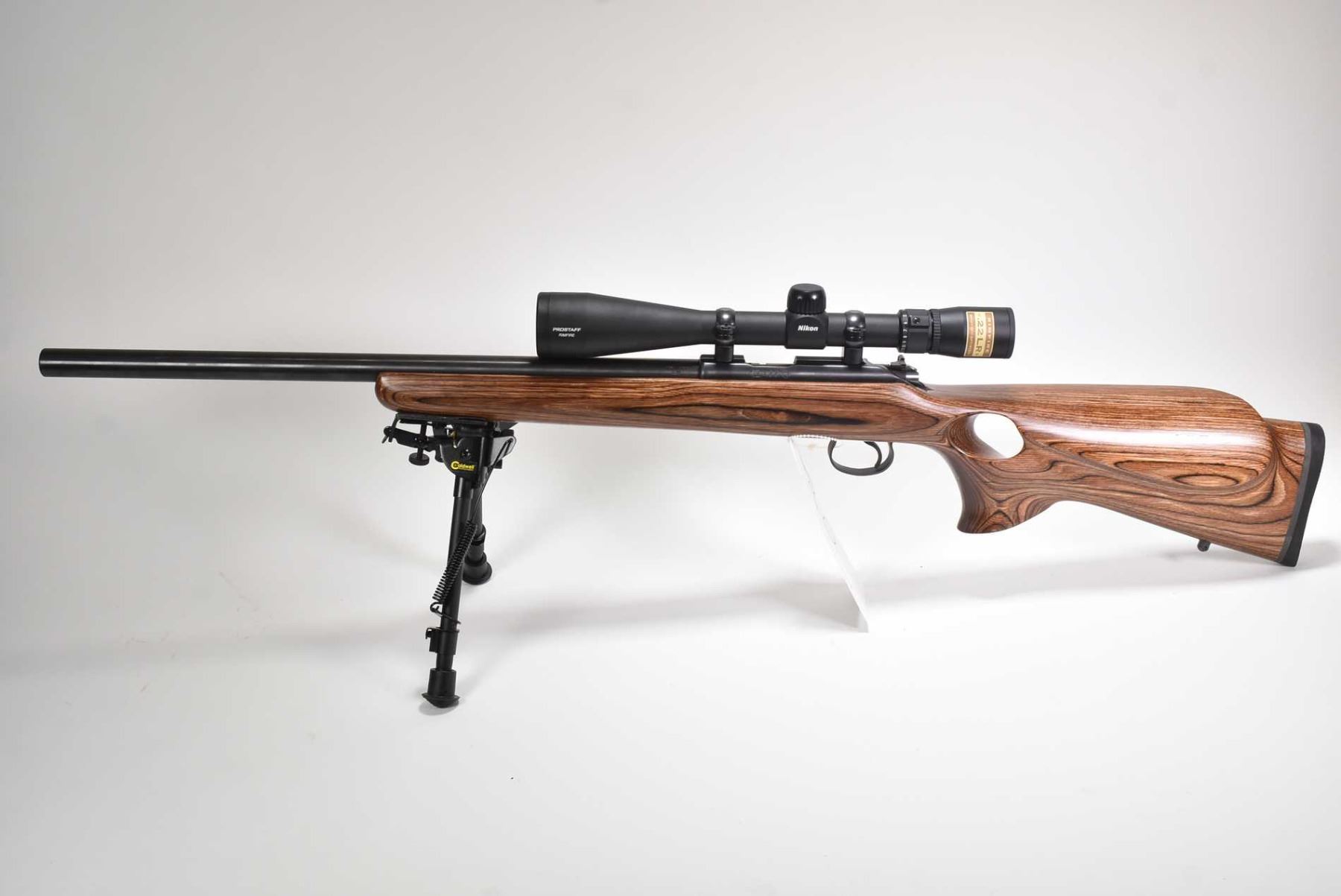 Non-Restricted rifle CZ model 455, .22 LR mag fed bolt action, w/ bbl length 20 1/2" [Heavy blued barrel and receiver, no fixed sights. Fitted with Nikon Prostaff Rimfire II 4-12 X 40mm, serial no. 3024133. Deluxe wooden stock with recoil pad. Fitted Caldwell folding bi-pod. Includes three detachable magazine and including one 25 round and original box. Appears to have had light us with minor use, handling and storage marks.] serial # C296093, PAL required