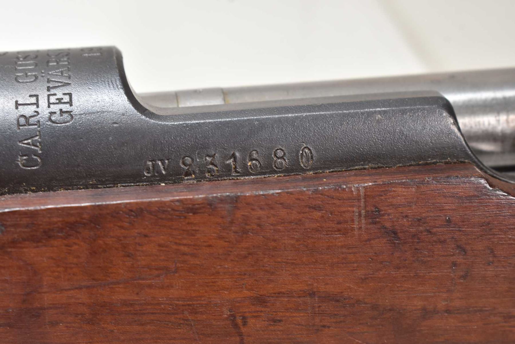 Non-Restricted rifle Carl Gustaf (1906) model 1896, 6.5X55 Swedish bolt action, w/ bbl length 29 1/2" [Blued barrel and receiver turning grey. Fixed front sight and elevation adjustable rear sight. Smooth wood stock with metal butt plate. Fitted with sling ring. Includes cleaning rod. Missing barrel cover. Appears to be all matching numbers. Smooth action, well used condition with marks and nicks to wood and metal. Storage, use and handling marks] serial # JV231680, PAL required
