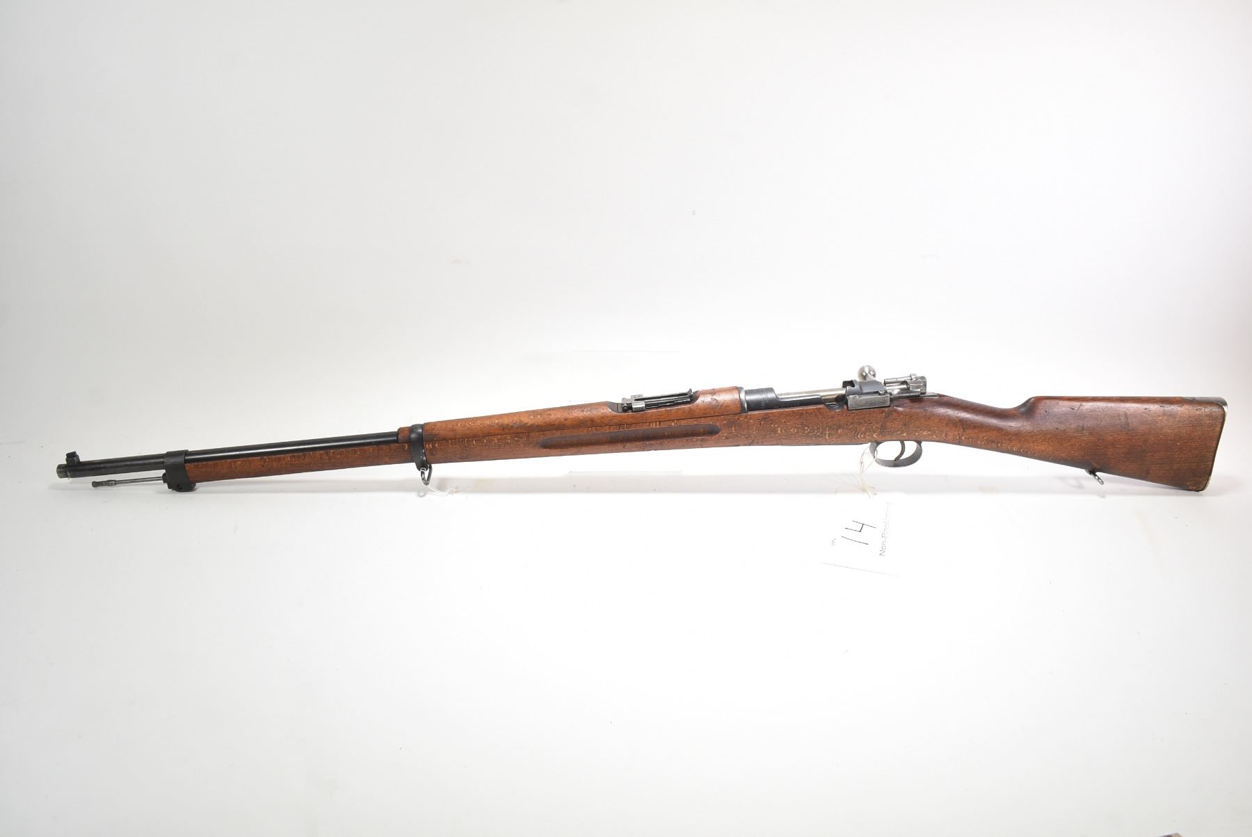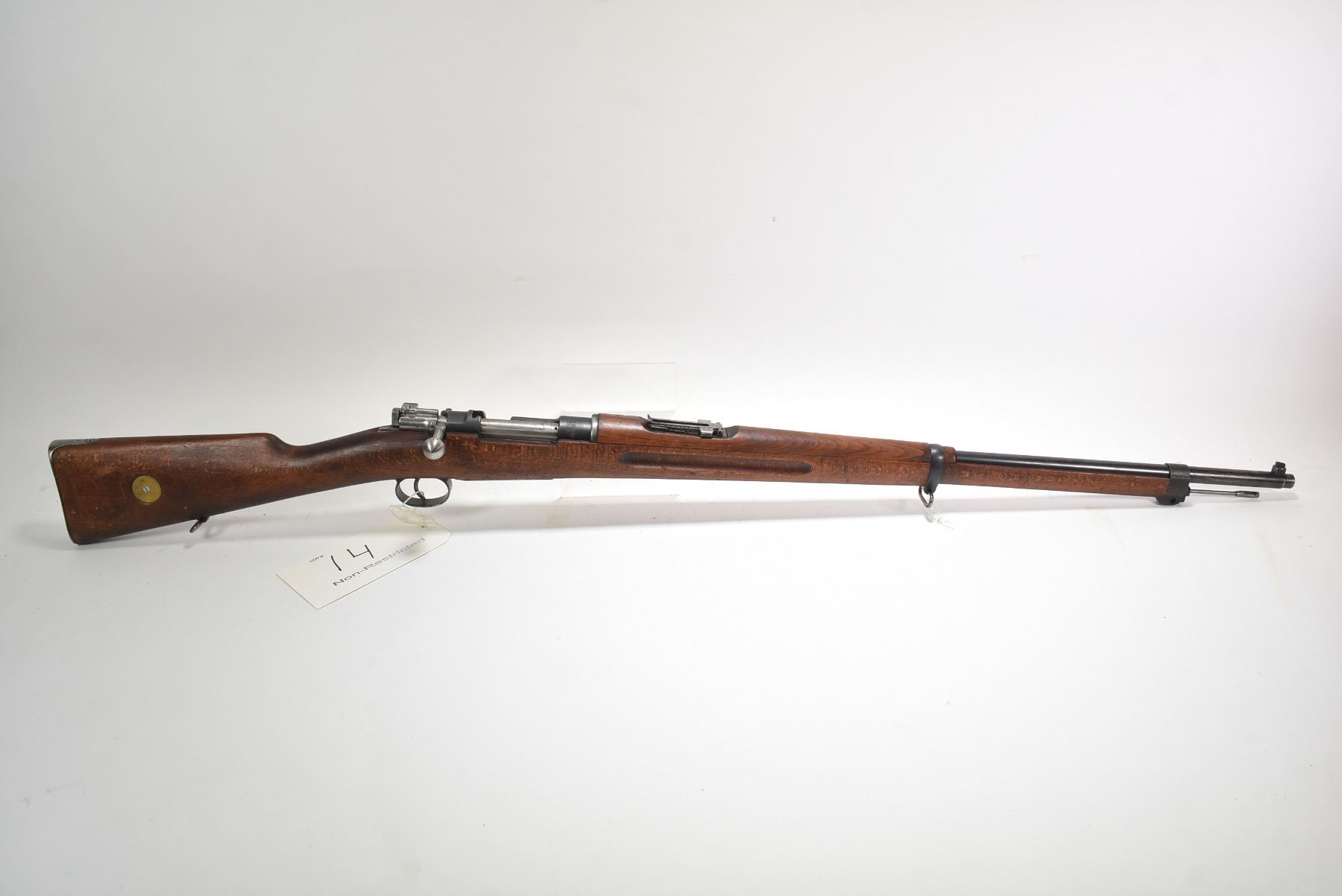 Non-Restricted rifle Carl Gustaf (1922) model M 96 Swedish Mauser, 6.5X55 bolt action, w/ bbl length 29 1/2" [Blued barrel and receiver. Fixed front and adjustable rear sights. Wooden stock with metal butt plate. Fitted with sling rings. Matching number mag base and bolt. Other markings include crown over top 194 on mid barrel ring, 046 under a crown on front ring and brass marking disc on right side of stock. Four small holes and evidence of a removed placard behind stock disc. Overall appears to be in above average condition with nicks, marks and scratches to metal and stock] serial # 501113, PAL required